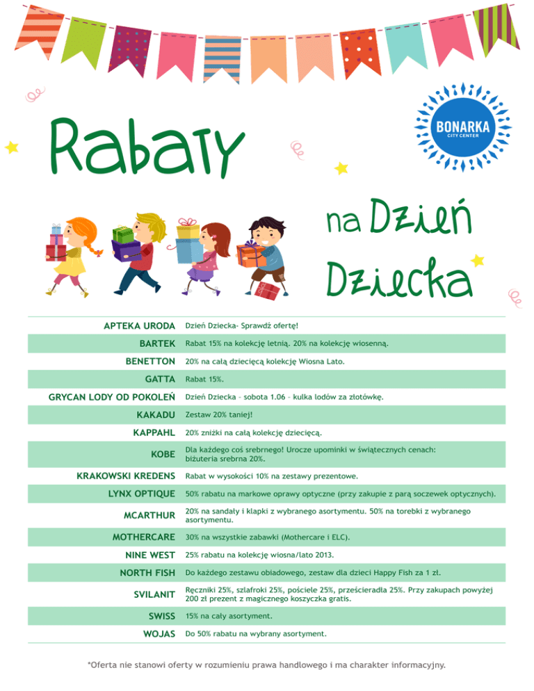 Rabaty na Dzien´ Dziecka APTEKA URODA BARTEK BENETTON GATTA GRYCAN LODY OD POKOLEŃ KAKADU KAPPAHL KOBE KRAKOWSKI KREDENS LYNX OPTIQUE MCARTHUR MOTHERCARE NINE WEST NORTH FISH SVILANIT SWISS WOJAS Dzień Dziecka- Sprawdź ofertę! Rabat 15% na kolekcję letnią. 20% na kolekcję wiosenną. 20% na całą dziecięcą kolekcję Wiosna Lato. Rabat 15%. Dzień Dziecka – sobota 1.06 – kulka lodów za złotówkę. Zestaw 20% taniej! 20% zniżki na całą kolekcję dziecięcą. Dla każdego coś srebrnego! Urocze upominki w świątecznych cenach: biżuteria srebrna 20%. Rabat w wysokości 10% na zestawy prezentowe. 50% rabatu na markowe oprawy optyczne (przy zakupie z parą soczewek optycznych). 20% na sandały i klapki z wybranego asortymentu. 50% na torebki z wybranego asortymentu. 30% na wszystkie zabawki (Mothercare i ELC). 25% rabatu na kolekcję wiosna/lato 2013. Do każdego zestawu obiadowego, zestaw dla dzieci Happy Fish za 1 zł. Ręczniki 25%, szlafroki 25%, pościele 25%, prześcieradła 25%. Przy zakupach powyżej 200 zł prezent z magicznego koszyczka gratis. 15% na cały asortyment. Do 50% rabatu na wybrany asortyment. *Oferta nie stanowi oferty w rozumieniu prawa handlowego i ma charakter informacyjny.