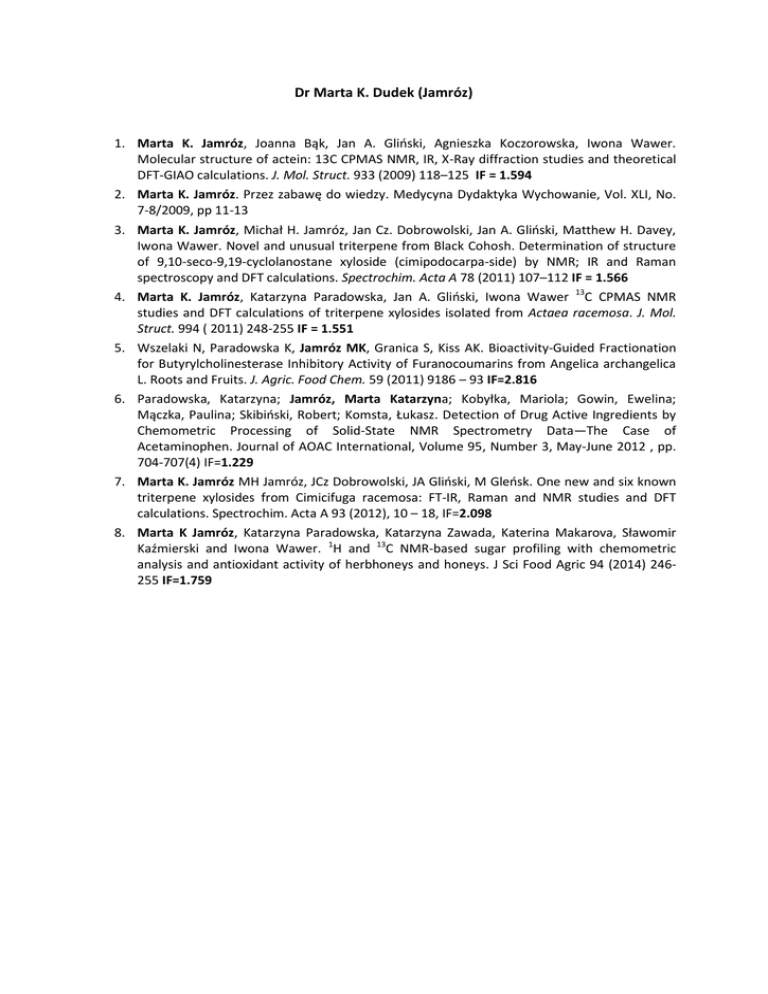 Dr Marta K. Dudek (Jamróz) 1. Marta K. Jamróz, Joanna Bąk, Jan A. Gliński, Agnieszka Koczorowska, Iwona Wawer. Molecular structure of actein: 13C CPMAS NMR, IR, X-Ray diffraction studies and theoretical DFT-GIAO calculations. J. Mol. Struct. 933 (2009) 118–125 IF = 1.594 2. Marta K. Jamróz. Przez zabawę do wiedzy. Medycyna Dydaktyka Wychowanie, Vol. XLI, No. 7-8/2009, pp 11-13 3. Marta K. Jamróz, Michał H. Jamróz, Jan Cz. Dobrowolski, Jan A. Gliński, Matthew H. Davey, Iwona Wawer. Novel and unusual triterpene from Black Cohosh. Determination of structure of 9,10-seco-9,19-cyclolanostane xyloside (cimipodocarpa-side) by NMR; IR and Raman spectroscopy and DFT calculations. Spectrochim. Acta A 78 (2011) 107–112 IF = 1.566 4. Marta K. Jamróz, Katarzyna Paradowska, Jan A. Gliński, Iwona Wawer 13C CPMAS NMR studies and DFT calculations of triterpene xylosides isolated from Actaea racemosa. J. Mol. Struct. 994 ( 2011) 248-255 IF = 1.551 5. Wszelaki N, Paradowska K, Jamróz MK, Granica S, Kiss AK. Bioactivity-Guided Fractionation for Butyrylcholinesterase Inhibitory Activity of Furanocoumarins from Angelica archangelica L. Roots and Fruits. J. Agric. Food Chem. 59 (2011) 9186 – 93 IF=2.816 6. Paradowska, Katarzyna; Jamróz, Marta Katarzyna; Kobyłka, Mariola; Gowin, Ewelina; Mączka, Paulina; Skibiński, Robert; Komsta, Łukasz. Detection of Drug Active Ingredients by Chemometric Processing of Solid-State NMR Spectrometry Data—The Case of Acetaminophen. Journal of AOAC International, Volume 95, Number 3, May-June 2012 , pp. 704-707(4) IF=1.229 7. Marta K. Jamróz MH Jamróz, JCz Dobrowolski, JA Gliński, M Gleńsk. One new and six known triterpene xylosides from Cimicifuga racemosa: FT-IR, Raman and NMR studies and DFT calculations. Spectrochim. Acta A 93 (2012), 10 – 18, IF=2.098 8. Marta K Jamróz, Katarzyna Paradowska, Katarzyna Zawada, Katerina Makarova, Sławomir Kaźmierski and Iwona Wawer. 1H and 13C NMR-based sugar profiling with chemometric analysis and antioxidant activity of herbhoneys and honeys. J Sci Food Agric 94 (2014) 246255 IF=1.759 Załącznik nr 2 – czynny udział w konferencjach naukowych 1. 27-28.10.2009 Poznań. Konferencja pt. „Spotkanie użytkowników Bruker Polska” Poster: „Badanie kinetyki polaryzacji skrośnej ksylozydu cimigenolu wyizolowanego z Cimicifuga racemosa” 2. 14.05.2010 Warszawa. Chemsession’10. Poster: 13C CPMAS NMR: kinetyka polaryzacji skrośnej czterech modelowych związków wyizolowanych z Actea racemosa. 3. 4-9.07.2010 - Joint EUROMAR 2010 and 17th ISMAR Conference: World Wide Magnetic Resonance 2010, Florencja, Włochy. Poster: “13C CPMAS NMR: CP kinetics of model compounds from Actea racemosa.” 4. 23-26.03.2011 Będlewo. Sesja naukowo – sprawozdawcza ICM. Poster: „Evaluation of NMR shielding constans calculations of triterpene glycosides” 5. 13.05.2011 Warszawa. Chemsession’11. Poster: „Dwa nowe, nietypowe związki wyizolowane z Cimicifuga racemosa – badania NMR” 6. 18-19.06.2011 Białystok. Konferencja pt. „Związki biologicznie czynne – aktywność, struktura, synteza”. Komuniakt ustny: „Struktura ksylozydów triterpenowych wyizolowanych z C. racemosa: badania NMR i modelowanie molekularne” 7. 21-25.08.2011 Frankfurt, Niemcy. EUROMAR 2011 joint with the 33rd Discussion Meeting of the MR Spectroscopy Division of the GDCh 8th European Federation of EPR Groups Meeting. Poster: “Metabolic profiling and antiradical activity of honeys and herbal honeys studied by NMR and EPR spectroscopy” 8. Marta K. Jamróz, Matthew H. Davey, Sławomir Kaźmierski, Witold Danikiewicz, Grzegorz Spólnik, Jan A. Gliński. International Congress on Natural Products Research 2012, Nowy Jork, Stany Zjednoczone, 28.07-03.08.2012. Poster: New A-type Trimeric and Tetrameric Procyanidins from Peanut Skins. Opublikowane w: Planta Medica 78 (2012) 1207-1207 9. Marta K. Jamróz, Jan A. Gliński, Sławomir Kaźmierski. Introduction to Gaussian: Theory and Practice, Wrocław, Polska, 24-28.06.2013. Poster: Occurence of conformational isomers in procyanidins trimers isolated from Cinnamoum. 10. Jan A. Gliński, Alan Wong, Peter Kinkade, Vitold B. Glinski, Sławomir Kaźmierski and Marta K. Jamróz*. Poster: Four A-type procyanidin trimers are main flavanol components of Cinnamomum burmanii. Annual Meeting of the American Society of Pharmacognosy, St. Louis, Missouri, USA, 13-17.07.2013 11. Marta K. Jamróz, Jan A. Gliński, Sławomir Kaźmierski Komunikat ustny: Występowanie izomerów rotacyjnych w trimerach procyjanidyn wyizolowanych z kory cynamonu. III Konferencja „Związki biologicznie czynne – aktywność, struktura, synteza” 4-6 października 2013, Białystok 12. Marta K. Dudek (Jamróz), Slawomir Kaźmierski, Kamil Stefaniak, Vitold B. Gliński, Jan. A. Gliński. Poster: Conformer equilibria in a-type procyanidins. VIIIth Symposium Nuclear Magnetic Resonance In Chemistry, Physics And Biological Sciences, Warsaw, 24-26 September 2014