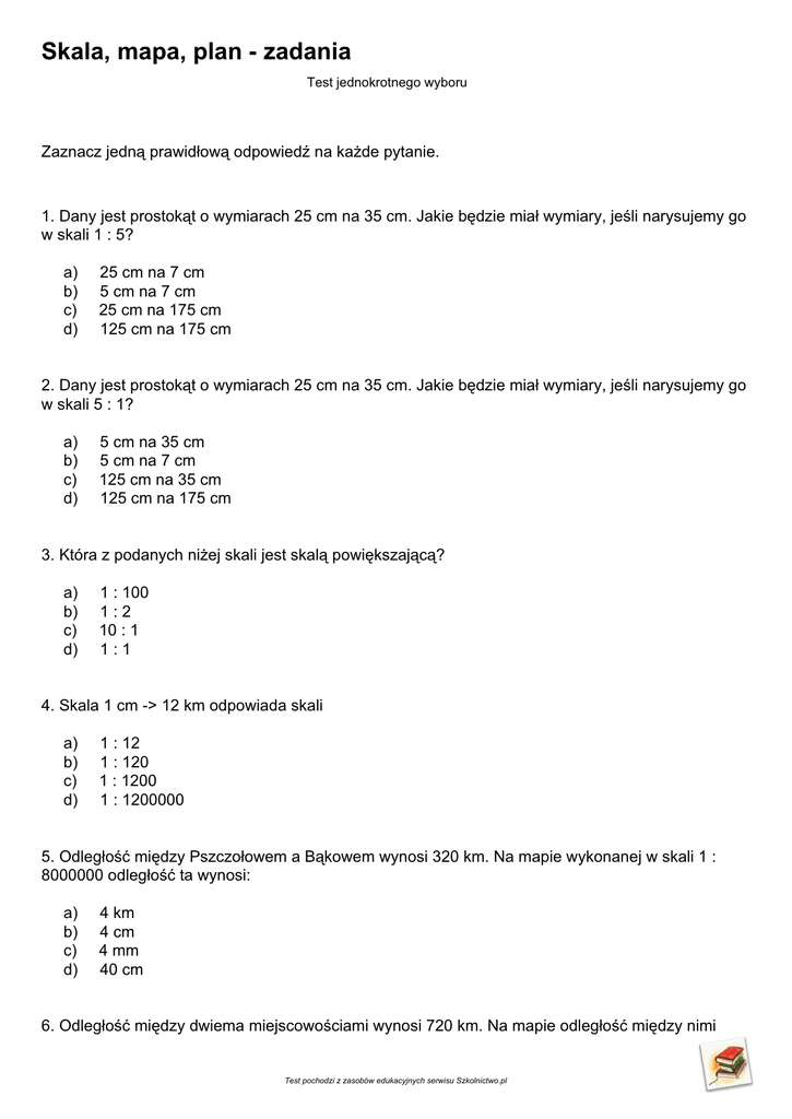 Skala, mapa, plan - zadania Test jednokrotnego wyboru Zaznacz jedną prawidłową odpowiedź na każde pytanie. 1. Dany jest prostokąt o wymiarach 25 cm na 35 cm. Jakie będzie miał wymiary, jeśli narysujemy go w skali 1 : 5? a) b) c) d) 25 cm na 7 cm 5 cm na 7 cm 25 cm na 175 cm 125 cm na 175 cm 2. Dany jest prostokąt o wymiarach 25 cm na 35 cm. Jakie będzie miał wymiary, jeśli narysujemy go w skali 5 : 1? a) b) c) d) 5 cm na 35 cm 5 cm na 7 cm 125 cm na 35 cm 125 cm na 175 cm 3. Która z podanych niżej skali jest skalą powiększającą? a) b) c) d) 1 : 100 1:2 10 : 1 1:1 4. Skala 1 cm -> 12 km odpowiada skali a) b) c) d) 1 : 12 1 : 120 1 : 1200 1 : 1200000 5. Odległość między Pszczołowem a Bąkowem wynosi 320 km. Na mapie wykonanej w skali 1 : 8000000 odległość ta wynosi: a) b) c) d) 4 km 4 cm 4 mm 40 cm 6. Odległość między dwiema miejscowościami wynosi 720 km. Na mapie odległość między nimi Test pochodzi z zasobów edukacyjnych serwisu Szkolnictwo.pl wynosi 9 cm. W jakiej skali wykonana jest ta mapa? a) b) c) d) 1 : 8000000 1 : 80 1 : 80000 1 : 800000 7. Odległość między Wilczkowem a Lisowem na mapie wykonanej w skali 1 : 2500000 wynosi 5 cm. Jaka jest rzeczywista odległość między tymi miejscowościami? a) b) c) d) 5 km 500 km 125 km 12,5 km 8. Odległość między Marchewkowem a Piertruszkowem na mapie o skali 1 : 20000000 wynosi 24 cm. Ile wynosi ta odległość na mapie o skali 1 : 40000000? a) b) c) d) 48 cm 12 cm 6 cm żadna z powyższych odpowiedzi nie jest prawidłowa 9. Plac o powierzchni 200 m2 na planie ma powierzchnię 50 cm2. W jakiej skali wykonano ten plan? a) b) c) d) 1:4 1 : 40000 1 : 20 1 : 200 10. Jezioro na mapie wykonanej w skali 1 : 600000 ma powierzchnię 18 cm2. Jaką powierzchnię zajmuje to jezioro w rzeczywistości? a) b) c) d) 108 km2 3 km2 648 km2 Ok. 25 km2 Test pochodzi z zasobów edukacyjnych serwisu Szkolnictwo.pl