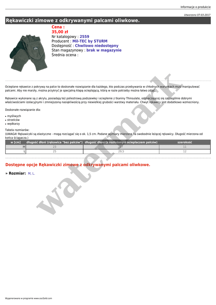 Informacje o produkcie Utworzono 07-03-2017 Rękawiczki zimowe z odkrywanymi palcami oliwkowe. Cena : 35,00 zł Nr katalogowy : 2559 Producent : Mil-TEC by STURM Dostępność : Chwilowo niedostępny Stan magazynowy : brak w magazynie Średnia ocena : er m ar k Ocieplane rękawice z pokrywą na palce to doskonałe rozwiązanie dla każdego, kto podczas przebywania w chłodnych warunkach musi manipulować palcami. Aby nie marzły, można przykryć je specjalną klapą ocieplającą, którą w razie potrzeby można łatwo zdjąć. Rękawice wykonane są z akrylu, posiadają też poliestrową podszewkę i ocieplenie z tkaniny Thinsulate, odznaczającej się szczególnie dobrymi właściwościami izolacyjnymi i zmniejszoną nasiąkliwością przy niewielkiej grubości warstwy materiału. Chwyt rękawicy jest dodatkowo wzmocniony. Doskonałe rozwiązanie dla: ● ● ● myśliwych strzelców wędkarzy Tabela rozmiarów: (UWAGA! Rękawiczki są elastyczne - mogą rozciągać się o ok. 1,5 cm. Podane wymiary mierzone na swobodnie leżącej rękawicy. Długość mierzona od końca ściągacza.) w [cm] długość dłoni (rękawica "bez palców") długość dłoni (z rozłożonym ocieplaczem palców) M 23 L 25 27 11 29,5 12 Dostępne opcje Rękawiczki zimowe z odkrywanymi palcami oliwkowe. w at » Rozmiar: M, L. Wygenerowano w programie www.oscGold.com szerokość