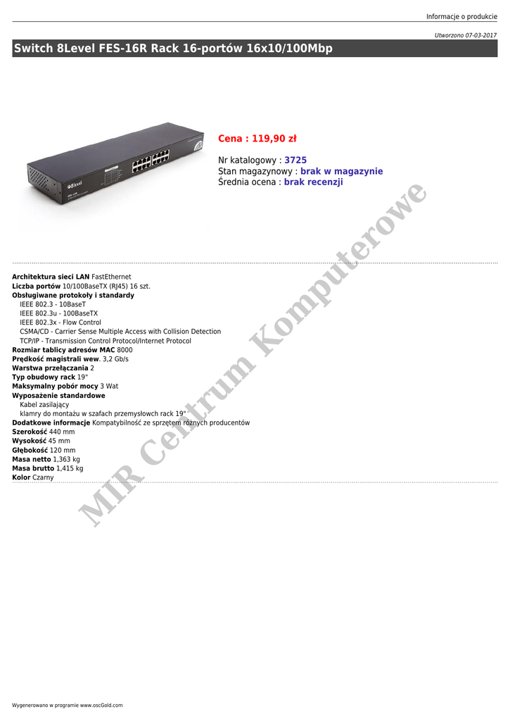 Informacje o produkcie Utworzono 07-03-2017 Switch 8Level FES-16R Rack 16-portów 16x10/100Mbp Cena : 119,90 zł M IR C en tr um K Architektura sieci LAN FastEthernet Liczba portów 10/100BaseTX (RJ45) 16 szt. Obsługiwane protokoły i standardy IEEE 802.3 - 10BaseT IEEE 802.3u - 100BaseTX IEEE 802.3x - Flow Control CSMA/CD - Carrier Sense Multiple Access with Collision Detection TCP/IP - Transmission Control Protocol/Internet Protocol Rozmiar tablicy adresów MAC 8000 Prędkość magistrali wew. 3,2 Gb/s Warstwa przełączania 2 Typ obudowy rack 19" Maksymalny pobór mocy 3 Wat Wyposażenie standardowe Kabel zasilający klamry do montażu w szafach przemysłowch rack 19" Dodatkowe informacje Kompatybilność ze sprzętem różnych producentów Szerokość 440 mm Wysokość 45 mm Głębokość 120 mm Masa netto 1,363 kg Masa brutto 1,415 kg Kolor Czarny om pu te r ow e Nr katalogowy : 3725 Stan magazynowy : brak w magazynie Średnia ocena : brak recenzji Wygenerowano w programie www.oscGold.com