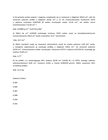 1) Ile gramów jonów wapnia i magnezu znajdowało się w roztworze o objętości 500,0 cm3, jeśli do oznaczeń pobrano próbki o objętości 20,00 cm3 a na ich zmiareczkowanie roztworem EDTA o stężeniu molowym 0,002500 M wobec mureksydu zużyto 15,50 cm3, zaś wobec czerni eriochromowej T 25,50 cm3 ? Odp. 0,03883 g Ca2+; 0,01519 g Mg2+ 2) Oblicz ile cm3 0,02500 molowego roztworu EDTA należy zużyć na kompleksometryczne zmiareczkowanie 100,0 cm3 wody o twardości 15,0 o niemieckich. Odp. 10,7 cm3 3) Oblicz twardość wody (w stopniach niemieckich), jeżeli do analizy pobrano 2,00 dm3 wody, a następnie odparowano ją uzyskując próbkę o objętości 100,0 cm3. Do oznaczeń pobrano 20,00 cm3 miareczkowano wobec mureksydu, roztworem EDTA o stężeniu 0,01250 M, zużywając go średnio 15,80 cm3. Odp. 2,77o 4) Do próbki r-ru zawierającego AlCl3 dodano 20,00 cm3 0,0100 M r-ru EDTA, którego nadmiar odmiareczkowano 8,00 cm3 roztworu ZnSO4 o mianie 0,002018 g/cm3. Oblicz zawartość AlCl3 w badanej próbce. Odp. 13,3 mg Zadania Z.Galus: 9.283 9.284 9.287 9.288 9.290 9.293
