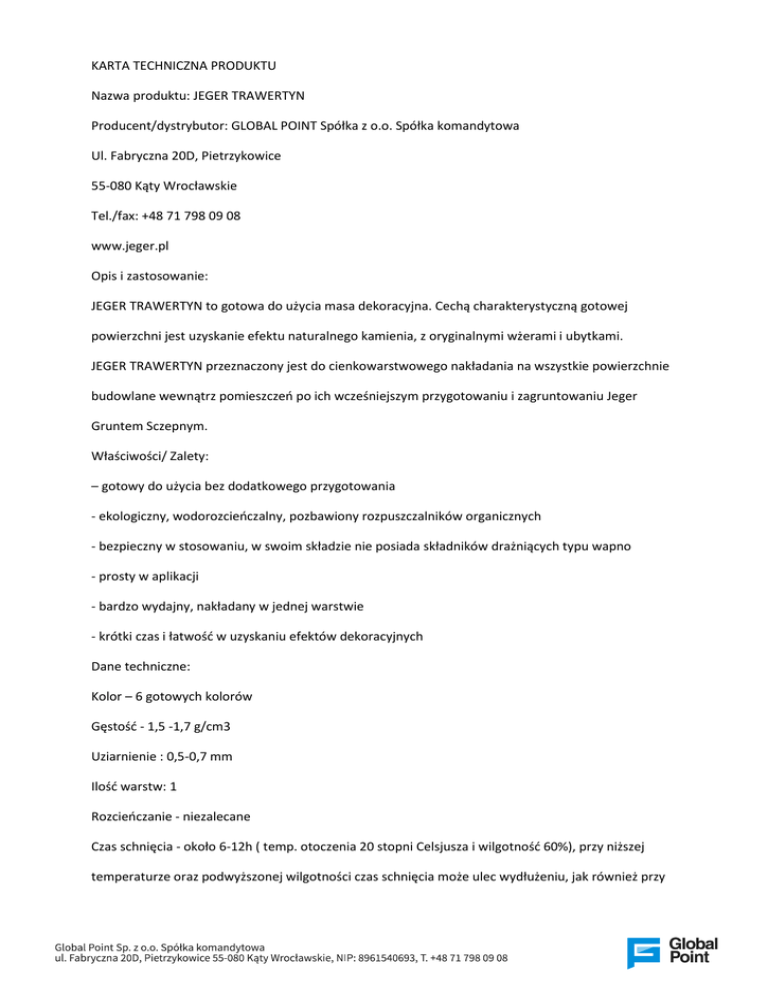 KARTA TECHNICZNA PRODUKTU Nazwa produktu: JEGER TRAWERTYN Producent/dystrybutor: GLOBAL POINT Spółka z o.o. Spółka komandytowa Ul. Fabryczna 20D, Pietrzykowice 55-080 Kąty Wrocławskie Tel./fax: +48 71 798 09 08 www.jeger.pl Opis i zastosowanie: JEGER TRAWERTYN to gotowa do użycia masa dekoracyjna. Cechą charakterystyczną gotowej powierzchni jest uzyskanie efektu naturalnego kamienia, z oryginalnymi wżerami i ubytkami. JEGER TRAWERTYN przeznaczony jest do cienkowarstwowego nakładania na wszystkie powierzchnie budowlane wewnątrz pomieszczeń po ich wcześniejszym przygotowaniu i zagruntowaniu Jeger Gruntem Sczepnym. Właściwości/ Zalety: – gotowy do użycia bez dodatkowego przygotowania - ekologiczny, wodorozcieńczalny, pozbawiony rozpuszczalników organicznych - bezpieczny w stosowaniu, w swoim składzie nie posiada składników drażniących typu wapno - prosty w aplikacji - bardzo wydajny, nakładany w jednej warstwie - krótki czas i łatwość w uzyskaniu efektów dekoracyjnych Dane techniczne: Kolor – 6 gotowych kolorów Gęstość - 1,5 -1,7 g/cm3 Uziarnienie : 0,5-0,7 mm Ilość warstw: 1 Rozcieńczanie - niezalecane Czas schnięcia - około 6-12h ( temp. otoczenia 20 stopni Celsjusza i wilgotność 60%), przy niższej temperaturze oraz podwyższonej wilgotności czas schnięcia może ulec wydłużeniu, jak również przy grubszej warstwie produktu. Wydajność - 1,2-1,5 kg /m2 Nakładać w temperaturze od +5 ⁰C do +25 ⁰C – przy niższej temperaturze oraz podwyższonej wilgotności czas schnięcia może ulec wydłużeniu. Sposób użycia: Przygotowanie podłoża : JEGER BETON wymaga podłoża mocno związanego, gładkiego, suchego, oczyszczonego ze starych powłok malarskich, bez spękań, wolnego od kurzu i tłustych plam. Przed nałożeniem JEGER BETON zaleca się pomalowanie powierzchni produktem JEGER GRUNT SCZEPNY DO BETONU, który zabezpieczy podłoże i stworzy odpowiednią strukturę zapewniającą właściwy efekt końcowy przy jednej warstwie Betonu. Po upływie ok. 2-4 godzin od nałożenia gruntu można przystąpić do nakładania warstwy Betonu. Przygotowanie produktu i aplikacja: JEGER TRAWERTYN wymaga podłoża mocno związanego, gładkiego, suchego, oczyszczonego ze starych powłok malarskich, bez spękań, wolnego od kurzu i tłustych plam. Przed nałożeniem JEGER TRAWERTYN zaleca się zagruntowanie powierzchni produktem JEGER GRUNT SCZEPNY, który zabezpieczy podłoże i nada mu jednolity biały odcień. W przypadku wystąpienia jakichkolwiek widocznych przebarwień po zastosowaniu gruntu i przeschnięciu (około: 2-4h), należy czynność gruntowania powtórzyć. Zastosowany JEGER GRUNT SCZEPNY stworzy na dekorowanej powierzchni odpowiednią strukturę, zapewniającą właściwy efekt końcowy przy jednej warstwie Trawertynu. JEGER TRAWERTYN w opakowaniu fabrycznym jest produktem gotowym do użycia. Końcowy efekt dekoracyjny uzyskuje się przez zastosowanie produktów: JEGER LAKIER ZABEZPIECZAJĄCY i JEGER WERNIKS Upewnić się czy posiadamy wystarczającą ilość produktu (patrz wydajność). W przypadku konieczności użycia więcej niż jednego opakowania wymieszaj razem zawartość wszystkich opakowań. Produkt należy nakładać pacą ze stali nierdzewnej na grubość ziarna (ok. 0,7 – 1 mm) i wygładzić. Należy pamiętać że nakładana warstwa powinna mieć taką grubość aby w czasie nakładania zawarte w produkcie kruszywo nie powodowało rys na dekorowanej powierzchni. Po nałożeniu warstwy JEGER TRAWERTYN, w fazie jego przesychania krawędzią pacy lub szpachelką wykonujemy nieregularne wżery i ubytki, pionowe lub poziome w zależności od pomysłu i inwencji wykonawcy. Wżery można wykonać również za pomocą wałka malarskiego z długim włosiem Po wykonaniu wżerów powierzchnię Trawertynu należy wygładzić delikatnie pacą, dobierając tak siłę nacisku aby nie spowodować zabarwienia od pacy oraz by powierzchnia była jak najbardziej gładka. W przypadku uzyskania niezadowalającego efektu czynności można powtórzyć wygładzając świeżą masę i ponownie ją modelując lub po przeschnięciu, nakładając drugą warstwę JEGER TRAWERTYN i powtarzając wcześniej opisane czynności. Lakierowanie i dekorowanie powierzchni: Po całkowitym wyschnięciu warstwy Trawertynu (ok. 6-12h) możemy przystąpić do lakierowania wstępnego używając JEGER LAKIER ZABEZPIECZAJĄCY. Lakier nakładamy bardzo starannie pędzlem lub wałkiem na całą powierzchnię Trawertynu. Zaleca się dwukrotne lakierowanie powierzchni. Po upewnieniu się, że cała powierzchnia jest dobrze zalakierowana i całkowicie wyschnięta (czas schnięcia przy temp. +20°C i wilgotności względnej powietrza 60% wynosi ok. 2-3h) możemy przystąpić do wybarwiania wżerów. W tym celu stosujemy JEGER WERNIKS DO WYBARWIANIA WŻERÓW W TRAWERTYNIE. WERNIKS aplikujemy miejscowo we wżery np. przy pomocy pędzla lub gąbki na powierzchnię ok. 0,5-1m2 i od razu przed jego wyschnięciem rozpoczynamy zmywanie nadmiaru Werniksu z gładkiej powierzchni, pozostawiając go tylko we wżerach. Najlepiej wykonać tą czynność mokrą gąbką, którą należy często płukać w wodzie. Następnie przetrzeć i osuszyć powierzchnię białym ręcznikiem papierowym lub ścierką. W ten sposób nadamy dekorowanej powierzchni odpowiedniego charakteru. Uzyskane efekty zależą od zastosowanej techniki i metody aplikacji. Narzędzia: - paca ze stali nierdzewnej, szpachelka. Po zakończonej pracy narzędzia umyć ciepłą wodą. Dodatkowe informacje: Produkt chronić przed nasłonecznieniem i przemrożeniem Przechowywać w szczelnie zamkniętych opakowaniach, w temperaturze +5 C do + 25 C. W trakcie pracy i po zakończeniu pomieszczenia wietrzyć do zaniku zapachu W przypadku niedostatecznej wentylacji należy zastosować indywidualne środki ochrony dróg oddechowych W razie połknięcia niezwłocznie zasięgnąć porady lekarza, pokazać mu opakowanie lub etyk