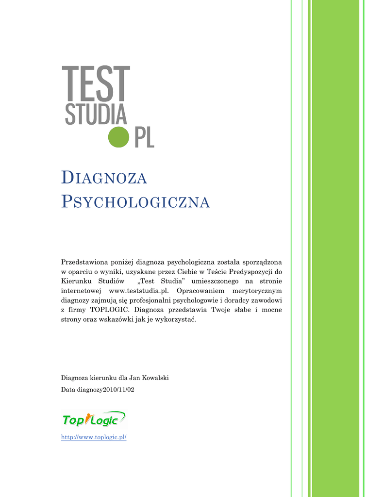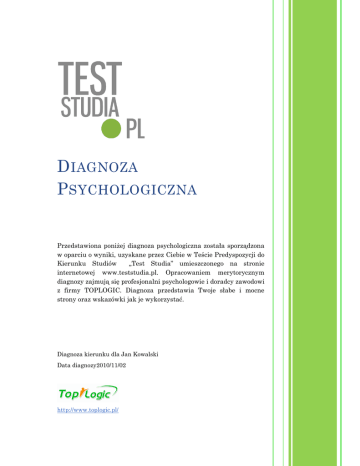 D IAGNOZA P SYCHOLOGICZNA Przedstawiona poniżej diagnoza psychologiczna została sporządzona w oparciu o wyniki, uzyskane przez Ciebie w Teście Predyspozycji do Kierunku Studiów „Test Studia” umieszczonego na stronie internetowej www.teststudia.pl. Opracowaniem merytorycznym diagnozy zajmują się profesjonalni psychologowie i doradcy zawodowi z firmy TOPLOGIC. Diagnoza przedstawia Twoje słabe i mocne strony oraz wskazówki jak je wykorzystać. Diagnoza kierunku dla Jan Kowalski Data diagnozy2010/11/02 http://www.toplogic.pl/ Diagnoza kierunku dla Jan Kowalski 2010/11/02 OPIS FUNKCJONOWANIA I MOCNE STRONY Jesteś osobą umiejętnie łączącą zdolności społeczne z wysoko rozwiniętymi predyspozycjami intelektualnymi. Czujesz się świetnie przebywając wśród ludzi, zwłaszcza, gdy możesz wykorzystać swoją potrzebę pełnienia znaczących funkcji, kontrolowania działań innych, bycia liderem projektu czy też zarządzającym zespołem. Chętnie dzielisz się swoją wiedzą i sprawnie koordynujesz działania innych. Takie współwystępowanie cech, wraz z zainteresowaniami technicznymi może otworzyć Ci drogę do kariery, z której będziesz czerpał nie tylko znaczne profity finansowe, ale i ogromną satysfakcję. Twój profil osobowości oraz uzdolnienia i zainteresowania predysponują Cię do studiowania kierunków zarówno technicznych jak i związanych z organizacją i zarządzaniem. Jesteś komunikatywny, jasno wyrażający swoje stanowisko i nastawiony na współpracę a nie konkurowanie. Widzisz siebie ponadto nie tylko jako skrupulatnego wykonawcę, ale także jako pomysłodawcę i człowieka nastawionego na innowacyjne rozwiązania. Lubisz przedmioty ścisłe i do ich nauki posiadasz predyspozycje. Potrafisz sprawnie pracować na materiale wzrokowym i nie brakuje Ci wyobraźni przestrzennej Umiejętność logicznego i abstrakcyjnego myślenia oraz zdolności rachunkowe pozwalają Ci na sprawne rozwiązywanie zadań matematycznych i fizycznych. Te cechy intelektu wraz z precyzją i chęcią udoskonalania rzeczy i wprowadzania innowacyjnych rozwiązań, mogą okazać się niezbędne w Twojej przyszłej pracy. Mimo pewnej odporności na stres i niepowodzenia nie zawsze w pełni akceptujesz nieprzewidywalność zdarzeń, które napotykasz na swojej drodze. Ponieważ praca pod czyimś kierownictwem nie wydaje się być dla Ciebie wymarzonym modelem kariery, powinieneś już teraz nastawić się na spełnienie w przyszłości wysokich wymogów, jakie stawia się specjalistom na stanowiskach kierowniczych. SŁABE STRONY Posiadasz wiele atutów, jednak powinieneś nauczyć się radzić sobie także ze swoimi słabymi stronami. Mimo, że wydajesz się być typem kierownika, który z chęcią podejmuje się nadzorowania pracy podwładnych, to nikt nie jest zupełnie niezależny w podejmowaniu decyzji. Dlatego zbytnie zaufanie własnym kompetencjom i niechęć do realizowania sugestii współpracowników, może negatywnie wpłynąć na Twoją karierę. Twoja przyszła praca powinna dać Ci szansę w pełni wykorzystać Twój potencjał intelektualny i świetną znajomość przedmiotów ścisłych oraz zdolności menedżerskie. Być może prowadzenie własnej firmy może stać się ciekawym rozwiązaniem. Pamiętaj jednak, aby popracować nad umiejętnością instruowania i wspomagania pracy innych, gdyż od tego zależy sprawność realizacji projektów. Czasem może się także okazać, że Twoja dbałość o szczegóły może być Strona: www.teststudia.pl Email: [email protected] Diagnoza kierunku dla Jan Kowalski 2010/11/02 interpretowana jako nadmierna drobiazgowość, dlatego dbaj o dostosowanie swoich wymagań do stopnia ważności zadania. ZALECENIA Twoje cechy osobowości oraz zainteresowania wskazują na to, że powinieneś wśród analizowanych kierunków studiów rozważyć m. in. studia związane z geografią i przedmiotami technicznymi, które wymagają specyficznych zdolności poznawczych (np. wyobraźnia przestrzenna) i umiejętności koordynowania działań (Transport, Logistyka), kierunki wymagające wiedzy matematyczno–fizycznej (Fizyka, Oceanotechnika), kierunki techniczne, gdzie niezbędna jest umiejętność współpracy i precyzyjnego wyrażania się, logicznego myślenia oraz zainteresowanie projektowaniem i pracą za pomoca narzędzi technicznych (Budownictwo, Mechatronika), a także kierunki techniczne kładące nacisk na połączenie wiedzy z przedmiotów ścisłych z umiejętności menedżerskimi (Informatyka i ekonometria, Informatyka w biznesie, Zarządzanie i inżynieria produkcji). Niektóre z powyższych kierunków kładą silniejszy nacisk na zdolności społeczne, inne na ściśle techniczną wiedzę. Posiadasz wszelkie atuty, aby zrealizować się w którejkolwiek z tych dziedzin. Miej jednak na uwadze, że powyższa diagnoza psychologiczna została sporządzona jedynie w oparciu o wyniki testu, bez możliwości przeprowadzenia z Tobą dłuższej rozmowy. Ma ona przede wszystkim na celu wskazanie niektórych cech, które posiadasz, by pomóc Ci w wyborze kierunku studiów, który najlepiej odpowiada Twoim predyspozycjom osobowościowym i zainteresowaniom. Pamiętaj również, że jest to jedynie wskazówka zależna w dużej mierze od tego, jak rzetelnych informacji na swój temat dostarczyłeś, a decyzja, którą podejmiesz będzie zapewne związana jeszcze z wieloma innymi czynnikami, takimi jak dostępność kierunku na danej uczelni, szanse uzyskania pracy po ukończeniu konkretnego kierunku studiów, czynniki finansowe czy zdrowotne itp. Jeśli weźmiesz pod uwagę powyższe wskazówki i zalecenia, z pewności podejmiesz wiele trafnych decyzji, nie tylko dotyczących wyboru studiów. Życzymy powodzenia! Strona: www.teststudia.pl Email: [email protected]