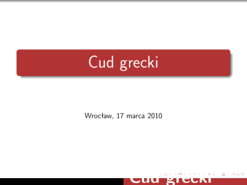 Cud grecki Wrocław, 17 marca 2010 Cud grecki Wykształcenie podstawowe Spośród wielu twierdzeń i faktów pochodzących ze starożytnej Grecji w szkole na lekcjach matematyki pojawiają się: Twierdzenie Talesa Cud grecki Wykształcenie podstawowe Spośród wielu twierdzeń i faktów pochodzących ze starożytnej Grecji w szkole na lekcjach matematyki pojawiają się: Twierdzenie Talesa Twierdzenie Pitagorasa Cud grecki Wykształcenie podstawowe Spośród wielu twierdzeń i faktów pochodzących ze starożytnej Grecji w szkole na lekcjach matematyki pojawiają się: Twierdzenie Talesa Twierdzenie Pitagorasa Sito Eratostenesa Cud grecki Wykształcenie podstawowe Spośród wielu twierdzeń i faktów pochodzących ze starożytnej Grecji w szkole na lekcjach matematyki pojawiają się: Twierdzenie Talesa Twierdzenie Pitagorasa Sito Eratostenesa Wzór Herona Cud grecki Wykształcenie podstawowe Spośród wielu twierdzeń i faktów pochodzących ze starożytnej Grecji w szkole na lekcjach matematyki pojawiają się: Twierdzenie Talesa Twierdzenie Pitagorasa Sito Eratostenesa Wzór Herona Księżyce Hipokratesa Cud grecki Wykształcenie podstawowe Spośród wielu twierdzeń i faktów pochodzących ze starożytnej Grecji w szkole na lekcjach matematyki pojawiają się: Twierdzenie Talesa Twierdzenie Pitagorasa Sito Eratostenesa Wzór Herona Księżyce Hipokratesa Równanie diofantyczne Cud grecki Wykształcenie podstawowe Spośród wielu twierdzeń i faktów pochodzących ze starożytnej Grecji w szkole na lekcjach matematyki pojawiają się: Twierdzenie Talesa Twierdzenie Pitagorasa Sito Eratostenesa Wzór Herona Księżyce Hipokratesa Równanie diofantyczne „Eureka” Archimedesa — a co z jego matematyką ?! (A N G) Cud grecki Wykształcenie podstawowe Spośród wielu twierdzeń i faktów pochodzących ze starożytnej Grecji w szkole na lekcjach matematyki pojawiają się: Twierdzenie Talesa Twierdzenie Pitagorasa Sito Eratostenesa Wzór Herona Księżyce Hipokratesa Równanie diofantyczne „Eureka” Archimedesa — a co z jego matematyką ?! (A N G) Znaczenie twierdzeń Talesa i Pitagorasa Cud grecki Trzy zagadnienia starożytności Starożytni Grecy pozostawil nam trzy klasyczne problemy konstrukcyjne (za pomocą liniału i cyrkla!), których nie potrafili rozwiązać: Kwadratura koła Cud grecki Trzy zagadnienia starożytności Starożytni Grecy pozostawil nam trzy klasyczne problemy konstrukcyjne (za pomocą liniału i cyrkla!), których nie potrafili rozwiązać: Kwadratura koła Trysekcja kąta Cud grecki Trzy zagadnienia starożytności Starożytni Grecy pozostawil nam trzy klasyczne problemy konstrukcyjne (za pomocą liniału i cyrkla!), których nie potrafili rozwiązać: Kwadratura koła Trysekcja kąta Podwojenie sześcianu Cud grecki Trzy zagadnienia starożytności Starożytni Grecy pozostawil nam trzy klasyczne problemy konstrukcyjne (za pomocą liniału i cyrkla!), których nie potrafili rozwiązać: Kwadratura koła Trysekcja kąta Podwojenie sześcianu Co dziś wiemy o tych konstrukcjach? Cud grecki Skąd Grecy? Północ — Południe w starożytności i dziś Około -2000 przybywają nad Morze Egejskie pewne ludy indoeuropejskie, zwące się Achajami Cud grecki Skąd Grecy? Północ — Południe w starożytności i dziś Około -2000 przybywają nad Morze Egejskie pewne ludy indoeuropejskie, zwące się Achajami Przybysze to barbarzyńcy, niszczą osady i podbiją lud, który nazwali Pelazgami Cud grecki Skąd Grecy? Północ — Południe w starożytności i dziś Około -2000 przybywają nad Morze Egejskie pewne ludy indoeuropejskie, zwące się Achajami Przybysze to barbarzyńcy, niszczą osady i podbiją lud, który nazwali Pelazgami Od kultury kreteńskiej uczą się żeglowania i np. pisma Cud grecki Skąd Grecy? Północ — Południe w starożytności i dziś Około -2000 przybywają nad Morze Egejskie pewne ludy indoeuropejskie, zwące się Achajami Przybysze to barbarzyńcy, niszczą osady i podbiją lud, który nazwali Pelazgami Od kultury kreteńskiej uczą się żeglowania i np. pisma Około roku -1100 nadchodza inne plemiona helleńskie — Dorowie (rzekomo jeszcze gorsi) Cud grecki Skąd Grecy? Północ — Południe w starożytności i dziś Około -2000 przybywają nad Morze Egejskie pewne ludy indoeuropejskie, zwące się Achajami Przybysze to barbarzyńcy, niszczą osady i podbiją lud, który nazwali Pelazgami Od kultury kreteńskiej uczą się żeglowania i np. pisma Około roku -1100 nadchodza inne plemiona helleńskie — Dorowie (rzekomo jeszcze gorsi) Około -1180 wojna trojańska Cud grecki Skąd Grecy? Północ — Południe w starożytności i dziś Około -2000 przybywają nad Morze Egejskie pewne ludy indoeuropejskie, zwące się Achajami Przybysze to barbarzyńcy, niszczą osady i podbiją lud, który nazwali Pelazgami Od kultury kreteńskiej uczą się żeglowania i np. pisma Około roku -1100 nadchodza inne plemiona helleńskie — Dorowie (rzekomo jeszcze gorsi) Około -1180 wojna trojańska IX wiek - Homer — Iliada i Odyseja Cud grecki Starożytna Grecja Cud grecki Starożytna Grecja Cud grecki Skąd nauka grecka Około VII w. zaczynają się intensywne kontakty handlowe Greków z Egiptem. Przy okazji następuje intensywna wymiana idei. Egipt odwiedzają: Tales z Miletu (640 - 546)? Cud grecki Skąd nauka grecka Około VII w. zaczynają się intensywne kontakty handlowe Greków z Egiptem. Przy okazji następuje intensywna wymiana idei. Egipt odwiedzają: Tales z Miletu (640 - 546)? Pitagoras (Samos - Krotona) (580 - 500)? Cud grecki Skąd nauka grecka Około VII w. zaczynają się intensywne kontakty handlowe Greków z Egiptem. Przy okazji następuje intensywna wymiana idei. Egipt odwiedzają: Tales z Miletu (640 - 546)? Pitagoras (Samos - Krotona) (580 - 500)? Platon (Ateny) (427 - 347) Cud grecki Skąd nauka grecka Około VII w. zaczynają się intensywne kontakty handlowe Greków z Egiptem. Przy okazji następuje intensywna wy