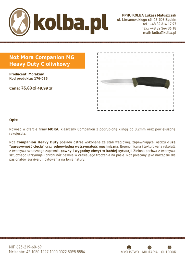 Nóż Mora Companion MG Heavy Duty C oliwkowy Producent: Morakniv Kod produktu: 176-036 Cena: 75,00 zł 49,99 zł Opis: Nowość w ofercie firmy MORA, klasyczny Companion z pogrubioną klingą do 3,2mm oraz powiększoną rękojeścią. Nóż Companion Heavy Duty posiada ostrze wykonane ze stali węglowej, zapewniającej ostrzu dużą "agresywność cięcia" oraz odpowiedną wytrzymałość mechniczną. Ergonomiczna i texturowana rękojeść z tworzywa sztucznego zapewnia pewny i wygodny chwyt w każdej sytuacji. Zielona pochwa z tworzywa sztucznego utrzymuje i chroni nóż pewnie w czasie jego troczenia na pasie. Nóż polecany jako narzędzie dla pasjonatów survivalu i bytowania na łonie natury.
