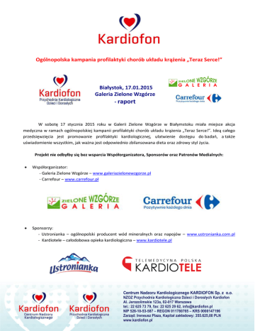 Ogólnopolska kampania profilaktyki chorób układu krążenia „Teraz Serce!” Białystok, 17.01.2015 Galeria Zielone Wzgórze - raport W sobotę 17 stycznia 2015 roku w Galerii Zielone Wzgórze w Białymstoku miała miejsce akcja medyczna w ramach ogólnopolskiej kampanii profilaktyki chorób układu krążenia „Teraz Serce!”. Ideą całego przedsięwzięcia jest promowanie profilaktyki kardiologicznej, ułatwienie dostępu do badań, a także uświadomienie wszystkim, jak ważna jest odpowiednio zbilansowana dieta oraz zdrowy styl życia. Projekt nie odbyłby się bez wsparcia Współorganizatora, Sponsorów oraz Patronów Medialnych: Współorganizator: - Galeria Zielone Wzgórze – www.galeriazielonewzgorze.pl - Carrefour – www.carrefour.pl Sponsorzy: - Ustronianka – ogólnopolski producent wód mineralnych oraz napojów – www.ustronianka.com.pl - Kardiotele – całodobowa opieka kardiologiczna – www.kardiotele.pl Centrum Nadzoru Kardiologicznego KARDIOFON Sp. z o.o. NZOZ Przychodnia Kardiologiczna Dzieci i Dorosłych Kardiofon Al. Jerozolimskie 123a, 02-017 Warszawa tel.: 22 625 73 79, fax: 22 625 29 62, [email protected] NIP 526-10-53-587 – REGON 011780765 – KRS 0000147196 Zarząd: Ireneusz Plaza, Kapitał zakładowy: 355.625,00 PLN www.kardiofon.pl Patroni Medialni: - Telewizja Polska Białystok – www.bialystok.tvp.pl - Polskie Radio Białystok – www.radio.bialystok.pl - Miesięcznik Żyj zdrowo i aktywnie – www.eurosys.pl/content/9-zyj-zdrowo-i-aktywnie - Miesięcznik Vita – www.vita.pl - Audioblog o zdrowiu Radioklinika – www.radioklinika.pl - Portal o zdrowiu Tak dla Zdrowia – www.takdlazdrowia.pl - Portal Miejski Białystok Online – www.bialystokonline.pl W ramach akcji z badań skorzystało 117 mieszkańców Białegostoku i okolic, którzy w tym dniu przybyli na miejsce akcji i wzięli w niej udział. Podczas akcji każdy zainteresowany mógł nieodpłatnie wykonać badanie EKG wraz z opisem, badanie poziomu cholesterolu we krwi, zmierzyć ciśnienie tętnicze, obliczyć wskaźnik BMI, określić czynniki ryzyka zawału serca oraz skonsultować się z dietetykiem. Dziękujemy niniejszym wszystkim zaangażowanym w organizację akcji: Współorganizatorowi, Sponsorom, a także Mediom, bez których akcja „Teraz Serce!” nie udałaby się z takim powodzeniem. Cieszymy się, że tak wiele osób mogło skorzystać z bezpłatnych badań oraz konsultacji. Zachęcamy Państwa również do odwiedzenia strony www.terazserce.pl , gdzie znajdą Państwo pełne informacje na temat naszych najbliższych akcji. Już dziś zapraszamy na wszystkie badania organizowane w 2015 roku! Kontakt ze strony Organizatora: Magdalena Wójcicka Manager akcji medycznych tel.: 698 614 683 e-mail: [email protected] Centrum Nadzoru Kardiologicznego KARDIOFON Sp. z o.o. NZOZ Przychodnia Kardiologiczna Dzieci i Dorosłych Kardiofon Al. Jerozolimskie 123a, 02-017 Warszawa tel.: 22 625 73 79, fax: 22 625 29 62, [email protected] NIP 526-10-53-587 – REGON 011780765 – KRS 0000147196 Zarząd: Ireneusz Plaza, Kapitał zakładowy: 355.625,00 PLN www.kardiofon.pl