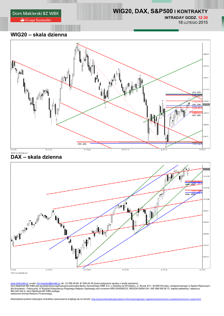 WIG20, DAX, S&P500 I KONTRAKTY INTRADAY GODZ. 12:30 18 LUTEGO 2015 WIG20 – skala dzienna DAX – skala dzienna www.dmbzwbk.pl, e-mail: [email protected], tel.: 61 856 48 80, 61 856 44 45 (koszt połączenia zgodny z taryfą operatora) Dom Maklerski BZ WBK jest wyodrębnioną organizacyjnie jednostką Banku Zachodniego WBK S.A. z siedzibą we Wrocławiu, ul. Rynek 9/11, 50-950 Wrocław, zarejestrowanego w Sądzie Rejonowym dla Wrocławia - Fabrycznej, VI Wydział Gospodarczy Krajowego Rejestru Sądowego pod numerem KRS 0000008723, REGON 930041341, NIP 896 000 56 73, kapitał zakładowy i wpłacony 992.345.340 zł. Dom Maklerski BZ WBK podlega nadzorowi Komisji Nadzoru Finansowego. Zastrzeżenia prawne dotyczące charakteru opracowania znajdują się na stronie: http://www.dmbzwbk.pl/przydatne-informacje/regulacje-i-regulaminy/zastrzezenia-i-ryzyko/zastrzezenia-i-ryzyko.html S&P500 – skala dzienna FW20H1520 – skala 60 minutowa FUSDH15 – skala dzienna Komentarz do zamieszczonych wykresów w wersji wideo ukaże się około godz. 13.30 Paweł Danielewicz Analityk techniczny DM BZWBK [email protected] ANALIZA FUTURES NA WIG20 INTRADAY GODZ. 10:30 18 LUTEGO 2015 Handel ponownie mało wyrazisty Wykres FW20H1520 – skal 60 minutowa Źródło: Amibroker Z pewną nostalgią można wspominać czasy, gdy przełamanie ważnego oporu/wsparcia Fibonacciego generowało naprawdę wiarygodne sygnały techniczne na FW20, co znajdowało również błyskawiczne odzwierciedlenie w postaci dynamicznych (często kilkudziesięciopunktowych) ruchów cenowych. W tej chwili, od dłuższego już czasu, jesteśmy świadkami bardzo „ociężałego” handlu, wręcz całkowicie pozbawionego silnych i stabilnych ruchów cenowych. Taki okres i taka specyfika rynku (w przeszłości tego typu sytuacje oczywiście również występowały). Z załączonego wykresu wynika, że handel w dalszym ciągu koncentruje się w węźle Fibonacciego: 2362 – 2369 pkt. Co prawda doszło do jego naruszenia, ale zadziałała tutaj standardowa zasada: wyższe otwarcie stało się czynnikiem zachęcającym podaż do negacji porannego ruchu. Tak jak nadmieniałem w poprzednim opracowaniu, dopiero wybicie się kontraktów poniżej węzła: 2340 – 2344 pkt. odzwierciedlałoby całkowity brak aktywności i woli walki ze strony popytu. Siłą rzeczy mogłoby to zatem doprowadzić do podjęcia próby wykreowania kolejnej podfali spadkowej. Na razie jednak obszar cenowy: 2362 – 2369 pkt. pełni rolę intradayowego wsparcia, choć oczywiście nie tak powinny wyglądać próby pokonywania ważnego, średnioterminowego oporu technicznego (zresztą wystarczy pod tym kątem spojrzeć na mizerne obroty generowane na rynku kasowym). Paweł Danielewicz Analityk techniczny DM BZWBK [email protected] www.dmbzwbk.pl, e-mail: [email protected], tel.: 61 856 48 80, 61 856 44 45 (koszt połączenia zgodny z taryfą operatora) Dom Maklerski BZ WBK jest wyodrębnioną organizacyjnie jednostką Banku Zachodniego WBK S.A. z siedzibą we Wrocławiu, ul. Rynek 9/11, 50-950 Wrocław, zarejestrowanego w Sądzie Rejonowym dla Wrocławia - Fabrycznej, VI Wydział Gospodarczy Krajowego Rejestru Sądowego pod numerem KRS 0000008723, REGON 930041341, NIP 896 000 56 73, kapitał zakładowy i wpłacony 992.345.340 zł. Dom Maklerski BZ WBK podlega nadzorowi Komisji Nadzoru Finansowego. Zastrzeżenia prawne dotyczące charakteru opracowania znajdują się na stronie: http://www.dmbzwbk.pl/przydatne-informacje/regulacje-i-regulaminy/zastrzezenia-i-ryzyko/zastrzezenia-i-ryzyko.html ANALIZA FUTURES NA WIG20 INTRADAY GODZ. 09:30 18 LUTEGO 2015 Naruszenie oporu Wykres FW20H1520 – skal 60 minutowa Źródło: Amibroker Jak wiadomo kontrakty konsolidowały się wczoraj przez kilka godzin w przedziale cenowym: 2362 – 2369 pkt. Popyt nie był w stanie sforsować tej przeszkody. Z kolei przedpołudniowa próba wykreowania ruchu spadkowego również zakończyła się fiaskiem. Zgodnie z oczekiwaniami pierwsze transakcje na dzisiejszej sesji zostały zawarte ponad zakresem: 2362 – 2369 pkt. Tym samy doszło do naruszenia stosunkowo ważnego, średnioterminowego oporu technicznego i ten fakt powinien teoretycznie stać się teraz czynnikiem mobilizującym popyt do wywierania jeszcze większej presji. Jak już wiemy z poprzednich opracowań, w pierwszej kolejności należałoby obecnie zwrócić uwagę na poziom cenowy 2387 pkt., wytyczony na bazie poprzedniego szczytu (eksponowałem jego znaczenie w dzisiejszym komentarzu porannym). Pokonanie również i tej przeszkody świadczyłoby o relatywnie silnym wzroście presji popytowej, co niejako z założenia stanowiłoby zapowiedź kontynuacji ruchu, z możliwością przetestowania kolejnego węzła Fibonacciego: 2407 – 2412 pkt. Naruszona dzisiaj strefa: 2362 – 2369 pkt. powinna natomiast przeobrazić się teraz w lokalne wsparcie techniczne. Niespełnienie tego założenia mogłoby oznaczać, że działania popytu nadal cechują się małą efektywnością i skutecznością. Niewykluczone, że dla odmiany znalazłoby to swoje odzwierciedlenie w postaci wzrostu presji podażowej. W tym kontekście szczególną uwagę zwróciłbym na wiarygodnie wyglądający obszar cenowy: 2340 – 2344 pkt. Negacja tej strefy – w powiązaniu z wcześniejszym naruszeniem węzła: 2362 – 2369 pkt. – to w moim odczuciu stosunkowo silny sygnał techniczny, obrazujący coraz większą słabość obozu byków. Na razie jednak zakres: 2362 – 2369 pkt. pełni rolę lokalnego wsparcia technicznego. www.dmbzwbk.pl, e-mail: [email protected], tel.: 61 856 48 80, 61 856 44 45 (koszt połączenia zgodny z taryfą operatora) Dom Maklerski BZ WBK jest wyodrębnioną organizacyjnie jednostką Banku Zachodniego WBK S.A. z siedzibą we Wrocławiu, ul. Rynek 9/11, 50-950 Wrocław, zarejestrowanego w Sądzie Rejonowym dla Wrocławia - Fabrycznej, VI Wydział Gospodarczy Krajowego Rejestru Sądowego pod numerem KRS 0000008723, REGON 930041341, NIP
