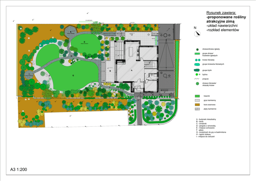 83,99 84,41 do zasłonięcia 85,11 (rzędna istniejąca) -1,82=84,15mnpm (rzędna istniejąca) -1,85=84,12mnpm 5a -1,58 (rzędna istniejąca) D 1 -1,23 (rzędna projektowana) teren podniesiony o ok. 35cm -1,35 -1,43 -1,30 -1,38=84,60mnpm -1,72 -1,77 -1,82 -1,82 84,30 -1,77 -1,77 -1,70 -1,20 (żelbet -1,24) N -1,61 -1,53 (żelbet -1,57) różnica terenu na skarpie: 115cm E miejsce schowane -1,13 -1,20=84,77mnpm (rzędna projektowana) 68cm cm niżej niż "donica" -1,28=84,69mnpm -2,92= 83,05mnpm 10x16,375 x29 8x16,375 x29 Rysunek zawiera: -proponowane rośliny atrakcyjne zimą -układ nawierzchni -rozkład elementów -1,61=84,36mnpm -0,52 (żelbet -0,56) 4 3 -0,52= 85,45mnpm bluszcz donica -2,92= 83,05mnpm -1,61=84,36mnpm -1,61 -1,56 -1,61 -1,53 (żelbet -1,57) E miejsce schowane 3 -0,02 (żelbet -0,08) drzewo/krzew iglasty -0,52= 85,45mnpm 3 grupa drzew/ krzewów iglastych -0,02= 85,95mnpm H -0,62=85,35mnpm 85,70 F krzew liściasty F grupa krzewów liściastych -0,02= 85,95mnpm I bylina G F miejsce do ćwiczeń grupa bylin A B -2,92= 83,05mnpm pnącze -0,47=85,50mnpm 3 -0,02 (żelbet -0,08) F drzewo liściaste/ okazały krzew ±0,00= 85,97mnpm -0,05 -0,05 -0,02= 85,95mnpm -0,55 -0,02 -0,38 -0,14 F 5b -0,06 pierwotna brama techniczna 2 +0,76 -0,40 -0,66 -0,64 -0,17 -0,15 -0,17 2 C -0,41 -0,17 trawnik -0,52 -0,17 +0,58 +0,40 +0,22 +0,18 +0,09 -0,00 -0,09 -0,18 -0,68=85,29mnpm -0,27 -0,40 -0,58 grys kamienny 85,17 85,45 2 +0,84 +0,58 +0,32 +0,465 kora sosnowa +0,155 +0,02 -0,10 płyty kamienne -0,24 -0,165 +0,85 86,10 -0,47 86,81 +0,82 +0,67 +0,50 A3 1:200 +0,35 +0,15 +0,01 -0,20 -0,28 -0,33 -0,385 -0,39 A - budynek mieszkalny B - taras C - śmietniki D - pergola z winoroślą E - miejsce schowane F - głazy G - przestrzeń do gry w badmintona H - ogród ziołowy I - miejsce do ćwiczeń