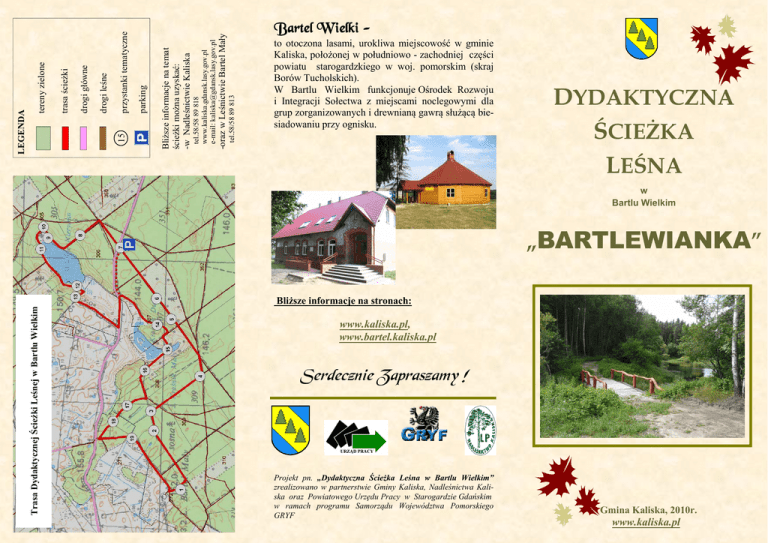 tel.58/58 89 813 -oraz w Leśnictwie Bartel Mały tel.58/58 89 818 www.kaliska.gdansk.lasy.gov.pl e-mail: [email protected] Bliższe informacje na temat ścieżki można uzyskać: -w Nadleśnictwie Kaliska parking przystanki tematyczne 15 drogi leśne drogi główne trasa ścieżki tereny zielone to otoczona lasami, urokliwa miejscowość w gminie Kaliska, położonej w południowo - zachodniej części powiatu starogardzkiego w woj. pomorskim (skraj Borów Tucholskich). W Bartlu Wielkim funkcjonuje Ośrodek Rozwoju i Integracji Sołectwa z miejscami noclegowymi dla grup zorganizowanych i drewnianą gawrą służącą biesiadowaniu przy ognisku. DYDAKTYCZNA ŚCIEŻKA LEŚNA w Bartlu Wielkim „BARTLEWIANKA” Bliższe informacje na stronach: Trasa Dydaktycznej Ścieżki Leśnej w Bartlu Wielkim LEGENDA Cbsufm!X jfmlj!. jfmlj!.! www.kaliska.pl, www.bartel.kaliska.pl Tfsefd{ojf![bqsbt{bnz!"! Projekt pn. „Dydaktyczna Ścieżka Leśna w Bartlu Wielkim” zrealizowano w partnerstwie Gminy Kaliska, Nadleśnictwa Kaliska oraz Powiatowego Urzędu Pracy w Starogardzie Gdańskim w ramach programu Samorządu Województwa Pomorskiego GRYF Gmina Kaliska, 2010r. www.kaliska.pl Wszystkich miłośników przyrody lubiących aktywnie spędzać czas zapraszamy do odwiedzenia naszej Leśnej Ścieżki „Bartlewianki”. Długość ścieżki wynosi ok. 6,4 km i przebiega przez lasy Nadleśnictwa Kaliska, wokół dwóch jezior: Karaśnika oraz Nierybna Wielkiego. Średni czas przejścia wynosi ok. 3 godz. Istnieje możliwość przejścia fragmentu ścieżki wokół jeziora Nierybno tzw.„MAŁEJ BARTLEWIANKI” obejmującej następujące punkty trasy: 7, 8,9,10,11,12,13,7 Długość tej ścieżki wynosi 2,4 km, a średni czas jej przejścia to ok. 1 godz. Spacer ścieżką to nie tylko przyjemność podziwiania nieskażonej przyrody i urokliwych widoków, ale również możliwość pogłębienia wiedzy dzięki usytuowanym na trasie tablicom edukacyjnym. ! ! Kierunek zwiedzania jest oznaczony strzałkami kierunkowymi. Na trasie wyznaczono 19 przystanków tematycznych w postaci tablic edukacyjnych. Na szlaku można poznać kilka ciekawostek np. dotyczących życia mrówek. Ustawiono tablice edukacyjne z opisami zjawisk i nowinek przyrodniczych m.in o następującej tematyce: 1.Zwierzęta leśne 2.Paśnik 3.Brzezina 4.Grzyby 5.Żywicowanie 6.Ochrona przyrody 7.Historia miejscowości Bartel Wielki 8.Przebudowa drzewostanu 9.Dziuple i ich mieszkańcy 10.Ols 11.Mikoryza 12.Strefy życia w jeziorze 13.Skrzydlaci mieszkańcy lasów 14.Ekosystem 15.Ryby 16.Mrowisko 17.Jak leśnicy pielęgnują las 18.Gospodarczy drzewostan nasienny 19.Drzewo doskonały produkt Na trasie zobaczyć też można okazały paśnik, który w okresie śnieżnych i mroźnych zim wykładany jest karmą dla zwierzyny. Usytuowany na trasie Ścieżki Leśnej mostek przeprowadzi nas na drugi brzeg malowniczo położonego jeziora Karaśnik.