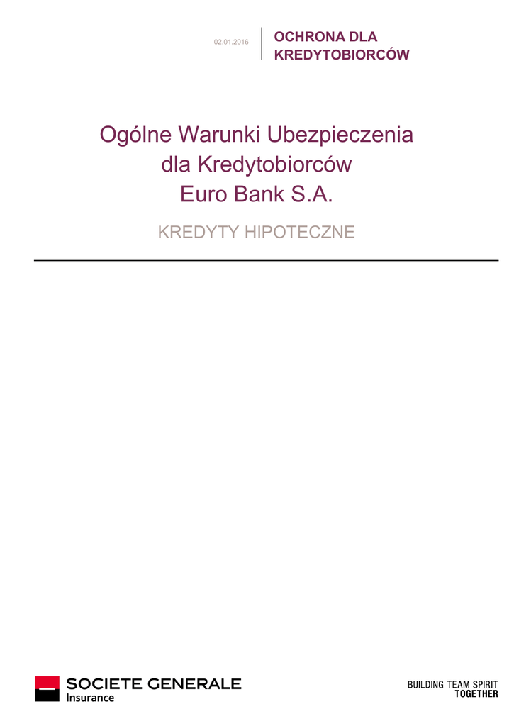 02.01.2016 OCHRONA DLA KREDYTOBIORCÓW Ogólne Warunki Ubezpieczenia dla Kredytobiorców Euro Bank S.A. KREDYTY HIPOTECZNE OCHRONA DLA KREDYTOBIORCÓW 02.01.2016 Informacja na podstawie artykułu 17 ustawy o działalności ubezpieczeniowej i reasekuracyjnej Rodzaj informacji Numer właściwego postanowienia Ogólnych Warunków Ubezpieczenia dla Kredytobiorców Euro Bank S.A. – Kredyty Hipoteczne Przesłanki wypłaty odszkodowania i innych świadczeń Art. 3 Art. 4 Art. 5 Art. 6 Art. 13 Art. 14 Art. 15 Art. 16 z zastosowaniem definicji zawartych w Art. 2 Ograniczenia odpowiedzialności zakładu ubezpieczeń uprawniające do odmowy wypłaty odszkodowania i innych świadczeń lub ich obniżenia Art. 12 Wyłączenia odpowiedzialności zakładu ubezpieczeń uprawniające do odmowy wypłaty odszkodowania i innych świadczeń lub ich obniżenia Art. 8 Art. 19 z zastosowaniem definicji zawartych w Art. 2 Art. 10 Art. 11 z zastosowaniem definicji zawartych w Art. 2 2 OCHRONA DLA KREDYTOBIORCÓW 02.01.2016 Spis treści Art. 1 Wprowadzenie ................................................................................................................................ 4 Art. 2 Definicje .......................................................................................................................................... 4 Art. 3 Przedmiot i zakres Umowy Ubezpieczenia ...................................................................................... 7 Art. 4 Ubezpieczający / Ubezpieczony ...................................................................................................... 7 Art. 5 Uprawniony do Świadczenia ........................................................................................................... 7 Art. 6 Zawarcie Umowy Ubezpieczenia ..................................................................................................... 8 Art. 7 Sposób kalkulacji i zapłaty Składki Ubezpieczeniowej przez Ubezpieczającego ............................. 9 Art. 8 Rozwiązanie Umowy Ubezpieczenia ............................................................................................... 9 Art. 9 Zakres terytorialny ......................................................................................................................... 10 Art. 10 Wyłączenia odpowiedzialności dotyczące ryzyka śmierci ............................................................ 10 Art. 11 Wyłączenia odpowiedzialności dotyczące ryzyka Trwałej i Całkowitej Niepełnosprawności ........ 10 Art. 12 Ograniczenia odpowiedzialności Ubezpieczyciela ....................................................................... 11 Art. 13 Suma Ubezpieczenia .................................................................................................................. 11 Art. 14 Świadczenia ubezpieczeniowe w przypadku śmierci (w tym: Śmierci wskutek Nieszczęśliwego Wypadku lub Śmierci wskutek Nieszczęśliwego Wypadku Komunikacyjnego)............. 11 Art. 15 Świadczenia w przypadku Trwałej i Całkowitej Niepełnosprawności ........................................... 12 Art. 16 Zgłaszanie roszczeń .................................................................................................................... 12 Art. 17 Skargi, zażalenia lub reklamacje (reklamacje) ............................................................................. 13 Art. 18 Badanie Ubezpieczającego / Ubezpieczonego ............................................................................ 14 Art. 19 Przedawnienie ............................................................................................................................. 14 Art. 20 Powiadomienia, adresy ............................................................................................................... 14 Art. 21 Jurysdykcja ................................................................................................................................. 14 Art. 22 Właściwe prawo .......................................................................................................................... 15 Art. 23 Regulacje podatkowe .................................................................................................................. 15 Art. 24 Informacje na temat OWU ........................................................................................................... 15 3 Kredyt Hipoteczny – środki pieniężne, o których przyznanie wnioskuje Ubezpieczający / Ubezpieczony lub które zostały oddane przez Bank do dyspozycji Kredytobiorcy w wysokości i na warunkach określonych w Umowie Kredytu Hipotecznego, z przeznaczeniem na konkretny cel: mieszkaniowy, refinansowanie kredytu mieszkaniowego, konsolidację zobowiązań finansowych, a także częściowo na dowolny cel konsumpcyjny, zabezpieczone w szczególności hipoteką na nieruchomości. Wszelkie postanowienia niniejszych OWU odnoszące się do Kredytu Hipotecznego, stosuje się odpowiednio do Pożyczki Hipotecznej. Art. 1 Wprowadzenie Poniższe Ogólne Warunki Ubezpieczenia (dalej „OWU”) znajdują zastosowanie do indywidualnych Umów Ubezpieczenia zawieranych przez Ubezpieczyciela oraz Ubezpieczającego / Ubezpieczonego i stanowią integralną część Umowy Ubezpieczenia. Art. 2 Definicje Poniższe wyrażenia rozpoczynające się z wielkiej litery użyte w niniejszych OWU oraz we wszelkich innych dokumentach i oświadczeniach, w tym w Polisie Ubezpieczeniowej oraz Wniosku Ubezpieczeniowym, w związku z udzieleniem ochrony ubezpieczeniowej, mają następujące znaczenie: Kredyt Restrukturyzowany: umowa pomiędzy Bankiem i Kredytobiorcą mająca na celu poprawę zdolności kredytowej Kredytobiorcy przez ustanowienie nowych warunków spłaty rat Kredytu Hipotecznego. Agent Ubezpieczeniowy/ Bank: Euro Bank S.A., z siedzibą we Wrocławiu pod adresem: ul. Św. Mikołaja 72, 50-126 Wrocław, wpisana do rejestru przedsiębiorców prowad