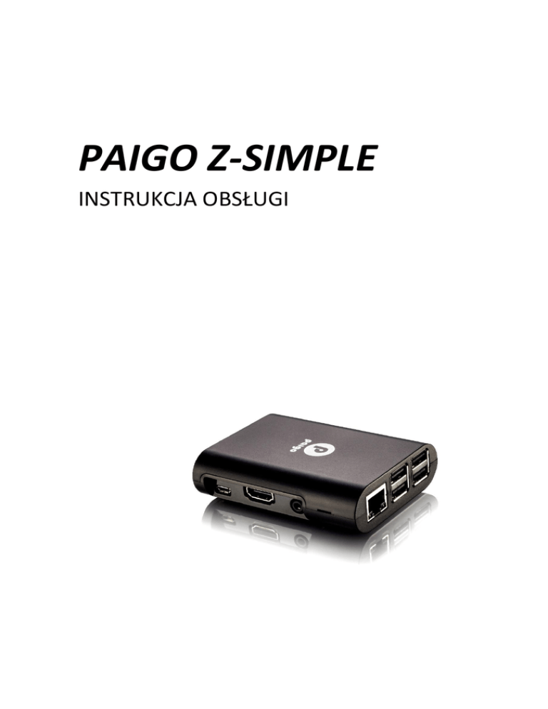 PAIGO Z-SIMPLE INSTRUKCJA OBSŁUGI 1 Instrukcja obsługi Paigo Z-Simple www.paigo.eu www.store.paigo.eu 2 Przedmowa Dziękujemy za zakup Paigo Z-Simple. Przed rozpoczęciem użytkowania urządzenia Paigo prosimy o zapoznanie się z niniejszą instrukcją, procedurami oraz funkcjami. Prawa autorskie Kopiowanie niniejszej instrukcji, treści, oprogramowania, fotografii i ilustracji w niej zawartych, bez wyraźnej zgody firmy Paigo Sp. z o. o. jest zabronione. Wszelkie prawa zastrzeżone. Zastrzeżenie Producent zastrzega sobie prawo do zmiany treści niniejszej instrukcji bez uprzedniego powiadamiania kogokolwiek. Producent nie udziela żadnych gwarancji w odniesieniu do treści oraz nie ponosi odpowiedzialności w stosunku do niej. Rozpoznawanie Znaków Towarowych Raspberry Pi jest zastrzeżonym znakiem towarowym firmy Raspberry Pi Foundation. Pozostałe nazwy produktów użyte w niniejszej publikacji są własnością właścicieli i zostały potwierdzone. Bezpieczeństwo Paigo spełnia wszystkie normy i wymogi bezpiecznego korzystania z technologii, zostało również dokładnie przetestowane. Jednakże w celu zachowania należytej ostrożności i dla własnego bezpieczeństwa, ważne jest, aby dokładnie przeczytać tę publikację, szczególnie w dziedzinie bezpieczeństwa. Przed uruchomieniem systemu należy uważnie przeczytać instrukcję obsługi. Produktu nie należy używać w pobliżu wody lub jakiegokolwiek źródła ciepła. Produkt należy umieścić na płaskiej, stabilnej powierzchni. Nie należy zasłaniać otworów w urządzeniu, są one wykorzystywane do wentylacji. Nie należy również umieszczać różnych przedmiotów w otworach. Ten produkt musi być używany w temperaturze otoczenia od 00 C do 400 C. Całkowity pobór prądu urządzeń podłączonych do przedłużacza nie przekracza wartości nominalnej produktu, kiedy używa przedłużacza. Należy unikać nacisku oraz nie stąpać po kablu zasilającym, a także nie rozlewać płynów, w tym wody. Nawet, gdy system jest wyłączony, urządzenie zużywa minimalną ilość energii elektrycznej. Przed czyszczeniem urządzenia należy odłączyć wszystkie kable od zasilania i gniazd elektrycznych. www.paigo.eu www.store.paigo.eu 3 Ostrzeżenia W przypadku wystąpienia poniżej przedstawionych problemów technicznych, należy odłączyć przewód zasilający I skontaktować się z serwisem: Zmiany wydajności systemu lub system nie działa prawidłowo. Obudowa jest uszkodzona lub system zerwał połączenie. Przewód zasilający jest uszkodzony lub na urządzenie został rozlany płyn. Usuwanie produktu Ten przekreślony symbol powyżej oznacza, że urządzenia elektrycznego i elektronicznego nie należy wyrzucać razem z odpadami komunalnymi. Proszę zapoznać się z lokalnymi przepisami dotyczącymi utylizacji produktów elektronicznych. Warunki utylizacji produktu 1. Nie należy umieszczać urządzenia w niestabilnej pozycji lub pod dużym obciążeniem. 2. Nie używać I nie eksponować urządzenia w pobliżu pól magnetycznych, gdyż zakłócenia magnetyczne mogą wpływać na wydajność produktu. 3. Nie wystawiać urządzenia na bezpośrednie działanie promieni słonecznych, wysokiej wilgotności lub mokrych warunkach. 4. Nie wolno zasłaniać otworów wentylacyjnych ani w żaden sposób zakłócać przepływu powietrza. Instrukcja składa się z następujących rozdziałów: Rozdział 1 Rozdział 2 Rozdział 3 Wprowadzenie do Paigo Z-Simple 5 System OSMC 7 Wsparcie 10 www.paigo.eu www.store.paigo.eu 4 Spis treści Wprowadzenie ........................................................................................................................... 1 Rozdział 1 Wprowadzenie do Paigo Z-Simple 5 Wstęp ................................................................................................................................. 5 Specyfikacja ........................................................................................................................ 6 Porty .................................................................................................................................... 6 Rozdział 2 System OSMC 7 Rozdział 3 Wsparcie 10 www.paigo.eu www.store.paigo.eu 5 Rozdział 1 Wprowadzenie do Paigo Z-Simple Dziękujemy za wybranie Paigo Z-Simple. To stylowy i innowacyjny system z dużą wydajnością oraz prostą i elastyczną konstrukcją. Paigo Z-Simple to innowacyjne rozwiązanie dla Twojego domu. Dzięki najnowocześniejszej technologii to niewielkie urządzenie proponuje wiele rozwiązań dla Twojego domu. Jeszcze nigdy kontrola domem nie była tak prosta. Z naszym system możesz kontrolować i monitorować swój dom, a także czuć się bardziej bezpiecznie z kamerami IP i systemem alarmowym Paigo. Z-Simple daje Ci również dostęp do wszystkich multimediów, oglądaj telewizję, słuchaj ulubionej muzyki, korzystaj z Internetu- teraz to takie proste. www.paigo.eu www.store.paigo.eu 6 Specyfikacja Paigo Z-Simple Procesor Quad Core Broadcom BCM2836, 900 MHz Rdzeń ARM Cortex-A7 GPU: Broadcom VideoCore IV, OpenGL ES 2.0, 1080p30 h.264/MPEG-4 AVC highprofile decode Pamięć Ram: 1GB + 8GB micro SD kl. 10. 4 x port USB 2.0 10/100 Ethernet (gniazdo RJ-45) Gniazdo HDMI 1.4 zgodne z 1.3 Złącze kart microSD zasilanie 5 V, minimum 2 A źrófło zasilania: 5 V za pomocą złącza MicroUSB lub złącza GPIO wymiary: 86 mm × 56 mm 20 mm RoHS Porty 6 5 1 2 4 3 1. Złącze micro USB - do podłączenia ładowarki 2. Gniazdo HDMI 1.4 zgodne z 1.3 - do podłączenia monitora 3. Combo Audio Jack (Mic in & Line out) – Audio Jack do podłączenia słuchawek lub głośniki 4. 10/100 Enthernet (gniazdo RJ- 45) 5. 2 x port USB 2.0 6. 2 x port USB 2.0 www.paigo.eu www.store.paigo.eu 7 Rozdział 2 System OSMC OSMC (Open Source Media Center) odtwarzacz multimedialny oparty na systemie Linuks, umożliwiający odtwarzanie multimediów z sieci lokalnej, pamięci masowej oraz Internetu. OSMC jest niezwykl