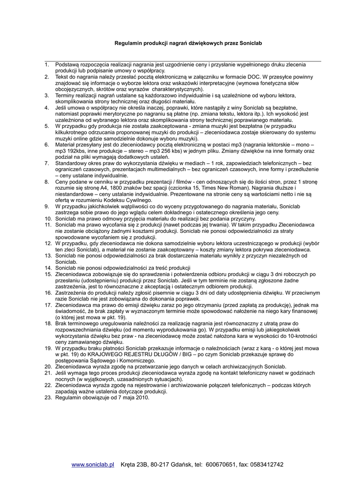 Regulamin produkcji nagrań dźwiękowych przez Soniclab 1. 2. 3. 4. 5. 6. 7. 8. 9. 10. 11. 12. 13. 14. 15. 16. 17. 18. 19. 20. 21. 22. 23. Podstawą rozpoczęcia realizacji nagrania jest uzgodnienie ceny i przysłanie wypełnionego druku zlecenia produkcji lub podpisanie umowy o współpracy. Tekst do nagrania należy przesłać pocztą elektroniczną w załączniku w formacie DOC. W przesyłce powinny znajdować się informacje o wyborze lektora oraz wskazówki interpretacyjne (wymowa fonetyczna słów obcojęzycznych, skrótów oraz wyrazów charakterystycznych). Terminy realizacji nagrań ustalane są każdorazowo indywidualnie i są uzależnione od wyboru lektora, skomplikowania strony technicznej oraz długości materiału. Jeśli umowa o współpracy nie określa inaczej, poprawki, które nastąpiły z winy Soniclab są bezpłatne, natomiast poprawki merytoryczne po nagraniu są płatne (np. zmiana tekstu, lektora itp.). Ich wysokość jest uzależniona od wybranego lektora oraz skomplikowania strony technicznej poprawianego materiału. W przypadku gdy produkcja nie została zaakceptowana - zmiana muzyki jest bezpłatna (w przypadku kilkukrotnego odrzucania proponowanej muzyki do produkcji – zleceniodawca zostaje skierowany do systemu muzyki online gdzie samodzielnie dokonuje wyboru muzyki). Materiał przesyłany jest do zleceniodawcy pocztą elektroniczną w postaci mp3 (nagrania lektorskie – mono – mp3 192kbs, inne produkcje – stereo – mp3 256 kbs) w jednym pliku. Zmiany dźwięków na inne formaty oraz podział na pliki wymagają dodatkowych ustaleń. Standardowy okres praw do wykorzystania dźwięku w mediach – 1 rok, zapowiedziach telefonicznych – bez ograniczeń czasowych, prezentacjach multimedialnych – bez ograniczeń czasowych, inne formy i przedłużenie – ceny ustalane indywidualnie. Ceny podane w cenniku w przypadku prezentacji / filmów - cen odnoszących się do ilości stron, przez 1 stronę rozumie się stronę A4, 1800 znaków bez spacji (czcionka 15, Times New Roman). Nagrania dłuższe i niestandardowe – ceny ustalanie indywidualnie. Prezentowane na stronie ceny są wartościami netto i nie są ofertą w rozumieniu Kodeksu Cywilnego. W przypadku jakichkolwiek wątpliwości co do wyceny przygotowanego do nagrania materiału, Soniclab zastrzega sobie prawo do jego wglądu celem dokładnego i ostatecznego określenia jego ceny. Soniclab ma prawo odmowy przyjęcia materiału do realizacji bez podania przyczyny. Soniclab ma prawo wycofania się z produkcji (nawet podczas jej trwania). W takim przypadku Zleceniodawca nie zostanie obciążony żadnymi kosztami produkcji. Soniclab nie ponosi odpowiedzialności za straty spowodowane wycofaniem się z produkcji. W przypadku, gdy zleceniodawca nie dokona samodzielnie wyboru lektora uczestniczącego w produkcji (wybór ten zleci Soniclab), a materiał nie zostanie zaakceptowany – koszty zmiany lektora pokrywa zleceniodawca. Soniclab nie ponosi odpowiedzialności za brak dostarczenia materiału wynikły z przyczyn niezależnych od Soniclab. Soniclab nie ponosi odpowiedzialności za treść produkcji Zleceniodawca zobowiązuje się do sprawdzenia i potwierdzenia odbioru produkcji w ciągu 3 dni roboczych po przesłaniu (udostępnieniu) produkcji przez Soniclab. Jeśli w tym terminie nie zostaną zgłoszone żadne zastrzeżenia, jest to równoznaczne z akceptacją i ostatecznym odbiorem produkcji. Zastrzeżenia do produkcji należy zgłosić pisemnie w ciągu 3 dni od daty udostępnienia dźwięku. W przeciwnym razie Soniclab nie jest zobowiązana do dokonania poprawek. Zleceniodawca ma prawo do emisji dźwięku zaraz po jego otrzymaniu (przed zapłatą za produkcję), jednak ma świadomość, że brak zapłaty w wyznaczonym terminie może spowodować nałożenie na niego kary finansowej (o której jest mowa w pkt. 19). Brak terminowego uregulowania należności za realizację nagrania jest równoznaczny z utratą praw do rozpowszechniania dźwięku (od momentu wyprodukowania go). W przypadku emisji lub jakiegokolwiek wykorzystania dźwięku bez praw - na zleceniodawcę może zostać nałożona kara w wysokości do 10-krotności ceny zamawianego dźwięku. W przypadku braku płatności Soniclab przekazuje informacje o należnościach (wraz z karą - o której jest mowa w pkt. 19) do KRAJOWEGO REJESTRU DŁUGÓW / BIG – po czym Soniclab przekazuje sprawę do postępowania Sądowego i Komorniczego. Zleceniodawca wyraża zgodę na przetwarzanie jego danych w celach archiwizacyjnych Soniclab. Jeśli wymaga tego proces produkcji zleceniodawca wyraża zgodę na kontakt telefoniczny nawet w godzinach nocnych (w wyjątkowych, uzasadnionych sytuacjach). Zleceniodawca wyraża zgodę na rejestrowanie i archiwizowanie połączeń telefonicznych – podczas których zapadają ważne ustalenia dotyczące produkcji. Regulamin obowiązuje od 7 maja 2010. www.soniclab.pl Kręta 23B, 80-217 Gdańsk, tel: 600670651, fax: 0583412742