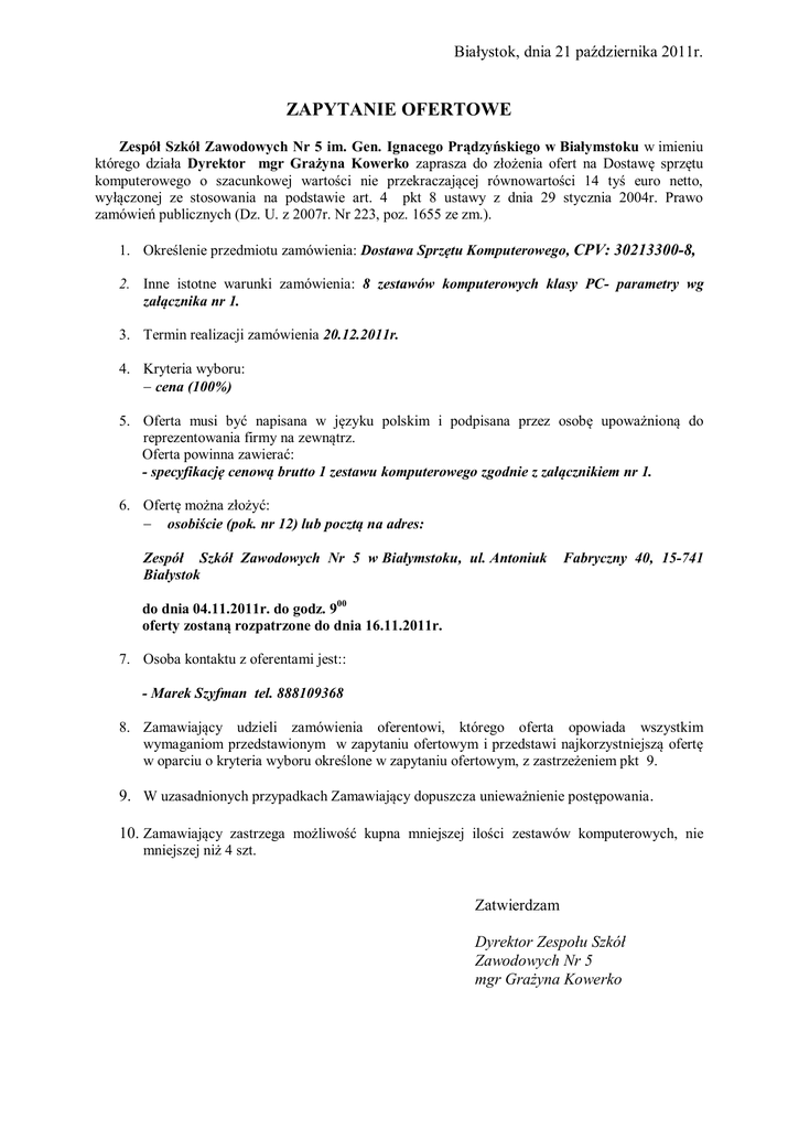 Białystok, dnia 21 października 2011r. ZAPYTANIE OFERTOWE Zespół Szkół Zawodowych Nr 5 im. Gen. Ignacego Prądzyńskiego w Białymstoku w imieniu którego działa Dyrektor mgr Grażyna Kowerko zaprasza do złożenia ofert na Dostawę sprzętu komputerowego o szacunkowej wartości nie przekraczającej równowartości 14 tyś euro netto, wyłączonej ze stosowania na podstawie art. 4 pkt 8 ustawy z dnia 29 stycznia 2004r. Prawo zamówień publicznych (Dz. U. z 2007r. Nr 223, poz. 1655 ze zm.). 1. Określenie przedmiotu zamówienia: Dostawa Sprzętu Komputerowego, CPV: 30213300-8, 2. Inne istotne warunki zamówienia: 8 zestawów komputerowych klasy PC- parametry wg załącznika nr 1. 3. Termin realizacji zamówienia 20.12.2011r. 4. Kryteria wyboru: cena (100%) 5. Oferta musi być napisana w języku polskim i podpisana przez osobę upoważnioną do reprezentowania firmy na zewnątrz. Oferta powinna zawierać: - specyfikację cenową brutto 1 zestawu komputerowego zgodnie z załącznikiem nr 1. 6. Ofertę można złożyć: osobiście (pok. nr 12) lub pocztą na adres: Zespół Szkół Zawodowych Nr 5 w Białymstoku, ul. Antoniuk Białystok Fabryczny 40, 15-741 do dnia 04.11.2011r. do godz. 900 oferty zostaną rozpatrzone do dnia 16.11.2011r. 7. Osoba kontaktu z oferentami jest:: - Marek Szyfman tel. 888109368 8. Zamawiający udzieli zamówienia oferentowi, którego oferta opowiada wszystkim wymaganiom przedstawionym w zapytaniu ofertowym i przedstawi najkorzystniejszą ofertę w oparciu o kryteria wyboru określone w zapytaniu ofertowym, z zastrzeżeniem pkt 9. 9. W uzasadnionych przypadkach Zamawiający dopuszcza unieważnienie postępowania . 10. Zamawiający zastrzega możliwość kupna mniejszej ilości zestawów komputerowych, nie mniejszej niż 4 szt. Zatwierdzam Dyrektor Zespołu Szkół Zawodowych Nr 5 mgr Grażyna Kowerko Załącznik nr 1 do zapytania ofertowego z dnia 21.10.2011r. 8 sztuk zestawów komputerowych klasy PC w konfiguracji jak poniżej: Typ procesora AMD Phenom II x4 955 AM3 Black Edition M4A88TD-M/USB3 Płyta główna Zainstalowany system operacyjny Standardowa pamięć Wewnętrzny dysk twardy Napędy optyczne Czytnik kart Typ obudowy Karta graficzna Karta dźwiękowa Interfejs sieciowy Zasilacz Zewnętrzne porty wyjściowe Oprogramowanie załączone (nośniki) Klawiatura Urządzenia wskazujące Standardowa gwarancja Inne Microsoft Windows 7 Home Premium 64-bitowy 2 x 4 GB DDR3 1333MHz 2TB 64MB 7200obr/min - WD20EARX Napęd DVD+/-RW Czytnik kart wewnętrzny Midi Tower ATX Zintegrowana z płytą główną Zintegrowana z płytą główną Zintegrowana z płytą główną Gigabitowa karta sieciowa ATX 500W 1 x PS/2 keyboard/mouse combo port(s) 1 x DVI 1 x D-Sub 1 x HDMI 1 x LAN (RJ45) port(s) 2 x USB 3.0 4 x USB 2.0 1 x Optical S/PDIF out 6 x Audio jack(s) System Windows 7 Home Premium 64-bitowy, Nero Express obsługujące nagrywanie płyt DVD, Odpowiednie do urządzeń wbudowanych sterowniki dla systemu Windows 7 Home Premium 64-bitowy Standardowa klawiatura USB Mysz optyczna USB Standardowa gwarancja 3-letnia obejmująca koszty wykonania naprawy Oferowany komputer musi posiadać certyfikat Microsoft, potwierdzający poprawną współpracę z ww. systemem operacyjnym, Oferowany komputer musi być kompatybilny z pakietem AutoCad 2012 Education Suite. Monitory LG Flatron E2260T-PN Przekątna ekranu Maksymalna rozdzielczość Format Matryca Kontrast Jasność Czas reakcji Kąt widzenia (w poziomie) Kąt widzenia (w pionie) Złącza Gwarancja Inne 21,5 cala 1920 x 1080 16:9 TFT/TN, LED 5000000:1 250 cd/m2 5 ms 170° 160° D-Sub, DVI-D 3 lata Dołączony kabel video D-SUB, kabel video DVI-D, kabel audio, kabel zasilający