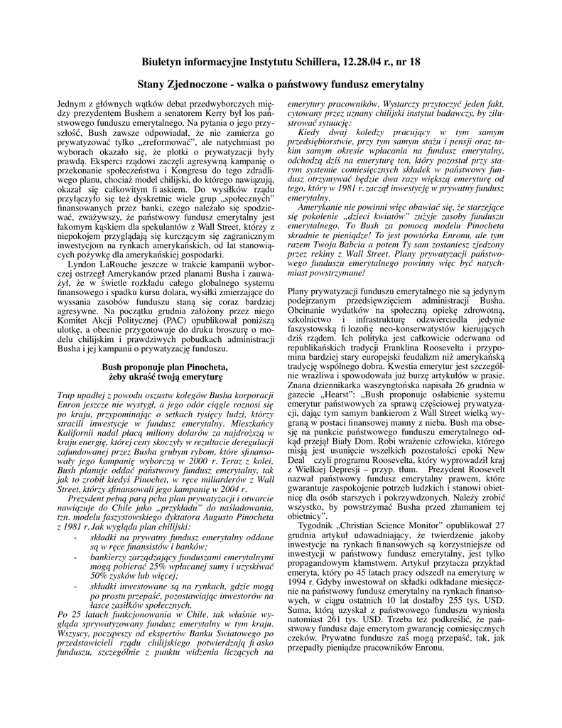 Biuletyn informacyjne Instytutu Schillera, 12.28.04 r., nr 18 Stany Zjednoczone - walka o państwowy fundusz emerytalny Jednym z głównych wątków debat przedwyborczych między prezydentem Bushem a senatorem Kerry był los państwowego funduszu emerytalnego. Na pytania o jego przyszłość, Bush zawsze odpowiadał, że nie zamierza go prywatyzować tylko „zreformować”, ale natychmiast po wyborach okazało się, że plotki o prywatyzacji były prawdą. Eksperci rządowi zaczęli agresywną kampanię o przekonanie społeczeństwa i Kongresu do tego zdradliwego planu, chociaż model chilijski, do którego nawiązują, okazał się całkowitym fi askiem. Do wysiłków rządu przyłączyło się też dyskretnie wiele grup „społecznych” finansowanych przez banki, czego należało się spodziewać, zważywszy, że państwowy fundusz emerytalny jest łakomym kąskiem dla spekulantów z Wall Street, którzy z niepokojem przyglądają się kurczącym się zagranicznym inwestycjom na rynkach amerykańskich, od lat stanowiących pożywkę dla amerykańskiej gospodarki. Lyndon LaRouche jeszcze w trakcie kampanii wyborczej ostrzegł Amerykanów przed planami Busha i zauważył, że w świetle rozkładu całego globalnego systemu finansowego i spadku kursu dolara, wysiłki zmierzające do wyssania zasobów funduszu staną się coraz bardziej agresywne. Na początku grudnia założony przez niego Komitet Akcji Politycznej (PAC) opublikował poniższą ulotkę, a obecnie przygotowuje do druku broszurę o modelu chilijskim i prawdziwych pobudkach administracji Busha i jej kampanii o prywatyzację funduszu. Bush proponuje plan Pinocheta, żeby ukraść twoją emeryturę Trup upadłej z powodu oszustw kolegów Busha korporacji Enron jeszcze nie wystygł, a jego odór ciągle roznosi się po kraju, przypominając o setkach tysięcy ludzi, którzy stracili inwestycje w fundusz emerytalny. Mieszkańcy Kalifornii nadal płacą miliony dolarów za najdroższą w kraju energię, której ceny skoczyły w rezultacie deregulacji zafundowanej przez Busha grubym rybom, które sfinansowały jego kampanię wyborczą w 2000 r. Teraz z kolei, Bush planuje oddać państwowy fundusz emerytalny, tak jak to zrobił kiedyś Pinochet, w ręce miliarderów z Wall Street, którzy sfinansowali jego kampanię w 2004 r. Prezydent pełną parą pcha plan prywatyzacji i otwarcie nawiązuje do Chile jako „przykładu” do naśladowania, tzn. modelu faszystowskiego dyktatora Augusto Pinocheta z 1981 r. Jak wygląda plan chilijski: - składki na prywatny fundusz emerytalny oddane są w ręce finansistów i banków; - bankierzy zarządzający funduszami emerytalnymi mogą pobierać 25% wpłacanej sumy i uzyskiwać 50% zysków lub więcej; - składki inwestowane są na rynkach, gdzie mogą po prostu przepaść, pozostawiając inwestorów na łasce zasiłków społecznych. Po 25 latach funkcjonowania w Chile, tak właśnie wygląda sprywatyzowany fundusz emerytalny w tym kraju. Wszyscy, począwszy od ekspertów Banku Swiatowego po przedstawicieli rządu chilijskiego potwierdzają fi asko funduszu, szczególnie z punktu widzenia liczących na emerytury pracowników. Wystarczy przytoczyć jeden fakt, cytowany przez uznany chilijski instytut badawczy, by zilustrować sytuację: Kiedy dwaj koledzy pracujący w tym samym przedsiębiorstwie, przy tym samym stażu i pensji oraz takim samym okresie wpłacania na fundusz emerytalny, odchodzą dziś na emeryturę ten, który pozostał przy starym systemie comiesięcznych składek w państwowy fundusz otrzymywać będzie dwa razy większą emeryturę od tego, który w 1981 r. zaczął inwestycję w prywatny fundusz emerytalny. Amerykanie nie powinni więc obawiać się, że starzejące się pokolenie „dzieci kwiatów” zużyje zasoby funduszu emerytalnego. To Bush za pomocą modelu Pinocheta skradnie te pieniądze! To jest powtórka Enronu, ale tym razem Twoja Babcia a potem Ty sam zostaniesz zjedzony przez rekiny z Wall Street. Plany prywatyzacji państwowego funduszu emerytalnego powinny więc być natychmiast powstrzymane! Plany prywatyzacji funduszu emerytalnego nie są jedynym podejrzanym przedsięwzięciem administracji Busha. Obcinanie wydatków na społeczną opiekę zdrowotną, szkolnictwo i infrastrukturę odzwierciedla jedynie faszystowską fi lozofię neo-konserwatystów kierujących dziś rządem. Ich polityka jest całkowicie oderwana od republikańskich tradycji Franklina Roosevelta i przypomina bardziej stary europejski feudalizm niż amerykańską tradycję wspólnego dobra. Kwestia emerytur jest szczególnie wrażliwa i spowodowała już burzę artykułów w prasie. Znana dziennikarka waszyngtońska napisała 26 grudnia w gazecie „Hearst”: „Bush proponuje osłabienie systemu emerytur państwowych za sprawą częściowej prywatyzacji, dając tym samym bankierom z Wall Street wielką wygraną w postaci finansowej manny z nieba. Bush ma obsesję na punkcie państwowego funduszu emerytalnego odkąd przejął Biały Dom. Robi wrażenie człowieka, którego misją jest usunięcie wszelkich pozostałości epoki New Deal czyli programu Roosevelta, który wyprowadził kraj z Wielkiej Depresji – przyp. tłum. Prezydent Roosevelt nazwał państwowy fundusz emerytalny prawem, które gwarantuje zaspokojenie potrzeb ludzkich i stanowi obietnicę dla osób starszych i pokrzywdzonych. Należy zrobić wszystko, by powstrzymać Busha przed złamaniem tej obietnicy”. Tygodnik „Christian Science Monitor” opublikował 27 grudnia artykuł udawadniający, że twierdzenie jakoby inwestycje na rynkach finansowych są korzystniejsze od inwestycji w państwowy fundusz emerytalny, jest tylko propagandowym kłamstwem. Artykuł przytacza przykład emeryta, który po 45 latach pracy odszedł na emeryturę w 1994 r. Gdyby inwestował on składki odkładane miesięcznie na państwowy fundusz emerytalny na rynkach finansowych, w ciągu ostatnich 10 lat dostałby 255 tys. USD. Suma, któ