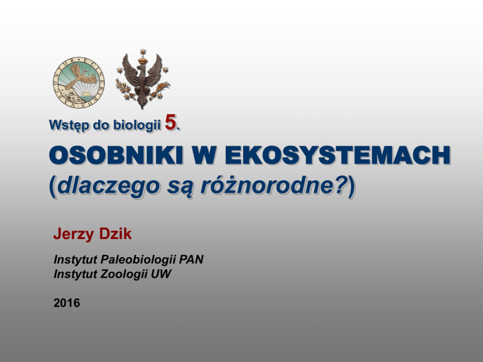 Wstęp do biologii 5. OSOBNIKI W EKOSYSTEMACH (dlaczego są różnorodne?) Jerzy Dzik Instytut Paleobiologii PAN Instytut Zoologii UW 2016 OGRANICZENIA indywidualizmu osobników w osobności nie da się żyć nawet jednokomórkowcowi samo zjawisko rozmnażania daje towarzystwo wcześniej czy później przemieniając się w konkurencję lub współdziałanie, czy nawet wielokomórkowość z tego też wynika zróżnicowanie wielkości ciała organizmów ROZMIARY produkcja pierwotna (lipiec 2002) osobników w trakcie cyklu życiowego osobnika dopływ energii i materii nie może spaść poniżej niezbędnego minimum a przecież ocean i lądy to przeważnie pustynia dlatego większość organizmów jest drobnych im bardziej stabilne warunki, tym większe maksymalne rozmiary ciała STRATEGIE ekologiczne leming Lemmus oportunista ekologiczny niestabilne środowisko oznacza okresy biedy i szybkiego odtwarzania liczebności zatem małych rozmiarów ciała, krótkiego trwania pokolenia i dużej rozrodczości stabilne środowisko umożliwia długie pokolenia, duże rozmiary i niską rozrodczość słoń Loxodonta specjalista ekologiczny specjalizacja lub oportunizm dają różne rozkłady śmiertelności DYNAMIKA populacji krzywe przeżywania w stabilnej populacji do rozrodu przetrwać musi dostateczna liczba osobników jeśli rozrodczość nie kompensuje eliminacji, populacja wymiera dla ewolucji istotne jest wyłącznie życie przed zakończeniem rozmnażania w różnych okolicznościach selekcji podlegają inne cechy NIEJEDNORODNOŚĆ środowiska nisze krzyżodzioba w różnych okolicznościach dobór preferuje odmienne sposoby wykorzystywania zasobów (nisze ekologiczne) odmienności te mogą dotyczyć także aktywności w określonych porach dnia czy roku Joseph Grinnell (1877-1939) 1917 koncepcja niszy ekologicznej różne organizmy mogą konkurować o te same zasoby KONKURENCJA między organizmami eksperymentalne układy ekologiczne pantofelków Paramecium Georgij F. Gauze (1910-1986) 1934 zasada konkurencyjnego wykluczania sympatryczne sympatryczne współwystępujące organizmy muszą się różnić w wykorzystywaniu środowiska mniej skuteczne są wypierane w przyrodzie wiele czynników reguluje życie organizmów UWARUNKOWANIA produkcji pierwotnej sezonowe zmiany produktywności w Morzu Północnym las spożytkowuje ledwie 1% energii słonecznej generalnie materia krąży w ekosystemach a energia przez nie przepływa deficytowe biogeny określają intensywność fotosyntezy czyli produkcji pierwotnej azot – niezbędny do białek i nukleotydów fosforany – w procesach energetycznych potas – potencjał błony; mikroelementy do enzymów produkcja pierwotna warunkuje przepływ materii i energii w ekosystemie szacunkowa piramida pokarmowa pelagialu antarktycznego (z pominięciem bakterii i wiciowców) PRZEPŁYW materii żywej produkcja ~ 150 Mt C/rok biomasa ~ 350 Mt, 50 mg/m3 90 % fitoplanktonu; produkcja ~ 300 Mt C/rok biomasa ~ 320 mg/m3 tylko niewielka część zasobów (biomasy) ofiary pełna produkcja ~ 2 Gt C/rok jest wykorzystywana przez pożeracza biomasa – mierzona w danej chwili produkcja – przyrost w jednostce czasu biomasa i produkcja są bardzo zmienne w przestrzeni i czasie PIRAMIDA pokarmowa piramidy pokarmowe różne miarami produkcja biologiczna (przyrost biomasy w czasie) zmniejsza się w kolejnych piętrach piramidy biomasa niekoniecznie (bo różny metabolizm) zwykle łańcuchy pokarmowe mają 3-4 ogniwa poziomy piramidy troficznej wzajemnie od siebie zależą "WYŚCIG uzależnienie produkcji drapieżnika od ofiary (uzysk futer w Kanadzie) zbrojeń" liczebność drapieżników zależy od produktywności ofiar skutkiem selekcji ofiar przez drapieżniki jest doskonalenie przystosowań obronnych wraz z ewolucją życia czujność i ucieczka czy tropienie i pogoń wymagają coraz więcej energii kierunek przemian jest zależny od właściwości środowiska EKOSYSTEMY tundra kontynentalne step lasy liściaste strefy umiarkowanej lasy deszczowe tajga step sawanna zasięg sawanny i stepu – pożary; produkcja – opady tundry – wiatr – światło i/lub temperatura lasów deszczowych – opady – biogeny tajgi i lasów liściastych – opady – światło i temperatura rozprzestrzenienie określane przez uniwersalne czynniki klimatyczne strefa lasów klimatu umiarkowanego NIEZMIENNOŚĆ układu ekosystemów precypitacja strefa lasów deszczowych strefa pustyń ewaporacja rozmieszczenie ekosystemów zależy od lokalnych warunków środowiskowych które są regulowane przez prawa fizyki (siła Coriolisa) można przewidzieć zmiany ich układu w zależności od ewolucji globalnego klimatu i układu kontynentów bioróżnorodność jest więc wyrazem chwilowego stanu biosfery w erze dinozaurów 94 mln lat temu ZMIANY Warszawa rozmieszczenia mórz i lądów przed ekspansją życia na lądy 490 mln lat temu Alfred Wegener(1880-1930) 1915 koncepcja dryfu kontynentów w historii Ziemi zmieniał się układ oraz położenie mórz i lądów Warszawa skład żywej części ekosystemu (biocenozy) wynika z jego historii Sudety biogeografia jest w istocie działem geologii poszczególne odrębne ekosystemy powstają i zanikają EKOSYSTEM i biocenoza złożona biocenoza morska zestaw współwystępujących form żywych jest w znacznej części przypadkowy tylko część jest ściśle powiązana ze sobą Karl Möbius (1825-1908) w symbiozie lub pasożytnictwie integracja zespołu rzadko uzasadnia analogię z organizmem 1870 koncepcja biocenozy jako zintegrowanego zespołu organizmów Arthur G. Tansley (1871-1955) 1935 koncepcja ekosystemu (organizmy ze środowiskiem) ekosystem jest systemem otwartym o niewielkiej integracji RÓWNOWAGA ekosystemu Frederic E. Clements (1874-1945) 1898 koncepcja klimaksu stabilność składu lasu w Anglii skład zespołów kontrolowany przez środowisko w stabilnych warunkach pozostają niezmienne ale w obecnej epoce lodowcowej dominuje ich zmiennoś