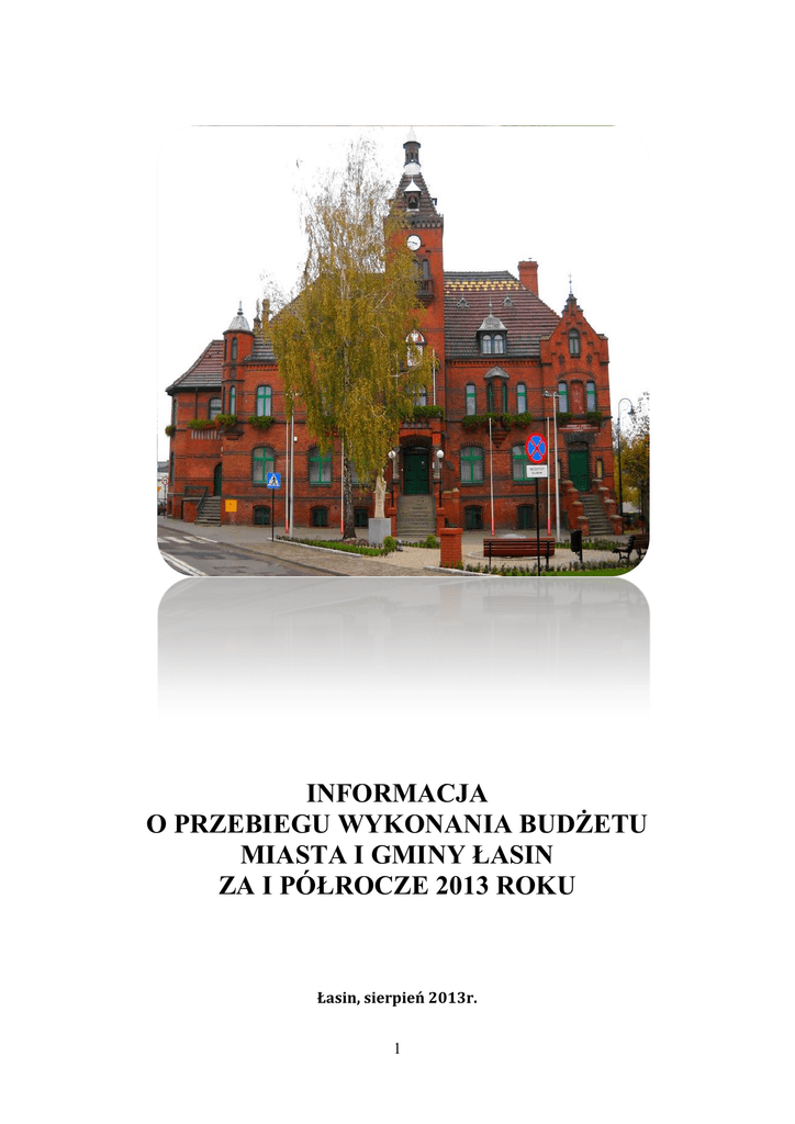 INFORMACJA O PRZEBIEGU WYKONANIA BUDŻETU MIASTA I GMINY ŁASIN ZA I PÓŁROCZE 2013 ROKU Łasin, sierpień 2013r. 1 Informacja z wykonania budżetu za I półrocze 2013 roku SPIS TREŚCI 1. 2. strona 3 4 Wstęp Informacja ogólna Część tabelaryczna 1. 2. 3. 4. 5. 6. 7. 8. 9. 10. 11. Dochody budżetu Miasta i Gminy Łasin za I półrocze 2013 roku wg działów klasyfikacji budżetowej Realizacja dochodów własnych za I półrocze 2013 roku Dochody wg źródeł powstania za I półrocze 2013 roku Skutki finansowe udzielonych ulg w podatkach i opłatach lokalnych za I półrocze 2013 roku Wydatki budżetu Miasta i Gminy Łasin za I półrocze 2013 roku wg działów i rozdziałów klasyfikacji budżetowej Struktura wykonania dochodów i wydatków budżetu Miasta i Gminy Łasin wg działów klasyfikacji budżetowej za I półrocze 2013 roku Sprawozdanie o nadwyżce/deficycie Miasta i Gminy Łasin za I półrocze 2013 roku Informacja o stanie zobowiązań i należności Miasta i Gminy Łasin na dzień 30 czerwca 2013 roku Realizacja zadań z zakresu administracji rządowej oraz innych zadań zleconych odrębnymi ustawami w I półroczu 2013 roku Dotacje udzielone z budżetu Miasta i Gminy Łasin do dnia 30 czerwca 2013 roku Realizacja funduszu soleckiego w I półroczu 2013 roku 7 8 9 10 11 14 15 17 18 20 22 Część opisowa 1. 2. 3. 4. 5. 6. 7. 8. 9. 10. Dochody Wydatki Realizacja zadań z zakresu administracji rządowej oraz innych zadań zleconych odrębnymi ustawami w I półroczu 2013 roku Realizacja wydatków majątkowych za I półrocze 2013 roku Informacja o gospodarowaniu dochodami budżetu gminy pochodzącymi z opłat i kar środowiskowych przeznaczonymi na finansowanie ochrony środowiska i gospodarki wodnej za I półrocze 2013 roku Informacja z wykonania planu finansowego samorządowego zakładu budżetowego za I półrocze 2013 roku Informacja o przebiegu wykonania planu finansowego samorządowej instytucji kultury Biblioteki Publicznej w Łasinie za I półrocze 2013 roku Informacja o przebiegu wykonania planu finansowego samorządowej instytucji kultury Miejsko-Gminnego Ośrodka Kultury i Sportu w Łasinie za I półrocze 2013 roku Informacja o przebiegu wykonania planu finansowego Samodzielnego Publicznego Zakładu Opieki Zdrowotnej w Łasinie za I półrocze 2013 roku Informacja o kształtowaniu się wieloletniej prognozy finansowej w I półroczu 2013 roku 2 25 45 77 79 84 85 91 93 98 102 Informacja z wykonania budżetu za I półrocze 2013 roku Zgodnie z art. 266 ustawy o finansach publicznych zarząd jednostki samorządu terytorialnego jest zobowiązany do dnia 31 sierpnia każdego roku przedstawić organowi stanowiącemu i regionalnej izbie obrachunkowej informację o przebiegu wykonania budżetu jednostki samorządu terytorialnego za I półrocze w szczegółowości nie mniejszej niż w uchwale budżetowej, informację o kształtowaniu się wieloletniej prognozy finansowej, w tym o przebiegu realizacji przedsięwzięć oraz informację o przebiegu wykonania planów finansowych jednostek, o których mowa w art. 9 pkt 10, 13 i 14 ustawy o finansach publicznych uwzględniającą w szczególności stan należności i zobowiązań, w tym wymagalnych. Mając na uwadze powyższe przedstawiam informację o przebiegu wykonania budżetu Miasta i Gminy Łasin za I półrocze 2013 roku, informację o kształtowaniu się wieloletniej prognozy finansowej Miasta i Gminy Łasin za I półrocze 2013 roku, w tym o przebiegu realizacji przedsięwzięć oraz informację o przebiegu wykonania planów finansowych Samodzielnego Publicznego Zakładu Opieki Zdrowotnej w Łasinie oraz samorządowych instytucji kultury tj. Biblioteki Publicznej w Łasinie oraz Miejsko-Gminnego Ośrodka Kultury i Sportu w Łasinie. Burmistrz Miasta i Gminy Łasin Franciszek Kawski 3 Informacja z wykonania budżetu za I półrocze 2013 roku Informacja ogólna Budżet Miasta i Gminy Łasin uchwalony uchwałą Nr XXII/140/2012 z dnia 27 grudnia 2012 roku wraz ze zmianami do dnia 30 czerwca 2013 roku przedstawia się następująco: Wyszczególnienie Uchwalony plan budżetu DOCHODY w tym 1. dochody bieżące w tym: dotacje i środki na finansowanie wydatków na realizację zadań finansowanych udziałem środków, o których mowa w art. 5 ust.1 pkt 2 i 3 2. dochody majątkowe w tym: dotacje i środki otrzymane na inwestycje z tego: dotacje i środki na finansowanie wydatków na realizację zadań finansowanych udziałem środków, o których mowa w art. 5 ust.1 pkt 2 i 3 dochody z tytułu odpłatnego nabycia prawa własności oraz prawa użytkowania wieczystego nieruchomości dochody z tytułu przekształcenia prawa użytkowania wieczystego przysługującego osobom fizycznym w prawo własności WYDATKI w tym - wydatki bieżące w tym: - wydatki jednostek budżetowych z tego: wynagrodzenia i składki od nich naliczone wydatki związane z realizacją ich statutowych zadań - dotacje na zadania bieżące - świadczenia na rzecz osób fizycznych - wydatki na programy finansowane z udziałem środków, o których mowa w art. 5 ust.1 pkt 2 i 3 - wypłaty z tytułu udzielonych poręczeń i gwarancji - obsługa długu - wydatki majątkowe w tego: - inwestycje i zakupy inwestycyjne w tym: wydatki na programy finansowane z udziałem środków, o których mowa w art. 5 ust.1 pkt 2 Nadwyżka Przychody -spłata udzielonych pożyczek -wolne środki, o których mowa w art. 217 ust. 2 pkt 6 ustawy Rozchody - spłata zaciągniętej pożyczki -udzielone pożyczki Plan po zmianach 23.005.910,00 25.228.964,03 22.364.440,00 0,00 24.324.944,03 212.599,00 641.470,00 507.470,00 507.470,00 904.020,00 770.020,00 710.020,00 130.000,00 130.000,00 4.000,00 4.000,00 22.250.710,00 24.809.764,03 20.694.269,00 15.499.614,00 10.767.442,00 4.732.172,00 803.000,00 4.186.705,00 24.950,00 23.026.613,03 16.951.038,03 10.908.871,16 6.042.166,87 853.000,00 4.803.101,00 239.474,00 0,00 180.000,00 1.556.441,00 0,00 180.000,00 1.783.151,00 1.556.441,00 846.8