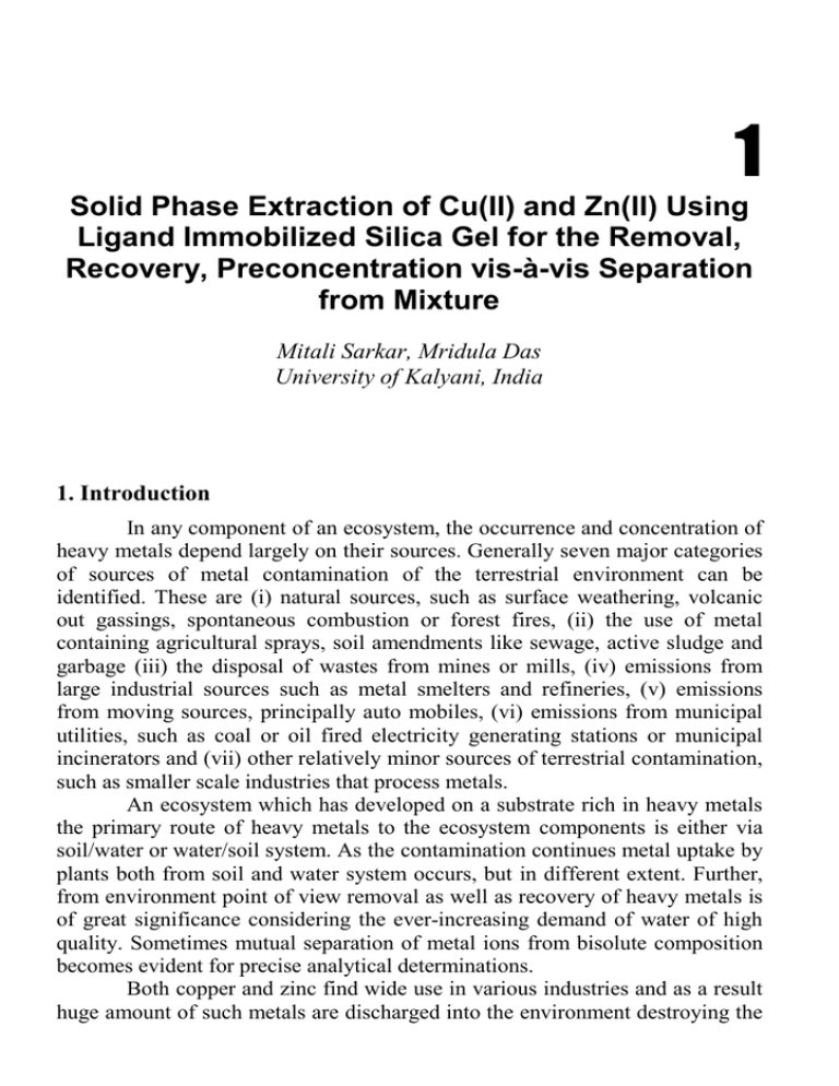 1 Solid Phase Extraction of Cu(II) and Zn(II) Using Ligand Immobilized Silica Gel for the Removal, Recovery, Preconcentration vis-à-vis Separation from Mixture Mitali Sarkar, Mridula Das University of Kalyani, India 1. Introduction In any component of an ecosystem, the occurrence and concentration of heavy metals depend largely on their sources. Generally seven major categories of sources of metal contamination of the terrestrial environment can be identified. These are (i) natural sources, such as surface weathering, volcanic out gassings, spontaneous combustion or forest fires, (ii) the use of metal containing agricultural sprays, soil amendments like sewage, active sludge and garbage (iii) the disposal of wastes from mines or mills, (iv) emissions from large industrial sources such as metal smelters and refineries, (v) emissions from moving sources, principally auto mobiles, (vi) emissions from municipal utilities, such as coal or oil fired electricity generating stations or municipal incinerators and (vii) other relatively minor sources of terrestrial contamination, such as smaller scale industries that process metals. An ecosystem which has developed on a substrate rich in heavy metals the primary route of heavy metals to the ecosystem components is either via soil/water or water/soil system. As the contamination continues metal uptake by plants both from soil and water system occurs, but in different extent. Further, from environment point of view removal as well as recovery of heavy metals is of great significance considering the ever-increasing demand of water of high quality. Sometimes mutual separation of metal ions from bisolute composition becomes evident for precise analytical determinations. Both copper and zinc find wide use in various industries and as a result huge amount of such metals are discharged into the environment destroying the Mitali Sarkar, Mridula Das natural balance of the ecosystem in various ways [1]. Copper is largely used in electrical machinery and for electroplating. The main use of zinc is for the manufacturing of several useful alloys and as the anode material in galvanic cells. Discharge of wastes from such industries increase the load of metal contamination, which in turn enter the different components of the ecosystem. Copper is known to affect plant growth and may induce changes in metabolism. In human beings copper accumulates in liver, brain, kidney and cornea. Ingestion of excessive amounts of oral copper salts, most frequently copper sulphate, may produce death. Copper poisoning producing hemolytic anemia has been reported in case of burn treatment with copper compounds or as the result of using copper containing dialysis equipment. Zinc toxicity from excessive ingestion is uncommon but gastrointestinal distress and diarrhea has been known following ingestion of beverages standing in galvanized cans or from use of galvanized utensils. With regard to industrial exposure, metal fume fever resulting from inhalation of freshly formed fumes of zinc presents the most significant effect. In view of the load and degree of toxicity of Cu(II) and Zn(II) the minimization of toxicity becomes a prime requirement [2, 3]. Removal of metal toxicants from aqueous environment becomes critical as well as a challenging task to the chemists and environmentalists as they are non biodegradable and have long residence time in the environment. Sometimes the preconcentration from a large volume of aqueous samples becomes a primary step. Recent progress in chemical analysis of trace metal ions is mainly connected with the evaluation and improvement of various separation and trace concentration methods. Liquid-liquid extraction has long been used for the removal of metal ions from aqueous samples but the large volume of solvent, tedious process and large through output led the scientists in search of alternative techniques. Solid phase extraction method using some solid extractants, as have some advantages over liquid-liquid extraction, is now gaining the popularity. The solid extractants range from the natural materials to synthetic materials as well as the biomaterials [4]. Ion exchange materials [5, 6], activated carbon [7, 8] and activated slag [9] are widely used for the purpose of metal ion separation and recovery. Chelate polymer impregnated over solid substances like polyurethane foam and cellulose [10÷12] show their marked potential. In our laboratory ligand immobilized over silica gel was successfully used for the enrichment of metal ions and decontamination or purification of alkali metal, alkaline earth metal and ammonium salts [13÷15]. Silica gel, as a solid support for ligand immobilization, has some special advantages like less swelling property, high resistance towards heat and acid treatment. For the synthesis of solid phase extractant silica gel surface can be modified with chelating ligands either via 16 Środkowo-Pomorskie Towarzystwo Naukowe Ochrony Środowiska Solid Phase Extraction of Cu(II) and Zn(II) using Ligand Immobilized ... physical treatment [14], chemical reaction [16÷20]. The present communication deals with solid phase extraction of Cu(II) and Zn(II) using ligand immobilized silica gel for the removal, recovery, preconcentration vis-à-vis separation from bisolute composition. 2. Experimental 2.1. Apparatus Batch experiment was performed in glass container with 1g of the solid extractant. A glass column (160 x 6 mm i.d) with a coarse sintered glass disc and a tap at the bottom was used for the column study. The absorbance spectra of the solution were registered with a UV-VIS Spectrophotometer (Shimadzu PC 1401). The IR spectra were registered with an IR spectrophotometer (Perkin Elmer L120-000A), samples being prepared as thin films between KBr windows. A Systronics pH meter (Model 324) with glass electrode was used for pH measurements. Voltammetric experiments of the metal solutions were performed with an electrochemistry apparatus