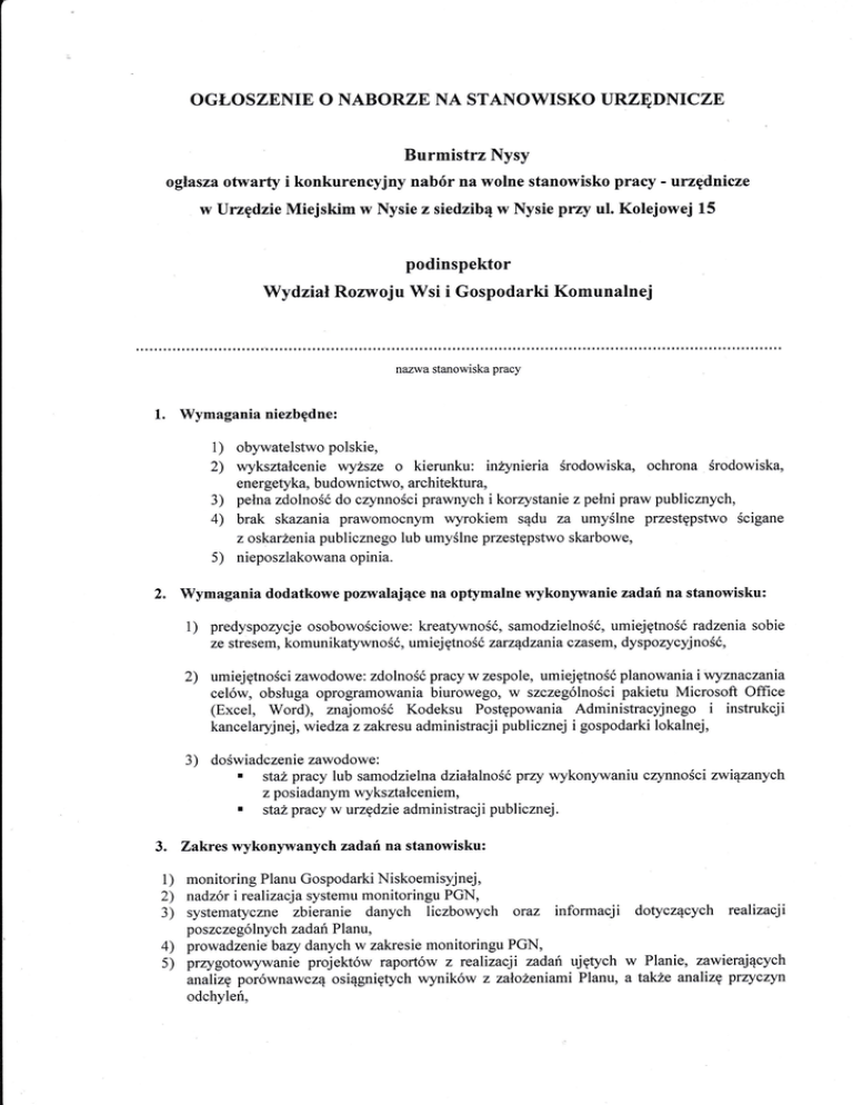 OGŁOSZENIE O NABORZE NA STANOWISKO URZĘDNICZE Burmi§trz Nysy ogłasza otwarty i konkurencylny nabór na wolne stanowisko pracy - urzędnicze w Urzędzie Miejskim w Nysie z siedzibą w Nysie prry ul. Kolejowej 15 podinspektor Wydział Rozwoju Wsi i Gospodarki Komunalnej nazwa stanowiska pracy 1. Wymagania niezbędne: 1) obywatelstwo polskie, ż) wyksźałceniewyższe o kierunku: inż,ynieria środowiska, ochrona środowiska, energetyka, budownictwo, architektura, pełna zdolnośó do czynności prawnych i korzystanie z pełni praw publicznych, 3) 4) brak 5) 2. skazania prawomocnym wyrokiem sądu za umyślneprzestępstwo ścigane z oskarzenia publicznego lub umyślne przestępstwo skarbowe, nieposzlakowana opinia. Wymagania dodatkowe pozrłalające na optymalne wykonywanie zadań na stanowisku: 1) predyspozycje osobowościowe: keatywnośó, samodzielnośó, umiejętnośó radzenia sobie ze stresem, komunikatywnośó, umiejętnośćzarządzartia czasem, dyspozycyjnośó, 2) umiejętnościzawodowe: zdolnośó pracy w zespole, umiejętnośó planowania iryznaczania celów, obsługa oprogramowania biurowego, w szczególności pakietu Microsoft Office instrukcji (Excel, Word), znajomośó Kodeksu Postępowania Administracyjnego kancelaryjnej, wiedza zzakręsu administracji publicznej i gospodarki lokalnej, i 3) doświadczenie zawodowe: stuż pracy lub samodzielna działalnośóprzy wykonywaniu czynności rwiązanych z posiadanym wykształceniem, stażpracy w urzędzie administracji publicznej. . J 3. 1) 2) 3) 4) 5) Zakres wykonywanych zadań na stanowisku: monitoring Planu Gospodarki Niskoemisyjnej, nadzót irea|izacja systemu monitoringu PGN, systematyczre zbieranie danych liczbowych otaz informacji dotyczących realizacji po szcze gólny ch zadań Planu, prowadzeniebazy danych w zakesie monitoringu PGN, przygotowywanie pĄektów raportów z rea|izacji zadń ńętych w Planie, zawierających analizę porównawczą osiągniętych wyników z zaŁożeniarti Planu, a tŃlże analizę przyczyn odchyleń, opracowywanie projektów zaplanowanych działań korygujących, ich przeprowadzanie, aktualizacja Planu, 7) utrrymanie terenów gminnych w zakresie czystości i porządku, zielęni i małej architektury, 8) nadzorowanie utrzymania i funkcjonowania szaletów miejskich, 9) prowadzenie spraw w zakresie uttzymania gminnych cieków wodnych, i0) utrzymanie podwórek gminnych, 11) współdziałanie inadzór w zakresie zarządzania i utrrymania cmentarzy komunalnych, 12) orgarńzowanie współdziałania ze wspólnotami i sołectwami w zakresie wyżej wymienionych 6) spraw, ) organizowanie i nadzor okolicznościowych dekoracj i miastao 14) utrzymanię tęrenów niebędących poza stałym harmonogramem, 1 3 lS)przygotowywanie projektów zarządzeń burmistrza oraz innych materiałów określonych zakresem stanowiska, 16) przygotowywanie projektów uchwał i materiałów informacyjnych na sesje rady miejskiej i posiedzenia komisji rady w zakresie powierzonych obowiązków, 17) obsługa edytora aktów prawnych XML, 18) prrygotowywanie projektów odpowiedzi na interpelacje, zapytania i wnioski radnych oraz skargi, zńalenia,pytania i wnioski, atakże petycje mięszkańców w zakresie spraw doĘczących stanowiska, 19) opracowywarrie projektów decyzji administracyjnych wynikających z zakresu działania stanowiska, 20) gospodarowanie środkamibudżetowymi wraz zamówień publicznych, przeznaazonymi na w indywidualnych sprawach z opracowywaniem dokumentów w zadania będące i zajmowanego stanowiska, w żl)udziałw terenowych inspekcjach i kontrolach wynikających z zakresu i z indywidualnych upoważnień realizowanych przez wydziń. 4, 1) 2) 3) zakresie kompetencji vlydziŃa zadań na stanowisku Informacja o warunkach pracy na stanowisku: praca w pełnym wymiarze czasu pracy, wyposażenie stanowiska pracy: komputer, drukarka, telefon, ftzyczne warunki pracy: praca koncepcyjna z obsługą komputera wymagająca sprawności obu rąk i wymuszonej pozycji siedzącej, pokój biurowy ogrzęwany i oświetlony, obsługa komputera powyżej połolvy dobowego wymiaru czasu pracy, zakres zadań obejmuje również pracę w terenie, występujące w miejscu wykonywania czynnościzawodowych: wykonywanie pracy w wymuszonej pozycji siedzącej powoduje obciążenie kręgosłupa oraz staĘczne obciążenie mięśnitułowia, pracownik jest narażony na syndrom Sicca. 4) uciążliwościftzycnte 5. Informacja o wskaźniku zatrudnienia osób niepełnosprawnych: W miesiącu poprzedzającym datę upublicznienia niniejszego ogłoszenia wskaźnik zatrudnienia osób niepełnosprawnych wTJrzędzie Miejskim w Nysie w rozumieniu przepisów o rehabilitacji zawodowej i społecznej orazzatrudnianiu osób niepełnosprawnych, nie przekroczył 6%. 6, Wymagane dokumenĘ: 1) 2) list motywacyjny, życiorys - curriculum vitae z informacjami o wyksźałceniu i opisem dotychczasowego przebiegu pracy zawodowej, 3) 4) 5) 6) 7) 8) 9) kwestionariusz osobowy według wzoru dostępnego na stronie internetowej Urzędu Miejskiego w Nysie lub w Komórce Kadr Wydziału Administracyjnego Urzędu Miejskiego w Nysie, kserokopie świadęctwpracy, zaświadczenie o zatrudnieniu w ramach umowy o pracę (eżeli kandydat takie posiada), kserokopia dyplomu ukończenia studiów vlyższych, kserokopie zaświadczęń o ukończonych kursach i szkoleniach (eżeli kandydat takie posiada), opinie, referencje (eżeli kandydattakie posiada), oświadczenie o pełnej zdolnoścido cąłrnościprawnych publicznych, i korzystaniu z pehri praw oświadczenie o niekaralności za przestępstwo popełnione umyślnie, ścigane z oskarżenia publicznego lub umyślne przestępstwo skarbowe, 1 0) kserokopia dokumentu potwierdzającego niepełnosprawnośó* * w prrypadku osoby niepehrosprawnej, która zatnięrza skorzystać z uprawnienia wynikającego z art, l3a ustawy z dniaZl listopada 2008r. o pracownikach samorządowych (Dz. U, z2016r, poz.902) Druk kwestionariusza osobowego jest dostępny na