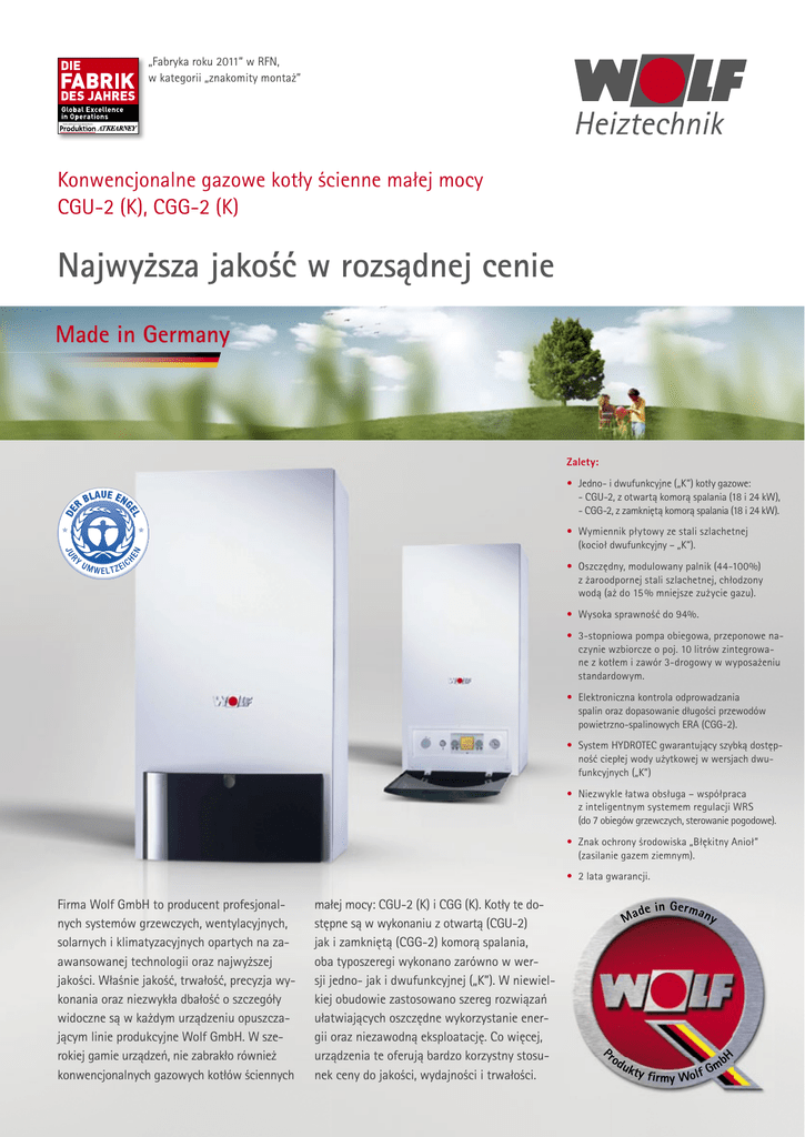 „Fabryka roku 2011” w RFN, w kategorii „znakomity montaż” Konwencjonalne gazowe kotły ścienne małej mocy CGU-2 (K), CGG-2 (K) Najwyższa jakość w rozsądnej cenie Made in Germany Zalety: • Jedno- i dwufunkcyjne („K”) kotły gazowe: - CGU-2, z otwartą komorą spalania (18 i 24 kW), - CGG-2, z zamkniętą komorą spalania (18 i 24 kW). • Wymiennik płytowy ze stali szlachetnej (kocioł dwufunkcyjny – „K”). • Oszczędny, modulowany palnik (44-100%) z żaroodpornej stali szlachetnej, chłodzony wodą (aż do 15 % mniejsze zużycie gazu). • Wysoka sprawność do 94%. • 3-stopniowa pompa obiegowa, przeponowe naczynie wzbiorcze o poj. 10 litrów zintegrowane z kotłem i zawór 3-drogowy w wyposażeniu standardowym. • Elektroniczna kontrola odprowadzania spalin oraz dopasowanie długości przewodów powietrzno-spalinowych ERA (CGG-2). • System HYDROTEC gwarantujący szybką dostępność ciepłej wody użytkowej w wersjach dwufunkcyjnych („K”) • Niezwykle łatwa obsługa – współpraca z inteligentnym systemem regulacji WRS (do 7 obiegów grzewczych, sterowanie pogodowe). • Znak ochrony środowiska „Błękitny Anioł” (zasilanie gazem ziemnym). • 2 lata gwarancji. Firma Wolf GmbH to producent profesjonalnych systemów grzewczych, wentylacyjnych, solarnych i klimatyzacyjnych opartych na zaawansowanej technologii oraz najwyższej jakości. Właśnie jakość, trwałość, precyzja wykonania oraz niezwykła dbałość o szczegóły widoczne są w każdym urządzeniu opuszczającym linie produkcyjne Wolf GmbH. W szerokiej gamie urządzeń, nie zabrakło również konwencjonalnych gazowych kotłów ściennych małej mocy: CGU-2 (K) i CGG (K). Kotły te dostępne są w wykonaniu z otwartą (CGU-2) jak i zamkniętą (CGG-2) komorą spalania, oba typoszeregi wykonano zarówno w wersji jedno- jak i dwufunkcyjnej („K”). W niewielkiej obudowie zastosowano szereg rozwiązań ułatwiających oszczędne wykorzystanie energii oraz niezawodną eksploatację. Co więcej, urządzenia te oferują bardzo korzystny stosunek ceny do jakości, wydajności i trwałości. Ma Pr od ukt de in Ger ma ny y firmy Wolf G mb H Konwencjonalne gazowe kotły ścienne CGU-2 (K), CGG-2 (K) Tylko najlepsze rozwiązania Kotły CGU-2 (K), CGG-2 (K) z powodzeniem znajdują zastosowanie w mieszkaniach oraz domach jednorodzinnych. Niewielkie wymiary oraz minimalne ograniczenia związane z odległościami od ścian bocznych, dają użytkownikowi szerokie możliwości montażu. Tak jak wszystkie produkty Wolf, również i te kotły są w 100 % wyprodukowane w niemieckich fabrykach firmy Wolf GmbH w Mainburgu. Jest to gwarancją najwyższej jakości „made in Germany”. Gaz ziemny jest jednym z najbardziej atrakcyjnych paliw ze względu na koszty eksploatacji w Polsce. Zasilane nim konwencjonalne kotły grzewcze, są coraz bardziej doskonalsze technologicznie i ekonomiczne. Dodatkowo, kotły ścienne CGU-2 (K), CGG-2 (K) firmy Wolf GmbH oferują bardzo korzystny stosunek ceny do jakości. iż kotły zostały wykonane zgodnie z obowiązującymi normami Unii Europejskiej, to ich parametry przewyższają większość wymogów prawnych. Dodatkowo, niska emisja substancji szkodliwych do środowiska została potwierdzona znakiem „Błękitny Anioł”. CGU-2 (K), CGG-2 (K) współpracują z inteligentnym systemem regulacji WRS Kotły CGU-2 (K) i CGG-2 (K) firmy Wolf GmbH to przykład zastosowania szeregu nowoczesnych rozwiązań technicznych pozwalających na uzyskanie wysokiej sprawności sięgającej 94 %, a także cichej i oszczędnej pracy. W kotłach zastosowano modulowany palnik (44-100 %) wykonany z żaroodpornej stali szlachetnej chłodzony wodą, charakteryzujący się niskim zużyciem gazu (oszczędność do 15 %). Elektroniczne sterowanie zapłonem, kontrola płomienia oraz płynna regulacja mocy pozwalają na precyzyjne dostosowanie wydajności kotła do aktualnych potrzeb instalacji c.o. i c.w.u. Nie dziwi więc fakt, że mimo Kotły CGU-2 (K) i CGG-2 (K) zostały standardowo wyposażone w regulowaną 3-stopniową pompę obiegową, wbudowane naczynie przeponowe o pojemności 10 litrów, a także zawór 3-drogowy. Nad bezpieczeństwem użytkowania czuwa elektroniczna kontrola odprowadzania spalin oraz dopasowanie długości przewodów powietrzno-spalinowych ERA (CGG-2). Nie zapomniano również o wysokim komforcie użytkowania, np. nowo opracowany system HYDROTEC gwarantuje dostępność ciepłej wody użytkowej w wersjach dwufunkcyjnych („K”) bez niepotrzebnego czekania. Użytkownik będzie mógł na co dzień docenić również niezwykłą łatwość obsługi modułu obsługowego BM, będącego „sercem” systemu regulacji WRS, który daje możliwość obsługi do 7 obiegów grzewczych oraz pracy w trybie pogodowym. Konwencjonalny kocioł gazowy (z otwartą komorą spalania) jednofunkcyjny Do współpracy z gazowymi kotłami ściennymi, firma Wolf GmbH opracowała m.in. stojący, stalowy, podwójnie emaliowany podgrzewacz c.w.u. CSW-120 o pojemności 115 litrów, który przystosowany jest do montażu pod kotłem. Jego najwyższą jakość wykonania oraz wysokie parametry techniczne zostały potwierdzone 5-letnią gwarancją. Konwencjonalny kocioł gazowy (z zamkniętą komorą spalania) dwufunkcyjny jednofunkcyjny dwufunkcyjny CGU-2-18 CGU-2-24 CGU-2K-18 CGU-2K-24 CGG-2-18 CGG-2-24 CGG-2K-18 CGG-2K-24 kW 8-18 10,9-27 8-18 10,9-24 8-18 10,9-24 8-18 10,9-24 Sprawność % do 93 do 94 do 93 do 94 do 94 do 94 do 94 do 94 Maks. temp. wody ciepłej 1) °C – – 55 55 – – 55 55 Pojemność naczynia wzbiorczego l 10 10 10 10 10 10 10 10 Maksymalny pobór mocy/standby W 83/6 83/6 83/6 83/6 120/6 120/6 120/6 120/6 Dane techniczne Zakres mocy Wymiary (szer. x gł. x wys.) Ciężar całkowity mm kg Przyłącze elektryczne V/Hz 440 x 393 x 855 39 41 440 x 393 x 855 39 440 x 393 x 855 41 42 43,5 440 x 393 x 855 42 43,5 230/50 1) wartości odniesione do wody zimnej o temperat