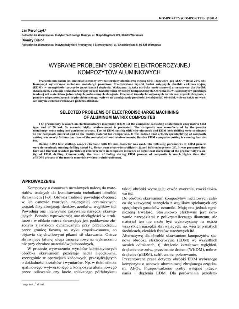 KOMPOZYTY (COMPOSITES) 1(2001)2 Jan Perończyk1 Politechnika Warszawska, Instytut Technologii Maszyn, al. Niepodległości 222, 00-663 Warszawa Dionizy Biało2 Politechnika Warszawska, Instytut Inżynierii Precyzyjnej i Biomedycznej, ul. Chodkiewicza 8, 02-525 Warszawa WYBRANE PROBLEMY OBRÓBKI ELEKTROEROZYJNEJ KOMPOZYTÓW ALUMINIOWYCH Przedmiotem badań jest materiał kompozytowy zawierający aluminiową osnowę 6061 i fazę zbrojącą Al2O3 w ilości 20% obj. Kompozyt wytworzono metodami metalurgii proszków. Przedstawiono wyniki badań wstępnych obróbki elektroerozyjnej (EDM), w szczególności procesów przecinania i drążenia. Wykazano, że taka obróbka może stanowić alternatywny dla obróbki skrawaniem, a czasem bezkonkurencyjny proces kształtowania wyrobów kompozytowych. Obróbka EDM kompozytów przebiega trudniej niż materiałów jednorodnych pozbawionych zbrojenia. Obecność twardych i odpornych termicznie cząstek zbrojenia, a ponadto nieprzewodzących prądu elektrycznego wpływa na zmniejszenie prędkości (wydajności) obróbki, wpływa także na większe zużycie elektrod roboczych podczas obróbki. SELECTED PROBLEMS OF ELECTRODISCHARGE MACHINING OF ALUMINUM MATRIX COMPOSITES The preliminary research on electrodischarge machining (EDM) of the composite consisting of aluminum alloy matrix 6061 type and of 20 vol. % ceramic Al2O3 reinforcement is presented. The composite was manufactured by the powder metallurgy route using hot extrusion process. Test of EDM cutting with wire electrode and EDM hole drilling were conducted on the composite material and on the matrix material for comparison. It was noticed that velocity (productivity) of composite cutting was nearly 7-times less than of the material without reinforcements. Besides EDM composite cutting is running less stable. During EDM hole drilling, cooper electrode with 0.5 mm diameter was used. The following parameters of EDM process were determined: running drilling speed Vśr, linear wear electrode coefficient ϑL and hole enlargement 2Sb. It was presented that hard and thermal resistant particles of reinforcement in composite influence on significant decreasing of the productivity (velocity) of EDM drilling. Concurrently, the wear of holing during EDM process of composite is much higher than that of EDM process of the matrix materials (without reinforcements). WPROWADZENIE Kompozyty o osnowach metalowych należą do materiałów trudnych do kształtowania technikami obróbki skrawaniem [1-3]. Główną trudność powoduje obecność w ich osnowie twardych, najczęściej ceramicznych, cząstek fazy zbrojącej: tlenków, azotków, węglików itd. Powodują one intensywne zużywanie narzędzi skrawających. Ponadto wprowadzają one nieciągłości w strukturze i w efekcie ostrze skrawające jest poddawane złożonym zjawiskom dynamicznym przy przechodzeniu przez granicę fazową na styku cząstka-osnowa, co objawia się chwilowymi pikami sił skrawania. Ostrze skrawające łatwiej ulega zmęczeniowemu wykruszaniu niż przy obróbce materiałów jednorodnych. W procesie wytwarzania wyrobów kompozytowych obróbka skrawaniem pozostaje nadal nieodzowna, szczególnie w operacjach końcowych, przesądzających o dokładności kształtów i wymiarów. Np. w tłoku silnika spalinowego wytworzonego z kompozytu aluminiowego przez odlewanie czy kucie spiekanego półfabrykatu 1 mgr inż., 2 dr inż. takiej obróbki wymagają: otwór sworznia, rowki tłokowe itd. Do obróbki skrawaniem kompozytów metalowych zaleca się zazwyczaj narzędzia z węglików spiekanych czy specjalnych gatunków ceramiki. Mają one jednak ograniczoną trwałość. Stosunkowo efektywne jest skrawanie narzędziami z polikrystalicznego diamentu, ale materiał ten nie może być wykorzystany na ostrza wszystkich narzędzi skrawających, np. wierteł o małych średnicach, cienkich frezów tarczowych itd. Alternatywę dla obróbki skrawaniem kompozytów stanowi obróbka elektroerozyjna (EDM) we wszystkich swoich odmianach, tj. drążenie kształtowe wgłębień, drążenie otworów, przecinanie drutem (WEDM), mikrodrążenie (μEDM), szlifowanie, polerowanie. Prezentowana praca dotyczy obróbki EDM wybranego kompozytu o osnowie aluminiowej zbrojonego cząstkami Al2O3. Przeprowadzono próby wstępne przecinania i drążenia EDM. Dla porównania przedsta- 212 J. Perończyk, D. Biało wiono wyniki obróbki EDM niezbrojonej osnowy kompozytu. MATERIAŁ KOMPOZYTOWY Do wytworzenia materiału kompozytowego użyto proszku ze stopu aluminium o symbolu 6061 i proszku tlenku glinu. Proszek 6061 stanowiący materiał osnowy kompozytu zawierał: Al+1,1%Mg+0,6%Si+0,5%Fe+ +(Cu, Cr, Zn, Ti razem) 0,45%. Proszek wytworzony został metodą rozpylania ciekłego metalu argonem. Proszek miał cząstki o nieregularnym obłym kształcie i przeciętnej ziarnistości ok. 50 μm. Proszek Al2O3 stanowiący fazę zbrojącą kompozytu miał cząstki o nieregularnym kształcie z ostrymi narożami i krawędziami oraz ziarnistości 22÷36 μm. Proces wytworzenia kompozytu [4] obejmował następujące etapy: - mieszanie odważonych porcji proszku osnowy i proszku Al2O3, - prasowanie matrycowe cylindrycznych kształtek przy ciśnieniu 150 MPa do gęstości względnej 82÷86%, - spiekanie kształtek z odgazowaniem w piecu muflowym w temperaturze 590oC w czasie 1 godziny w atmosferze przepływającego azotu, - wyciskanie (ekstruzja) na gorąco w temperaturze 450oC, przy stopniu redukcji 1:20 i prędkości wyciskania 3 m/min. a) b) Na rysunku 1 przedstawiono zgłady metalograficzne materiału osnowy i otrzymanego kompozytu. Kompozyt zawiera 20% obj. fazy zbrojącej. Jak widać, proces wytwórczy kompozytu przez ekstruzję na gorąco zapewnia otrzymanie struktury o pełnym, 100% zagęszczeniu i dość równomiernym rozproszeniu zbrojenia w osnowie. PRZECINANIE ELEKTROEROZYJNE Przecinanie EDM prowadzono na obrabiarce firmy Charmilles typu 290P. Jako narzędzie zastosowano drut mosiężny o 