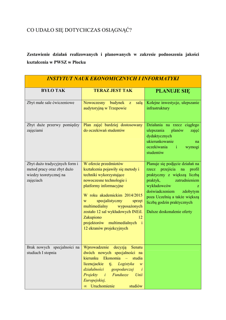 CO UDAŁO SIĘ DOTYCHCZAS OSIĄGNĄĆ? Zestawienie działań realizowanych i planowanych w zakresie podnoszenia jakości kształcenia w PWSZ w Płocku INSTYTUT NAUK EKONOMICZNYCH I INFORMATYKI BYŁO TAK Zbyt małe sale ćwiczeniowe TERAZ JEST TAK Nowoczesny budynek z audytoryjną w Trzepowie PLANUJE SIĘ salą Kolejne inwestycje, ulepszanie infrastruktury Zbyt duże przerwy pomiędzy Plan zajęć bardziej dostosowany Działania na rzecz ciągłego zajęciami do oczekiwań studentów ulepszania planów zajęć dydaktycznych ukierunkowanie na oczekiwania i wymogi studentów Zbyt dużo tradycyjnych form i metod pracy oraz zbyt dużo wiedzy teoretycznej na zajęciach W ofercie przedmiotów kształcenia pojawiły się metody i techniki wykorzystujące nowoczesne technologie i platformy informacyjne Planuje się podjęcie działań na rzecz przejścia na profil praktyczny z większą liczbą praktyk, zatrudnieniem wykładowców z doświadczeniem zdobytym W roku akademickim 2014/2015 poza Uczelnią a także większą w specjalistyczny sprzęt liczbą godzin praktycznych multimedialny wyposażonych zostało 12 sal wykładowych INEiI. Dalsze doskonalenie oferty Zakupiono 12 projektorów multimedialnych i 12 ekranów projekcyjnych Brak nowych specjalności na Wprowadzenie decyzją Senatu studiach I stopnia dwóch nowych specjalności na kierunku Ekonomia – studia licencjackie tj. Logistyka w działalności gospodarczej i Projekty i Fundusze Unii Europejskiej, • Uruchomienie studiów inżynierskich na kierunku Informatyka, • Pozytywna opinia Komisji Akredytacyjnej dotycząca kierunku Matematyka (2013/2014) Braku lokalu W roku 2014 uruchomiony został gastronomicznego w Instytucie barek gastronomiczny na terenie Nauk Ekonomicznych i Instytutu. Obecnie studenci mają Informatyki zatem możliwość zakupu kawy, herbaty, jak również małego posiłku. Brak specjalistycznych programów statystycznych i informatycznych dla studentów INEiI W celu podniesienia poziomu Kontynuowanie zakupu prowadzenia zajęć na kierunkach specjalistycznych programów matematyka, informatyka i komputerowych ekonomia zostało zakupione nowe oprogramowanie UNITY 3D do tworzenia grafiki komputerowej dla Instytutu Nauk Ekonomicznych i Informatyki. Począwszy od roku akademickiego, tj. 2015/2016 program statystyczny STATISTICA (zakupiony na użytek kierunku zamawianego matematyka bankowa i ubezpieczeniowa) przeszedł na własność PWSZ w Płocku i jest wykorzystywany przez studentów pozostałych kierunków. Problemy komunikacyjne W roku 2014 ukończona została związane z dojazdem do INEiI budowa parkingu w Trzepowie. w Trzepowie Udostępnienie parkingu studentom przynajmniej częściowo zlikwidowało problemy komunikacyjne dla osób dojeżdżających do Trzebowa własnym samochodem. Dla zwiększenia komfortu studiowania studentów Instytutu i zminimalizowania problemów związanych z dojazdem do Lepsze dostosowanie planu zajęć do harmonogramu odjazdów i przyjazdów autobusów. Trzepowa zajęcia odbywają się w miarę możliwości w blokach 2-3 dniowych. Brak stosowania w niektórych W Uczelni obowiązuje teraz przypadkach obiektywnych ujednolicony Wewnątrzuczelniany Dalsze doskonalenie procesu kryteriów oceniania studentów System Oceniania Studentów Wszyscy wykładowcy podają na początku trwania semestru warunki i kryteria zaliczenia przedmiotu Niewystarczająca komputerowa, zbyt rzutników w salach baza Nowe rzutniki mało multimedialne i tablice Planuje się uruchomienie stanowisk z połączeniem internetowym w budynku Instytutu Nauk Humanistycznych i W czytelni Biblioteki PWSZ przy ul. zostało uruchomionych 10 Społecznych, stanowisk komputerowych (z Gałczyńskiego. W budynku dostępem do Internetu) dla tym odbywają się m.in. zajęcia na studiach studentów wszystkich kierunków. niestacjonarnych na kierunku ekonomia a także zajęcia na kierunku informatyka. Brak na lektoratach Przeprowadzenie testów Dalsze doskonalenie procesu. zróżnicowania grup ze poziomujących dla studentów względu na poziom językowy rozpoczynających naukę języka obcego w ramach lektoratu. Na podstawie uzyskanych wyników tworzone są grupy językowe według poziomu zaawansowania. Brak dostępu do Wi-Fi W celu poprawy dostępności bezprzewodowego Internetu dla studentów uruchomiono sieć punktów hot spot Obecnie funkcjonuje 51 takich punktów. W budynku Instytutu Nauk Ekonomicznych i Informatyki „Stary budynek / Rozbudowę systemu informatycznego Instytutu Dodatkowo na 2016 rok zostało zaplanowane wdrożenie poczty elektronicznej w domenie pwszplock.pl dla wszystkich Pałacyk”– Trzepowo Nowe 55 jest 6 takich punktów a w „Budynku auli”– Trzepowo Nowe 55 funkcjonują 4 punkty hot spot. wykładowców. Uruchomienie poczty elektronicznej dla pracowników Uczelni zwiększy możliwości komunikowania się wykładowców z studentami i odwrotnie. INSTYTUT NAUK HUMANISTYCZNYCH I SPOŁECZNYCH BYŁO TAK TERAZ JEST TAK PLANUJE SIĘ Zbyt późny termin przedstawienia planów studiów na semestr zimowy i letni, który nie zawsze jest dostosowany do potrzeb i oczekiwań Sudetów Brak możliwości wyboru promotora przez wszystkich studentów. Plan studiów zostaje umieszczony na stronie internetowej studentów w drugiej połowie września. Udoskonalić prace związane z wcześniejszym zamieszczaniem planu zajęć na stronie WWW INHS Każdy promotor ma przydzieloną liczbę seminarzystów Włączyć studentów do rozwiązania problemu Brak możliwości kontynuowania studiów w tym samym instytucie Studia magisterskie na kierunku pedagogika Uruchomienie studiów magisterskich na kierunku filologia Nadal brak stosowania w niektórych przypadkach obiektywnych kryteriów oceniania studentów *W Uczelni obowiązuje teraz ujednolicony Wewnątrzuczelniany System Oceniania Studentów Włączyć studentów do konstruowania kryteriów oceniania *Wszyscy wykładowcy podają na początku trwania semestru warunki i kryteria zaliczen