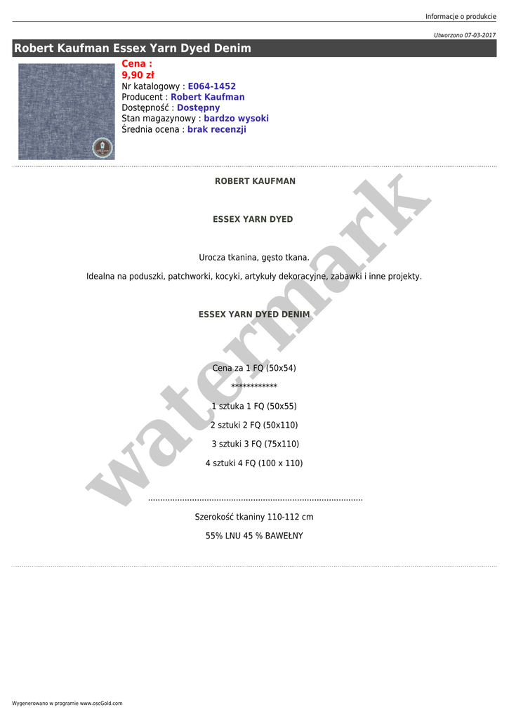 Informacje o produkcie Utworzono 07-03-2017 Robert Kaufman Essex Yarn Dyed Denim Cena : 9,90 zł Nr katalogowy : E064-1452 Producent : Robert Kaufman Dostępność : Dostępny Stan magazynowy : bardzo wysoki Średnia ocena : brak recenzji er m ar k ROBERT KAUFMAN ESSEX YARN DYED Urocza tkanina, gęsto tkana. Idealna na poduszki, patchworki, kocyki, artykuły dekoracyjne, zabawki i inne projekty. ESSEX YARN DYED DENIM Cena za 1 FQ (50x54) ************ at 1 sztuka 1 FQ (50x55) 2 sztuki 2 FQ (50x110) 3 sztuki 3 FQ (75x110) w 4 sztuki 4 FQ (100 x 110) ........................................................................................ Szerokość tkaniny 110-112 cm 55% LNU 45 % BAWEŁNY Wygenerowano w programie www.oscGold.com