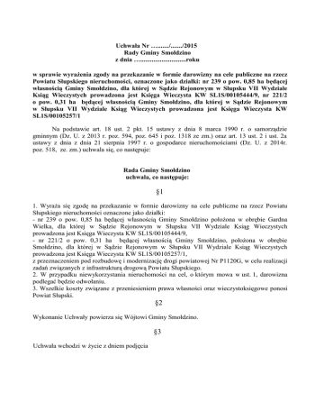 Uchwała Nr …......./......./2015 Rady Gminy Smołdzino z dnia …............................roku w sprawie wyrażenia zgody na przekazanie w formie darowizny na cele publiczne na rzecz Powiatu Słupskiego nieruchomości, oznaczone jako działki: nr 239 o pow. 0,85 ha będącej własnością Gminy Smołdzino, dla której w Sądzie Rejonowym w Słupsku VII Wydziale Ksiąg Wieczystych prowadzona jest Księga Wieczysta KW SL1S/00105444/9, nr 221/2 o pow. 0,31 ha będącej własnością Gminy Smołdzino, dla której w Sądzie Rejonowym w Słupsku VII Wydziale Ksiąg Wieczystych prowadzona jest Księga Wieczysta KW SL1S/00105257/1 Na podstawie art. 18 ust. 2 pkt. 15 ustawy z dnia 8 marca 1990 r. o samorządzie gminnym (Dz. U. z 2013 r. poz. 594, poz. 645 i poz. 1318 ze zm.) oraz art. 13 ust. 2 i ust. 2a ustawy z dnia z dnia 21 sierpnia 1997 r. o gospodarce nieruchomościami (Dz. U. z 2014r. poz. 518, ze. zm.) uchwala się, co następuje: Rada Gminy Smołdzino uchwala, co następuje: §1 1. Wyraża się zgodę na przekazanie w formie darowizny na cele publiczne na rzecz Powiatu Słupskiego nieruchomości oznaczone jako działki: - nr 239 o pow. 0,85 ha będącej własnością Gminy Smołdzino położona w obrębie Gardna Wielka, dla której w Sądzie Rejonowym w Słupsku VII Wydziale Ksiąg Wieczystych prowadzona jest Księga Wieczysta KW SL1S/00105444/9, - nr 221/2 o pow. 0,31 ha będącej własnością Gminy Smołdzino, położona w obrębie Smołdzino, dla której w Sądzie Rejonowym w Słupsku VII Wydziale Ksiąg Wieczystych prowadzona jest Księga Wieczysta KW SL1S/00105257/1, z przeznaczeniem pod rozbudowę i modernizację drogi powiatowej Nr P1120G, w celu realizacji zadań związanych z infrastrukturą drogową Powiatu Słupskiego. 2. W przypadku niewykorzystania nieruchomości na cel, o którym mowa w ust. 1, darowizna podlegać będzie odwołaniu. 3. Wszelkie koszty związane z przeniesieniem prawa własności oraz wieczystoksięgowe ponosi Powiat Słupski. §2 Wykonanie Uchwały powierza się Wójtowi Gminy Smołdzino. §3 Uchwała wchodzi w życie z dniem podjęcia UZASADNIENIE Starostwo Powiatowe w Słupsku wystąpiło z wnioskiem z dnia 16.03.2015r. w sprawie przekazania przez Gminę Smołdzino w formie darowizny nieruchomości wymienionych w § 1 uchwały, położonych w ciągu drogi powiatowej, i stanowiących pas drogowy powiatowej Nr P1120G Smołdzino – Gardna Wielka, na rzecz Powiatu Słupskiego. Wniosek uzasadniając, tym iż przejęcie przedmiotowych działek pozwoli na racjonalne i całościowe gospodarowanie wskazaną drogą, informując ponadto, że wszczęto procedurę uzyskania zgody na realizację inwestycji drogowej „Przebudowa drogi powiatowej nr 1120 G Smołdzino – Gardna Wielka” wraz z przebudową mostu na rzece Łupawa. Zarząd Rady Powiatu Uchwałą Nr 36/2015 z dnia 17 kwietnia 2015r. wyraził wolę nabycia przedmiotowych nieruchomości, w drodze darowizny na rzecz Powiatu Słupskiego. Zgodnie z art. 13 ust. 2 ustawy z dnia 21 sierpnia 1997 roku o gospodarce nieruchomościami, nieruchomość może być z zastrzeżeniem art. 59 ust. 1, przedmiotem darowizny na cele publiczne, a także przedmiotem darowizny dokonywanej między Skarbem Państwa a jednostką samorządu terytorialnego, a także między tymi jednostkami. W umowie darowizny określa się cel, na który nieruchomość jest darowana. W przypadku niewykorzystania nieruchomości na ten cel darowizna podlega odwołaniu, z zastrzeżeniem art. 2a. Zgodnie z art. 6 ust 1 cytowanej ustawy utrzymanie dróg publicznych jest celem publicznym, zatem uregulowanie ich stanu prawnego na rzecz Powiatu Słupskiego jest dopuszczalne i możliwe w drodze darowizny. Darowizna w/w nieruchomości związana jest z realizacją zadań związanych z infrastrukturą drogową Powiatu Słupskiego. Spełnione zostały zatem ustawowe przesłanki dokonania darowizny Wobec powyższego podjęcie przedmiotowej Uchwały jest uzasadnione.