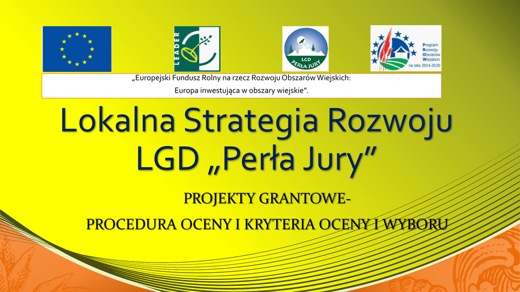 „Europejski Fundusz Rolny na rzecz Rozwoju Obszarów Wiejskich: Europa inwestująca w obszary wiejskie”. Lokalna Strategia Rozwoju LGD „Perła Jury” PROJEKTY GRANTOWEPROCEDURA OCENY I KRYTERIA OCENY I WYBORU Podstawa prawna • Ustawa z dnia 20 lutego 2015 r. o rozwoju lokalnym z udziałem lokalnej społeczności. • Rozporządzenie Ministra Rolnictwa i Rozwoju Wsi z dnia 24.09.2015r w sprawie szczegółowych warunków i trybu przyznawania pomocy finansowej w ramach poddziałania „Wsparcie na wdrażanie operacji w ramach strategii rozwoju lokalnego kierowanego przez społeczność” objętego PROW na lata 2014-2020 • Lokalna Strategia Rozwoju LGD „Perła Jury” na lata 2014-2020 • Kryteria oceny operacji LGD „Perła Jury” • Regulamin Konkursu Grantowego Dokumenty dostępne na www.perlajury.pl, zakładka- Dokumenty do pobrania Zakres przedsięwzięć zgłoszonych do dofinansowania: • Inwestycje w infrastrukturę sportową/rekreacyjną/wypoczynkową • Działalność promocyjno-informacyjna • Pobudzanie i stymulowanie inicjatyw społecznych • Działania na rzecz zachowania lokalnego dziedzictwa kulturowego Kto może się ubiegać o dofinansowanie • osoba prawna będąca organizacją pozarządową lub jednostką sektora finansów publicznych, jeżeli siedziba tej osoby lub jej oddziału znajduje się na obszarze objętym LSR LGD „Perła Jury”, • jednostka organizacyjna nieposiadająca osobowości prawnej, (JONOP), której ustawa przyznaje zdolność prawną, jeżeli siedziba tej jednostki lub jej oddziału znajduje się na obszarze objętym LSR, z wykluczeniem spółek kapitałowych w organizacji, w szczególności: koła gospodyń wiejskich będące wyodrębnionymi jednostkami organizacyjnymi/ pomocniczymi kółek rolniczych, rady sołeckie, sekcje lub koła przy czym JONOP może ubiegać się o pomoc pod warunkiem, że z wnioskiem o pomoc wystąpi osoba prawna, zwana dalej Wnioskodawcą, w strukturze której dana jednostka prowadzi działalność organizacyjną. Procedura naboru – oceny wniosków/grantów • Za ogłoszenie konkursu odpowiada LGD „Perła Jury”, która na stronie www zamieszcza ogłoszenie wraz z wymaganymi dokumentami. • Wniosek należy złożyć zgodnie z wymogami zawartymi w ogłoszeniu. • Pracownik biura przyjmujący wniosek ma obowiązek sprawdzić czy wniosek jest kompletny zgodnie z listą załączników. • Wnioskodawca ma prawo wycofać złożony w danym naborze wniosek w każdym momencie do dnia posiedzenia Rady Programowej bez podania przyczyny ( Procedura wycofania wniosku). • Podmiot może złożyć tylko 1 wniosek w danym naborze. Limit dla Grantobiorcy w okresie 2014-2020 wynosi 100 tys. zł. Przy wyborze grantów będą brane pod uwagę następujące kryteria formalne i merytoryczne. Procedura naboru –oceny wniosków/grantów-cd. Kryteria formalne: • Zgodność z ogłoszeniem o naborze operacji o powierzenie grantów • Kryteria weryfikacji zgodności Grantobiorcy z warunkami przyznania pomocy określonymi w Programie Rozwoju Obszarów Wiejskich na lata 2014-2020. Kryteria merytoryczne: W ramach oceny weryfikowana jest: • zgodność zadania z LSR, • zgodność z lokalnymi kryteriami wyboru operacji. Kryteria formalne: • Czy wniosek został złożony w miejscu i terminie wskazanym w ogłoszeniu? • Czy wniosek jest zgodny z zakresem tematycznym wskazanym w ogłoszeniu? • Czy wniosek realizuje cele i wskaźniki założone w LSR? • Czy Wnioskodawca jest podmiotem uprawnionym – zgodnie z Regulaminem – do wnioskowania? • Czy okres realizacji zadania jest zgodny z Ogłoszeniem o Konkursie? • Czy kwota wnioskowanego grantu jest zgodna z Ogłoszeniem o Konkursie? • Czy zadanie obejmuje działania, których finansowanie jest niniejszym Regulaminem zakazane. • Czy wniosek jest kompletny? Wszystkie rubryki zostały wypełnione i wszystkie załączniki dołączone. • Czy przedstawiony w formularzu wniosku budżet jest prawidłowo wypełniony (nie zawiera błędów rachunkowych). • Czy Wnioskodawca lub Grantobiorca wywiązał się z umowy na realizację poprzedniego grantu w ramach Projektów Grantowych realizowanych przez LGD- jeśli dotyczy. Kryteria merytoryczne Aby operacja została zakwalifikowana do dofinansowania musi być zgodna z LSR i uzyskać minimum punktowe. O kolejności na liście rankingowej decyduje liczba punktów, a w przypadku jednakowej liczby punktów termin złożenia wniosku. • Max. punktacja – 22 pkt • Min. punktowe- 11 pkt Kryteria oceny operacji przez Radę Programową Kryterium 3 Kryterium 4 Kryterium 2 Kryterium 1 Kryterium 5 Kryterium 6 Zakres tematyczny konkursu Kryterium 7 Kryterium 1. Miejsce realizacji projektu Punkty do przyznania: • Miejscowości: do 5000 mieszkańców – 5 pkt. powyżej 5000 mieszkańców – 3 pkt. Uzasadnienie: Preferencja dla projektów zlokalizowanych w miejscowościach, zamieszkałych przez mniej niż 5 tys. mieszkańców wg stanu na dzień 31.12.2013r – dane GUS Kryterium 2. Wykorzystanie lokalnych zasobów Liczba punktów do przyznania: • projekt oparty na lokalnych zasobach dziedzictwa kulturowego, historycznego, przyrodniczego, społecznego- 5 pkt, • projekt oparty na lokalnych zasobach dziedzictwa kulturowego lub przyrodniczego lub historycznego lub społeczne– 3 pkt, • projekt nie jest oparty na lokalnych zasobach – 0 pkt. Uzasadnienie: Preferencje dla projektów wykorzystujących lokalne walory przyrodniczego, historycznego, kulturowego i społeczne. Kryterium 3. Zasięg projektu pod względem grupy odbiorców Liczba punktów do przyznania: • Projekt uwzględnia działania skierowane do następujących do: grupy defaworyzowane- 1 pkt dzieci – 1 pkt • działania wspierają integrację międzypokoleniową różnych grup docelowych- 2 pkt • Projekt nie uwzględnia działań skierowanych do ww. grup– 0 pkt Uzasadnienie: • Preferowane są działania wspierające integrację międzypokoleniową 