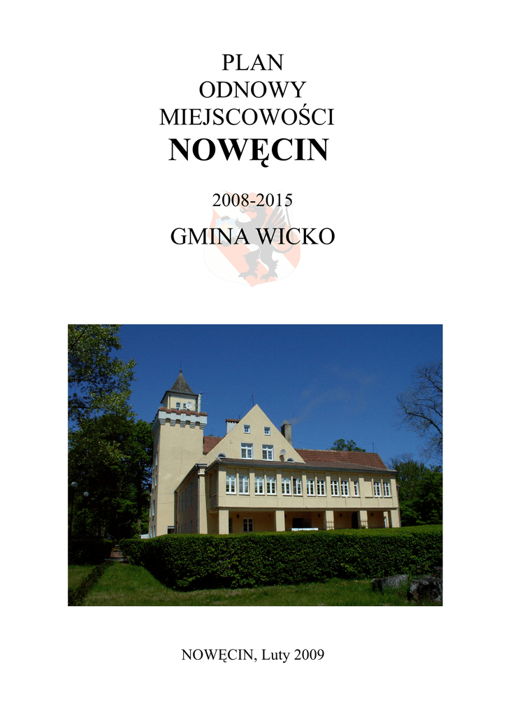 PLAN ODNOWY MIEJSCOWOŚCI NOWĘCIN 2008-2015 GMINA WICKO NOWĘCIN, Luty 2009 Wstęp 3 I. Charakterystyka miejscowości 4 1.1 Położenie geograficzne 4 1.2 Rys historyczny 6 II. Inwentaryzacja zasobów służących odnowie miejscowości 7 2.1 Środowisko przyrodnicze 7 2.2 Dziedzictwo kulturowe 8 2.3 Obiekty i tereny 8 2.4 Infrastruktura społeczna 8 2.5 Analiza zasobów wsi 12 III. Plan odnowy i rozwoju 13 IV. Analiza mocnych i słabych stron miejscowości 14 V. Wizja miejscowości 15 VI. Harmonogram wdrażania planu zarządzania 16 VII. Opis zadania priorytetowego 17 2 WSTĘP Polskie wsie są postrzegane jako obszary zaniedbane, niedofinansowane, zacofane technicznie i mentalnie, o zaniedbanej infrastrukturze. Zmiana tej sytuacji powinna stać się priorytetowym celem działania każdej gminy. Dla zapewnienia zrównoważonego rozwoju obszarów wiejskich niezbędne jest zapewnienie wielofunkcyjności wsi, zwiększenie funkcji gospodarczych i społecznych wsi, ochrony środowiska na obszarach wiejskich, ograniczenie bezrobocia oraz poprawa warunków życia ludności wiejskiej. Zmiany te muszą jednak mieć swoje źródło w inicjatywie mieszkańców danego obszaru wiejskiego. Warunkiem niezbędnym do aktywnego włączenia się miejscowości wiejskich w realizację przedsięwzięć na rzecz rozwoju i promocji lokalnych walorów kulturowych i przyrodniczych jest integracja społeczności lokalnej wokół budowy wspólnego planu działania. W związku z powyższym, podstawą rozwoju miejscowości Nowęcin jest dokument pn. „Plan Odnowy Miejscowości Nowęcin”, który określa charakterystykę miejscowości, inwentaryzuje zasoby w ujęciu stanu rzeczywistego, opisuje mocne i słabe strony, opisuje planowane zadania w perspektywie 7 lat od dnia przyjęcia dokumentu. Dokument został oparty na analizie potrzeb inwestycyjnych i społecznych w miejscowości. Określa generalny kierunek rozwoju oraz przedstawia metody i narzędzia jego wdrażania. 3 0I. „CHARAKTERYSTYKA MIEJSCOWOŚCI 1. 1. POŁOŻENIE GEOGRAFICZNE Nowęcin leży w północnej części Gminy Wicko nad krypto-depresyjnym jeziorem SARBSKO (6580 m długości, 1240 m szerokości i 677 ha powierzchni) o charakterystycznej dla jezior przymorskich niewielkiej głębokości maksymalnej (3,2 m) i bardzo małej głębokości średniej (1,2 m). 4 Bezpośrednio graniczy z miastem Łeba, co znacznie wpływa na atrakcyjność turystyczną miejscowości, z sołectwem Żarnowska, Łebieniec, Szczenurze i Sarbsk. Nowęcin oddalony od morza niespełna 2 km jest wiodącym sołectwem pod względem turystycznym Gminy Wicko dysponującym infrastrukturą hotelowo – noclegową. 5 1. 2. RYS HISTORYCZNY Pałac w Nowęcinie na widokówce z lat 30, XX wieku. Nowęcin (niem. Neuhof)- wieś leżąca w odległości około 2 km na wschód od Łeby. W roku 1905 miejscowość razem z majątkiem liczyła 206 mieszkańców, w 1939 r. – 282 mieszkańców, natomiast obecnie miejscowość liczy 545 mieszkańców. W 1373 roku wielki mistrz krzyżacki, Winrych von Kniprode, nadał szerokie przywileje w Łebie Wytrychowi von Weiherowi. Rodzina von Weiherów zamieszkała w Łebie w budynku określonym jako zamek. W czasie wielkiego szturmu w 1497 roku, zamek uległ znacznym uszkodzeniom, dlatego postanowiono przenieść siedzibę na bezpieczniejsze tereny. Wybór padł na okolice południowo-zachodniego brzegu jeziora Sarbsko, będące posiadłościami rodowymi. Tam też wybudowano nowa siedzibę. Nazwa Neuhof ( Nowy Dwór) po raz pierwszy pojawiła się w roku 1569, na dokumencie wydanym przez ówczesnego dziedzica. Majątek pozostawał w rękach rodziny von Weiher do roku 1781. Wówczas został sprzedany w ręce właściciela majątku w Charbrowie, von Somnitza. Od tego czasu dobra często zmieniały posiadacza. Ich ostatnim właścicielem, zanim Nowęcin został zajęty przez Rosjan w marcu 1945 roku, był John Zoch, gospodarujący na 1451 hektarach. II. INWENTARYZACJA ZASOBÓW 2. 1 . ZASOBY PRZYRODNICZE Nowęcin - to niewielkie sołectwo, położone blisko Morza Bałtyckiego, w sąsiedztwie jeziora Łebskiego, nad brzegiem jeziora Sarbskiego, pośród lasów sosnowych. Posiada doskonałe warunki klimatyczne, które spełniają wymogi stawiane uzdrowiskom. Panuje tu mikroklimat z dużą zwartością jodu i soli w powietrzu, dużym nasłonecznieniem i znaczną dynamiką zmian w powietrzu. Zróżnicowanie geomorfologiczne, sąsiedztwo Morza Bałtyckiego i położenie w zasięgu oddziaływania dużych, stałych i sezonowych, centrów barycznych powodują wyraźne zróżnicowanie warunków klimatycznych. Na Pobrzeżu Słowińskim nasłonecznienie rzeczywiste jest o przeszło 50 godzin większe niż na Pojezierzu Pomorskim. W wąskiej strefie brzegowej w okolicach Łeby to uprzywilejowanie solarne zaznacza się szczególnie wyraźnie. Dzięki temu obszary te posiadają predyspozycje do rozwoju form wypoczynku opartych na helioterapii. Także dla rolnictwa korzystne jest, że obszar Pobrzeża Słowińskiego wraz z przylegającymi do nich fragmentami wysoczyzn młodoglacjalnych charakteryzuje się wysokimi sumami nasłonecznienia rzeczywistego w okresie wegetacyjnym, wyższymi niż na przeważającej części Polski. Klimat znakomicie wpływa na drogi oddechowe, reguluje ciśnienie krwi, jak również działa pozytywnie na chorych z zaburzeniami tarczycy. 2. 2 .DZIEDZICTWO KULTUROWE - park poddworski z pałacem, który zbudował Mikołaj Wejher w 1497 roku. - kaplica gotycka tzw. Jerozolimska - kaplica grobowa z połowy XIX wieku - fragmenty umocnień obronnych w postaci wałów i fosy. 2. 3 .OBIEKTY I TERENY We wsi rodowej Wejherów znajduje się park pod-dworski z pałacem, który zbudował Mikołaj Wejher w 1497 roku. W parku zachowały się fragmenty umocnień obronnych w postaci wałów i fosy. Na zboczu fosy, od strony bramy wjazdowej do parku, rośnie gęsiówka wieżyczkowata Arabis gabra, nieczęsta roślina we florze północnej Polski. 2. 4 .INFRASTEUKTURA