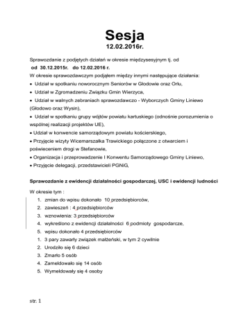 Sesja 12.02.2016r. Sprawozdanie z podjętych działań w okresie międzysesyjnym tj. od od 30.12.2015r. do 12.02.2016 r. W okresie sprawozdawczym podjąłem między innymi następujące działania: Udział w spotkaniu noworocznym Seniorów w Głodowie oraz Orlu, Udział w Zgromadzeniu Związku Gmin Wierzyca, Udział w walnych zebraniach sprawozdawczo - Wyborczych Gminy Liniewo (Głodowo oraz Wysin), Udział w spotkaniu grupy wójtów powiatu kartuskiego (odnośnie porozumienia o wspólnej realizacji projektów UE), Udział w konwencie samorządowym powiatu kościerskiego, Przyjęcie wizyty Wicemarszałka Trawickiego połączone z otwarciem i poświeceniem drogi w Stefanowie, Organizacja i przeprowadzenie I Konwentu Samorządowego Gminy Liniewo, Przyjęcie delegacji, przedstawicieli PGNiG, Sprawozdanie z ewidencji działalności gospodarczej, USC i ewidencji ludności W okresie tym : 1. zmian do wpisu dokonało 10 przedsiębiorców, 2. zawieszeń : 4 przedsiębiorców 3. wznowienia: 3 przedsiębiorców 4. wykreślono z ewidencji działalności 6 podmioty gospodarcze, 5. wpisu dokonało 4 przedsiębiorców 1. 3 pary zawarły związek małżeński, w tym 2 cywilnie 2. Urodziło się 6 dzieci 3. Zmarło 5 osób 4. Zameldowało się 14 osób 5. Wymeldowały się 4 osoby str. 1 6. 40- lecie Pożycia Małżeńskiego obchodzili Państwo Danuta i Jerzy Anhalt, Regina i Zbigniew Kruszyńscy, Danuta i Jan Okuniewscy, Cecylia i Stanisław Prądzińscy, 7. 50-lecie Pożycia Małżeńskiego obchodzili Teresa i Bronisław Jach 8. Wydano 105 dowodów osobistych Zarządzenia Nr Lp. aktu 1/2016 1 Data Powołania Komisji przetargowej do rozstrzygnięcia 5 stycznia 2016r. 2 2/2016 5 stycznia 2016r. 3 3/2016 5 stycznia 2016r. 4/2016 5 stycznia 2016r. 5/2016 12 stycznia 2016r. 4 5 6/2016 6 W sprawie: treść 9 lutego 2016r. przetargu nr ZPGK/1/2016 na „Przebudowa dróg i chodników na terenie wsi Liniewo wraz z modernizacją odwodnienia centrum wsi – ulica Podwale” Powołania komisji do ustalenia normy zużycia paliwa w ciągniku rolniczym Renault Ares przekazania Samorządowemu Zakładowi Budżetowemu w Orlu Zatwierdzenia diagnoz potrzeb rozwojowych szkół w Gminie Liniewo Organizacji i funkcjonowania systemu wczesnego ostrzegania (SWO) oraz systemu wykrywania i alarmowania (SWA) na terenie Gminy Liniewo. Ogłoszenia otwartego konkursu ofert na realizację zadań publicznych Gminy Liniewo na rok 2016 SPRAWY KOMUNALNE DROGI: 1. Wybór oferty na zadanie „Przebudowa dróg i chodników na terenie wsi Liniewo wraz z modernizacją odwodnienia centrum wsi – ulica Podwale”. 2. Ogłoszenie zapytania ofertowego na sprzedaż kruszywa. 3. Odśnieżanie dróg gminnych oraz posypywanie piaskiem. str. 2 4. Zakup sprzętu do utrzymania dróg ciągnik, przyczepa 10 ton, wał, wykaszarka 5. Zakup materiałów do utwardzania ulicy Polnej 6. Uzyskanie pozwolenia na budowę dróg osiedlowych ul Kasztanowa, Topolowa, Spokojna itd. 7. Przygotowanie wniosku o dofinansowanie na remont drogi w Lubieszynku 8. Naprawa ulicy Łąkowej dostarczenie ok 120 ton gruzu 9. Wszczęcie procedury wyboru wykonawcy robót związanych z dojściem do świetlicy w Chrztowie. 10. Naprawa i dostosowanie sprzętu drogowego WODOCIĄGI I KANALIZACJA: 1. Wybór oferty na opracowanie dokumentacji projektowej w zakresie infrastruktury wodociągowej i sanitarnej”. 2. Czyszczenie rur kanalizacyjnych w Orlu. 3. Wymiana wodomierzy na terenie wsi Liniewo 4. Serwis pompowni w Liniewie ul Kasztanowa, Wyzwolenia, Płachty, Stary więc 5. Serwis pomp na oczyszczalni ścieków 6. Usuwanie bieżących awarii. POZOSTAŁE ZADANIA: 1. Wybór oferty na konserwację i czyszczenie boiska Orlik zlokalizowanego przy ZO Liniewo. 2. Przygotowanie projektu programu opieki nad zwierzętami bezdomnymi. 3. Zakup znaków w celu oznakowania miejsc parkingowych przy urzędzie dla osób niepełnosprawnych. 4. Złożenie wniosku do Powiatowego Urzędu Pracy w Kościerzynie w celu organizacji prac społecznie użytecznych w 2016 r. 5. Ogłoszenie o naborze wniosków do programu usuwania azbestu z terenu gm. Liniewo. 6. Sporządzenie i przesłanie do Urzędu Marszałkowskiego sprawozdania za korzystanie ze środowiska za 2015 r. 7. Sporządzenie raportu za 2015 r. do bazy KOBIZE. 8. Nadzór i koordynacja prac przy przedszkolu 9. Przygotowanie do zakupu wyposażenia do przedszkola 10. Rozpoczęcie prac remontowych sanitariatu dla pracowników RGKIR str. 3 11. Kontrola oraz sprawozdanie z realizacji zadania związanego z budową przydomowych oczyszczalni ścieków – Kontrola obowiązkowa coroczna. Rolnictwo i Gospodarka Nieruchomościami Podział nieruchomości Prowadzone jest postępowanie administracyjne oraz prace terenowe w celu wydzielenia działki na cele przepompowni ścieków w Lubieszynie. Wydzielona działka zostanie zamieniona na działkę gminną. Sprzedaż nieruchomości Trwają prace oraz postępowanie przetargowe w sprawie nieruchomości przeznaczonych do sprzedaży o nr geod. 721/1, 721/2, 721/3, 721/4, 721/5, 721/6 , 703/1 w Liniewie. Przygotowano dokumentację w sprawie wymiany nieruchomości w Dece. Zamiana nastąpi zapisem notarialnym w dniu 16.02.2016 r. Akcyza paliwowa W terminie od 1 do 28 lutego 2016 r. producenci rolni mają możliwość złożenia wniosku o zwrot podatku akcyzowego zawartego w cenie oleju napędowego wraz z fakturami vat stanowiącymi dowód zakupu oleju napędowego w okresie od 1 sierpnia 2015 r. do 31 stycznia 2016 r. w ramach limitu zwrotu podatku określonego na rok 2016. GOPS Gminny Ośrodek Pomocy Społecznej w Liniewie realizuje program rządowy dożywiania dzieci w szkołach. Pomoc w formie bezpłatnych obiadów oraz zasiłki celowe na zakup żywności w I półroczu 2015 roku otrzymały 302 osoby. Pracownicy socjalni prowadzili nabór dzieci kierowanych na kolonie letnie . Na kolonie organizowane przez Kuratorium Oświaty w Gdańsku skierowano 6 dzieci. Na kolonie finansowane ze środków profilaktyki alkoholowej skierowano