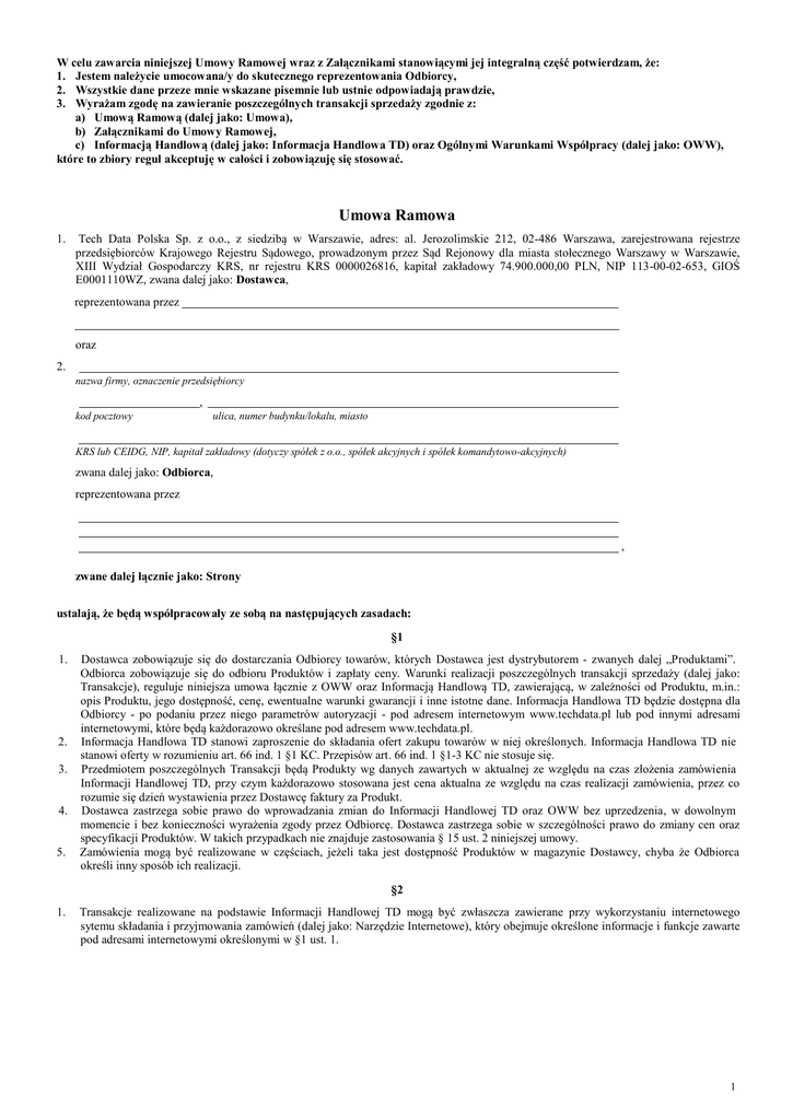 W celu zawarcia niniejszej Umowy Ramowej wraz z Załącznikami stanowiącymi jej integralną część potwierdzam, że: 1. Jestem należycie umocowana/y do skutecznego reprezentowania Odbiorcy, 2. Wszystkie dane przeze mnie wskazane pisemnie lub ustnie odpowiadają prawdzie, 3. Wyrażam zgodę na zawieranie poszczególnych transakcji sprzedaży zgodnie z: a) Umową Ramową (dalej jako: Umowa), b) Załącznikami do Umowy Ramowej, c) Informacją Handlową (dalej jako: Informacja Handlowa TD) oraz Ogólnymi Warunkami Współpracy (dalej jako: OWW), które to zbiory reguł akceptuję w całości i zobowiązuję się stosować. Umowa Ramowa 1. Tech Data Polska Sp. z o.o., z siedzibą w Warszawie, adres: al. Jerozolimskie 212, 02-486 Warszawa, zarejestrowana rejestrze przedsiębiorców Krajowego Rejestru Sądowego, prowadzonym przez Sąd Rejonowy dla miasta stołecznego Warszawy w Warszawie, XIII Wydział Gospodarczy KRS, nr rejestru KRS 0000026816, kapitał zakładowy 74.900.000,00 PLN, NIP 113-00-02-653, GIOŚ E0001110WZ, zwana dalej jako: Dostawca, reprezentowana przez oraz 2. nazwa firmy, oznaczenie przedsiębiorcy , kod pocztowy ulica, numer budynku/lokalu, miasto KRS lub CEIDG, NIP, kapitał zakładowy (dotyczy spółek z o.o., spółek akcyjnych i spółek komandytowo-akcyjnych) zwana dalej jako: Odbiorca, reprezentowana przez , zwane dalej łącznie jako: Strony ustalają, że będą współpracowały ze sobą na następujących zasadach: §1 1. 2. 3. 4. 5. Dostawca zobowiązuje się do dostarczania Odbiorcy towarów, których Dostawca jest dystrybutorem - zwanych dalej „Produktami”. Odbiorca zobowiązuje się do odbioru Produktów i zapłaty ceny. Warunki realizacji poszczególnych transakcji sprzedaży (dalej jako: Transakcje), reguluje niniejsza umowa łącznie z OWW oraz Informacją Handlową TD, zawierającą, w zależności od Produktu, m.in.: opis Produktu, jego dostępność, cenę, ewentualne warunki gwarancji i inne istotne dane. Informacja Handlowa TD będzie dostępna dla Odbiorcy - po podaniu przez niego parametrów autoryzacji - pod adresem internetowym www.techdata.pl lub pod innymi adresami internetowymi, które będą każdorazowo określane pod adresem www.techdata.pl. Informacja Handlowa TD stanowi zaproszenie do składania ofert zakupu towarów w niej określonych. Informacja Handlowa TD nie stanowi oferty w rozumieniu art. 66 ind. 1 §1 KC. Przepisów art. 66 ind. 1 §1-3 KC nie stosuje się. Przedmiotem poszczególnych Transakcji będą Produkty wg danych zawartych w aktualnej ze względu na czas złożenia zamówienia Informacji Handlowej TD, przy czym każdorazowo stosowana jest cena aktualna ze względu na czas realizacji zamówienia, przez co rozumie się dzień wystawienia przez Dostawcę faktury za Produkt. Dostawca zastrzega sobie prawo do wprowadzania zmian do Informacji Handlowej TD oraz OWW bez uprzedzenia, w dowolnym momencie i bez konieczności wyrażenia zgody przez Odbiorcę. Dostawca zastrzega sobie w szczególności prawo do zmiany cen oraz specyfikacji Produktów. W takich przypadkach nie znajduje zastosowania § 15 ust. 2 niniejszej umowy. Zamówienia mogą być realizowane w częściach, jeżeli taka jest dostępność Produktów w magazynie Dostawcy, chyba że Odbiorca określi inny sposób ich realizacji. §2 1. Transakcje realizowane na podstawie Informacji Handlowej TD mogą być zwłaszcza zawierane przy wykorzystaniu internetowego sytemu składania i przyjmowania zamówień (dalej jako: Narzędzie Internetowe), który obejmuje określone informacje i funkcje zawarte pod adresami internetowymi określonymi w §1 ust. 1. 1 2. 3. 4. Złożenie zamówienia poprzez Narzędzie Internetowe może nastąpić po wprowadzeniu Parametrów Autoryzacji, o których mowa poniżej w §3, wyłącznie za pomocą automatycznie tworzonego, elektronicznego formularza. Zamówienie takie jest traktowane jak zamówienie złożone pisemnie. Złożenie zamówienia może także nastąpić w formie tradycyjnej - pisemnej lub za pośrednictwem poczty elektronicznej, względnie faksem. Dostawca dopuszcza także zamówienia telefoniczne. Dostawcy służy jednak prawo wyboru formy zamówienia składanego przez Odbiorcę, w związku z czym ma on prawo żądania złożenia zamówienia w formie przez siebie wskazanej, w tym także wyłącznie w formie pisemnej. Z zastrzeżeniem postanowień § 1 ust. 3 i 4, złożenie zamówienia – niezależnie od formy - jest równoznaczne z akceptacją wszystkich zasad umieszczonych w OWW oraz Informacji Handlowej TD w treści aktualnej ze względu na czas skutecznego złożenia zamówienia. §3 1. 2. 3. 4. 5. 6. Parametry Autoryzacji, umożliwiające dostęp do Narzędzia Internetowego oraz Informacji Handlowej TD, zostaną przekazane pocztą elektroniczną osobie lub osobom upoważnionym - wskazanym w Załączniku nr 2 do Umowy, po przesłaniu przez Odbiorcę za pośrednictwem Systemu Rejestracji Danych podpisanego skanu Umowy wraz z koniecznymi Załącznikami oraz wymaganymi dokumentami rejestrowymi. System Rejestracji Danych (dalej jako: SRD) jest dostępny pod adresem internetowym www.techdata.pl lub pod innymi adresami internetowymi, które będą każdorazowo określane pod adresem www.techdata.pl. Przesłanie do Dostawcy skanu Umowy nie zwalnia jednak Odbiorcy z obowiązku wskazanego w § 15 ust. 5. W przypadku zmiany danych określonych w Załączniku nr 2, Odbiorca zobowiązany będzie do dokonania ich niezwłocznej aktualizacji poprzez ponowne wypełnienie i podpisanie Załącznika nr 2 oraz przesłanie jego skanu do Dostawcy. W przypadku braku aktualizacji danych, o której mowa w zdaniu pierwszym, ostatni otrzymany przez Dostawcę Załącznik nr 2 uznawany będzie za aktualny. W przypadku zmiany danych wskazanych przez Odbiorcę w Załączniku nr 1 aktualizacja powinna być dokonana niezwłocznie w formie tradycyjnej - pisemnej, w postaci dokumentu podpisanego przez Odbiorcę i dostarczonego Dostawcy. Odbiorca ponosi pe