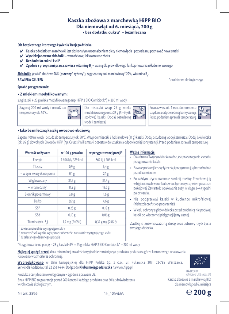 Kaszka zbożowa z marchewką HiPP BIO Dla niemowląt od 6. miesiąca, 200 g • bez dodatku cukru1 • bezmleczna Dla bezpiecznego i zdrowego żywienia Twojego dziecka: Kaszka z dodatkiem marchewki jest doskonałym urozmaiceniem diety niemowlęcia i pozwala mu poznawać nowe smaki Wyselekcjonowane składniki – wartościowe, lekkostrawne zboża Bez dodatku cukru1 i soli2 Zgodnie z przepisami prawa zawiera witaminę B1 – ważną dla prawidłowego funkcjonowania układu nerwowego Składniki: grysiki* zbożowe 78% (pszenny*, ryżowy*), zagęszczony sok marchwiowy* 22%, witamina B1. ZAWIERA GLUTEN *z rolnictwa ekologicznego Sposób przygotowania: • Z mlekiem modyfikowanym: 23 g kaszki + 25 g mleka modyfikowanego (np. HiPP 2 BIO Combiotik®) + 200 ml wody. Zagotuj 200 ml wody i ostudź do temperatury ok. 50°C. Do miseczki wsyp 25 g mleka modyfikowanego oraz 23 g (3–4 łyżki stołowe) kaszki. Dodaj ostudzoną wodę i zamieszaj. Pozostaw na ok. 1 min. do momentu uzyskania odpowiedniej konsystencji. Przed podaniem sprawdź temperaturę. • Jako bezmleczną kaszkę owocowo-zbożową Zagotuj 100 ml wody i ostudź do temperatury ok. 50°C. Wsyp do miseczki 2 łyżki stołowe (11 g) kaszki. Dodaj ostudzoną wodę i zamieszaj. Dodaj 3/4 słoiczka (ok. 95 g) dowolnych Owoców HiPP (np. Gruszki Williamsa) i pozostaw do uzyskania odpowiedniej konsystencji. Przed podaniem sprawdź temperaturę. Wartość odżywcza w 100 g proszku w przygotowanej porcji* Energia 1 606 kJ / 379 kcal 867 kJ / 206 kcal 6,4 g Tłuszcz 0,9 g – w tym kwasy tł. nasycone 0,1 g 2,1 g Węglowodany 81,5 g 31,7 g 13,6 g – w tym cukry1 11,2 g Błonnik pokarmowy 3,8 g 1,6 g Białko 9,2 g 4,6 g Sól2 0,25 g 0,15 g Sód 0,10 g 0,06 g Tiamina (wit. B1) 1,2 mg (240%3) 0,37 g mg (74% 3) zawiera naturalnie występujące cukry 2 zawartość soli wynika wyłącznie z obecności naturalnie występującego sodu 3 % zalecanego dziennego spożycia 1 Ważne informacje: • Dla zdrowia Twojego dziecka ważne jest przestrzeganie sposobu przygotowania kaszki. • Zawsze podawaj kaszkę łyżeczką i przygotowuj ją bezpośrednio przed karmieniem. • Po każdym użyciu starannie zamknij torebkę. Przechowuj ją w higienicznych warunkach, w suchym miejscu, w temperaturze pokojowej. Zawartość opakowania zużyj w ciągu 3–4 tygodni po otwarciu. • Nie podgrzewaj kaszki w kuchence mikrofalowej (niebezpieczeństwo poparzenia!). • W celu ochrony ząbków dziecka przed próchnicą nie podawaj kaszki po wieczornej pielęgnacji jamy ustnej. Zadbaj o zrównoważoną dietę oraz zdrowy tryb życia swojego dziecka. *Przygotowanie na porcję = 23 g kaszki HiPP + 25 g mleka HiPP 2 BIO Combiotik® + 200 ml wody Najlepiej spożyć przed: data minimalnej trwałości oryginalnie zamkniętego produktu podana na górze kartonowego opakowania. Pakowano w atmosferze ochronnej. Wyprodukowano w Unii Europejskiej dla HiPP Polska Sp. z o.o., ul. Puławska 303, 02-785 Warszawa. Serwis dla Rodziców: tel. 22 853 44 44. Dołącz do Klubu mojego Maluszka na www.hipp.pl Produkt z certyfikatem ekologicznym – zgodnie z prawem UE. Znak HiPP BIO to gwarancja ponad 260 kontroli każdego produktu oraz 60 lat doświadczenia w rolnictwie ekologicznym. Nr art. 2896 15_1054EM HR-EKO-07 rolnictwo UE / spoza UE Kaszka zbożowa z marchewką BIO dla niemowląt od 6. miesiąca 200 g
