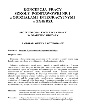 KONCEPCJA PRACY SZKOŁY PODSTAWOWEJ NR 1 z ODDZIAŁAMI INTEGRACYJNYMI w ZGIERZU SZCZEGÓŁOWA KONCEPCJA PRACY W OPARCIU O OBSZARY I OBSZAR: OPIEKA I WYCHOWANIE Podobszar : Program Wychowawczy i Program Profilaktyki Diagnoza stanu: Działania podejmowane przez nauczycieli, wychowawców, rodziców służyć mają kształtowaniu określonej sylwetki ucznia – absolwenta naszej szkoły. Sylwetkę wychowanka naszej szkoły opisuje w sposób całościowy Program Wychowawczy oraz Program Profilaktyki. Nauczyciele opracowali własne plany wychowawcze oparte na Programie Wychowawczym oraz Programie Profilaktyki, dostosowane do możliwości szkoły, priorytetów MEN i potrzeb środowiska rodzinnego uczniów. Programy te proponują wychowanie dziecka, które mając ukształtowane poczucie własnej wartości, jest wrażliwe na dobro, uwierzyło we własne siły, nabyło umiejętności umożliwiające osiąganie w przyszłości wartościowych i trudnych celów życiowych. Programy uwzględniają treści zawarte w podstawie programowej jak również oczekiwania środowiska rodzinnego. Opisują w sposób całościowy wszystkie treści i działania szkoły o charakterze wychowawczym. Standard: Szkoła posiada i realizuje szkolny Program Wychowawczy i Profilaktyki, które zawierają cele określone w podstawie programowej, uwzględniające potrzeby środowiska rodzinnego uczniów oraz dostosowane do możliwości szkoły. Wskaźniki: 1. Program Wychowawczy Szkoły zawiera misję szkoły oraz opisuje w sposób całościowy wszystkie treści i działania szkoły o charakterze wychowawczym. 2. Program Wychowawczy Szkoły uwzględnia treści zawarte w podstawie programowej jak również oczekiwania środowiska rodzinnego uczniów. 3. Program Wychowawczy Szkoły dostosowany jest do możliwości szkoły, cała społeczność szkolna współuczestniczy w tworzeniu i realizacji tego programu. 4. Program Profilaktyki zawiera treści i zadania zmierzające do przygotowania uczniów do przeciwdziałania zagrożeniom społecznym. Kryteria sukcesu: 1. Cała społeczność szkolna współuczestniczy w tworzeniu i realizacji Szkolnego Programu Wychowawczego i Profilaktyki. 2. Podejmowane przez społeczność szkolną wielokierunkowe działania skutecznie eliminują ze środowiska szkolnego zagrożenia, patologię społeczną. 3. Większość absolwentów szkoły identyfikuje się z sylwetką wychowanka zaprezentowaną w misji wychowawczej szkoły. Podobszar : Potrzeby opiekuńcze uczniów Diagnoza stanu: Przeprowadzone badania pozwalają na w miarę wnikliwe rozpoznanie potrzeb opiekuńczych uczniów i w kolejności zapewnia uczniom wszelkich możliwych form pomocy. Działania dotyczą głównie uczniów z rodzin niewydolnych wychowawczo oraz rodzin znajdujących się w trudnej sytuacji materialnej. Celem działań jest: zapewnienie potrzebującym uczniom dożywiania oraz opieki w świetlicy szkolnej, zorganizowanie dla potrzebujących uczniów dodatkowych zajęć profilaktycznowychowawczych, dydaktyczno-wyrównawczych, otoczenie szczególną opieką przez wychowawców, pedagoga szkolnego, dyrektora szkoły dzieci specjalnej troski, organizowanie współpracy szkoły z instytucjami zainteresowanymi problemami opieki, pomocy socjalnej, a przede wszystkim środowiskiem rodzinnym ucznia. Standard: Szkoła rozpoznaje potrzeby opiekuńcze uczniów i zapewnia pomoc, której potrzebują. Wskaźniki: 1. Szkoła posiada rozeznanie potrzeb opiekuńczych uczniów. 2. Szkoła zapewnia wszelkie dostępne jej formy pomocy uczniom z rodzin ubogich i niewydolnych wychowawczo. 3. Dla dzieci potrzebujących dodatkowej opieki, szkoła organizuje zajęcia w świetlicy szkolnej i środowiskowej. Kryteria sukcesu: 1. Szkoła posiada pełne rozpoznanie potrzeb uczniów w zakresie opieki i pomocy socjalnej. 2. Uczniowie z rodzin ubogich otrzymują pomoc materialną: stypendia na zakup podręczników, bezpłatnego wypoczynku w okresie feryjnym, stypendia socjalne. 3. Uczniowie mają zapewnioną opiekę w czasie wolnym od zajęć w świetlicy szkolnej i środowiskowej. Podobszar : Bezpieczeństwo uczniów w szkole. Diagnoza stanu: Szkoła posiada tereny, budynki dostosowane do właściwego przebiegu procesu kształcenia. Szkoła czyni starania, aby wyniki uczenia się były atrakcyjne i bezpieczne. W szkole przewidywana jest poprawa wyposażenia oraz wykonywanie bieżących remontów. Prowadzone są systematyczne przeglądy sprzętu i pomocy dydaktycznych pod względem bezpieczeństwa ich użytkowania. Opracowane są regulaminy pomieszczeń. Uczniowie, nauczyciele i rodzice zapoznawani są z zasadami bezpieczeństwa obowiązującymi na terenie szkoły. Prowadzi się zakupy niezbędnych środków medycznych do udzielenia pierwszej pomocy. Są przeprowadzane systematyczne szkolenia w zakresie udzielenia pierwszej pomocy. Opracowywane są harmonogramy i regulaminy dyżurów nauczycieli. W szkole podejmowane są działania mające na celu profilaktykę zaburzeń zachowania. Nauczyciele realizują programy profilaktyczne oraz programy zajęć pozalekcyjnych o charakterze wychowawczym. Szkoła współpracuje z instytucjami wspierającymi ją w działaniach wychowawczych. Standard: Wskaźniki: Szkoła dba o zdrowie i bezpieczeństwo uczniów. 1. Szkoła zapewnia właściwą opiekę podczas lekcji, przerw i innych zajęć realizowanych poza szkołą. 2. Szkoła podejmuje działania zapobiegające zjawiskom przemocy i agresji. 3. Pomieszczenia szkolne oraz sprzęt odpowiadają wymogom bezpieczeństwa. Kryteria sukcesu: 1. Stan techniczny obiektu i wyposażenie gwarantują pełne bezpieczeństwo uczniom. 2. W szkole opracowane są i przestrzegane regulaminy bezpieczeństwa. 3. Co roku klasy objęte są Programem Wychowawczym i Profilaktyki. II OBSZAR: NAUCZANIE Podobszar : Szkolny Zestaw Programów Nauczania Diagnoza stanu: Realizując funkcję dydaktyczną szkoła opiera się na programach nauczania poszczególnych przedmiotów. Każdy nauczyciel wybier