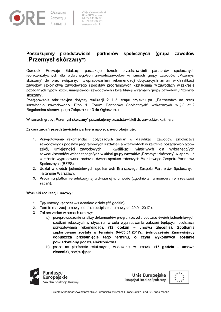Poszukujemy „Przemysł przedstawicieli skórzany”) partnerów społecznych (grupa zawodów Ośrodek Rozwoju Edukacji poszukuje trzech przedstawicieli partnerów społecznych reprezentatywnych dla wybranego/ych zawodu/zawodów w ramach grupy zawodów „Przemysł skórzany” do prac związanych z opracowaniem rekomendacji dotyczących zmian w klasyfikacji zawodów szkolnictwa zawodowego i podstaw programowych kształcenia w zawodach w zakresie pożądanych typów szkół, umiejętności zawodowych i kwalifikacji w ramach grupy zawodów „Przemysł skórzany”. Postępowanie rekrutacyjne dotyczy realizacji 2. i 3. etapu projektu pn. „Partnerstwo na rzecz kształcenia zawodowego, Etap 1. Forum Partnerów Społecznych” wskazanych w § 3 ust. 2 Regulaminu stanowiącego Załącznik nr 3 do Ogłoszenia. W ramach grupy „Przemysł skórzany” poszukujemy przedstawicieli do zawodów: kuśnierz Zakres zadań przedstawiciela partnera społecznego obejmuje: 1. Przygotowanie rekomendacji dotyczących zmian w klasyfikacji zawodów szkolnictwa zawodowego i podstaw programowych kształcenia w zawodach w zakresie pożądanych typów szkół, umiejętności zawodowych i kwalifikacji właściwych dla wybranego/ych zawodu/zawodów wchodzącego/ych w skład grupy zawodów „Przemysł skórzany” w oparciu o założenia wypracowane podczas dwóch spotkań roboczych Branżowego Zespołu Partnerów Społecznych (BZPS). 2. Udział w dwóch jednodniowych spotkaniach Branżowego Zespołu Partnerów Społecznych na terenie Warszawy. 3. Praca na platformie edukacyjnej wskazanej w umowie (zgodnie z harmonogramem realizacji zadań). Warunki realizacji umowy: 1. Typ umowy: łączona – zlecenie/o dzieło (55 godzin). 2. Termin realizacji umowy: od dnia podpisania umowy do 20.01.2017 r. 3. Zakres zadań w ramach umowy: a) przeprowadzenie analizy dokumentów programowych, podczas dwóch jednodniowych spotkań roboczych w styczniu, w celu wypracowania założeń będących podstawą przygotowania rekomendacji, (12 godzin – umowa zlecenia). Spotkania zaplanowane zostały w terminie 04-05.01.2017r., jednocześnie Zamawiający dopuszcza przesunięcie tego terminu, o czym wykonawca zostanie powiadomiony pocztą elektroniczną. b) praca na platformie edukacyjnej wskazanej w umowie (18 godzin – umowa zlecenia), obejmująca: Projekt współfinansowany przez Unię Europejską w ramach Europejskiego Funduszu Społecznego – przekazanie wniosków i uwag wynikających z analizy dokumentów programowych wskazanych w pkt.3 lit. a), – wypracowywanie uwag i wniosków (z pomocą narzędzia elektronicznego – ankieta online) będących podstawą przygotowania rekomendacji, – udzielanie informacji będących podstawą opracowania Raportu z prac zespołu branżowego przez moderatora; c) przygotowanie rekomendacji dotyczących zmian w klasyfikacji zawodów szkolnictwa zawodowego i podstaw programowych kształcenia w zawodach w zakresie pożądanych typów szkół, umiejętności zawodowych i kwalifikacji właściwych dla wybranego/ych zawodu/zawodów wchodzącego/ych w skład grupy zawodów „Przemysł skórzany”, w oparciu o założenia wypracowane podczas dwóch spotkań roboczych Branżowych Zespołów Partnerów Społecznych (BZPS) oraz wypracowane uwagi i wnioski na platformie edukacyjnej wskazanej w umowie, według szablonu w załączniku do umowy (25 godzin – umowa o dzieło). 4. Warunki finansowe: Na podstawie wniosku o dofinansowanie projektu Zamawiający określa następujący maksymalny limit kosztów na poszczególne wydatki związane z opisanym zadaniem: realizacja przedmiotu umowy: 50 zł/godzina * 55 h = 2750 zł/os. Informacje uzupełniające: 1. Wykonawcy zobowiązani będą do przedstawiania oświadczenia w postaci protokołu o faktycznej liczbie godzin, którą przeznaczyli na realizację umowy w ujęciu miesięcznym oraz poświadczą, że łączna miesięczna liczba godzin zadań realizowanych w ramach wszystkich projektów finansowanych z funduszy strukturalnych i Funduszu Spójności oraz zadań finansowanych z innych źródeł, obejmujących okres realizacji umowy zawartej z ORE nie przekracza łącznie 276 godzin miesięcznie. Jednocześnie wykonawca będzie zobowiązany do złożenia oświadczenia, że obciążenie zawodowe nie wyklucza możliwości prawidłowej i efektywnej realizacji wszystkich zadań powierzonych mu w ramach projektu. 2. W ramach spotkań określonych w pkt 3 Zakresu zadań przedstawiciela partnera społecznego Zamawiający zapewnia i finansuje nocleg przed każdym spotkaniem oraz wyżywienie w trakcie każdego spotkania i zwraca koszty podróży uczestnikom każdego spotkania (do 200 zł - zgodnie z cennikiem biletów II klasy). 3. Spotkania BZPS odbywać się będą w weekendy. Zamawiający zastrzega sobie możliwość zmiany terminów spotkań (zgodnie z harmonogramem realizacji zadań). Zamawiający zastrzega sobie możliwość niewyłonienia Wykonawców bez podania przyczyny. Wymagania stawiane Wykonawcy Wymagania obowiązkowe (oceniane: spełnia/ nie spełnia): 1. Min. 3-letnie doświadczenie zawodowe w wybranym/ych zawodzie/zawodach w ramach grupy zawodów „Przemysł skórzany”. Projekt współfinansowany przez Unię Europejską w ramach Europejskiego Funduszu Społecznego 2. Wykształcenie zawodowe co najmniej zasadnicze/średnie zawodzie/zawodach w ramach grupy zawodów „Przemysł skórzany”. w wybranym/ych 3. Rekomendacja co najmniej jednego partnera społecznego, reprezentatywnego wybranego/ych zawodu/zawodów w ramach grupy zawodowej „Przemysł skórzany”. dla 4. Średnie miesięczne zaangażowanie w realizację zadań we wszystkich projektach finansowanych z funduszy strukturalnych i Funduszu Spójności oraz z zadań finansowanych z innych źródeł (w tym umowa o pracę, umowy zlecenie, umowy o dzieło, działalność gospodarcza) nieprzekraczające 240 godzin. Kryteria oceny wyboru najkorzystniejszej oferty: 1. Oferent może zdobyć maksym