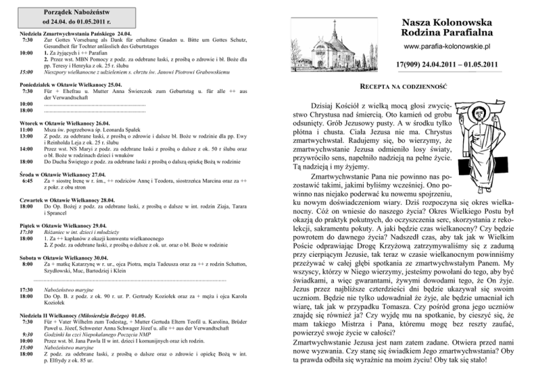 Porządek Nabożeństw od 24.04. do 01.05.2011 r. Niedziela Zmartwychwstania Pańskiego 24.04. 7:30 Zur Gottes Vorsehung als Dank für erhaltene Gnaden u. Bitte um Gottes Schutz, Gesundheit für Tochter anlässlich des Geburtstages 10:00 1. Za żyjących i ++ Parafian 2. Przez wst. MBN Pomocy z podz. za odebrane łaski, z prośbą o zdrowie i bł. Boże dla pp. Teresy i Henryka z ok. 25 r. ślubu 15:00 Nieszpory wielkanocne z udzieleniem s. chrztu św. Janowi Piotrowi Grabowskiemu Poniedziałek w Oktawie Wielkanocy 25.04. 7:30 Für + Ehefrau u. Mutter Anna Świerczok zum Geburtstag u. für alle ++ aus der Verwandtschaft 10:00 ......................................................................... 18:00 ......................................................................... Wtorek w Oktawie Wielkanocy 26.04. 11:00 Msza św. pogrzebowa śp. Leonarda Spałek 13:00 Z podz. za odebrane łaski, z prośbą o zdrowie i dalsze bł. Boże w rodzinie dla pp. Ewy i Reinholda Leja z ok. 25 r. ślubu 14:00 Przez wst. NS Maryi z podz. za odebrane łaski z prośbą o dalsze z ok. 50 r ślubu oraz o bł. Boże w rodzinach dzieci i wnuków 18:00 Do Ducha Świętego z podz. za odebrane łaski z prośbą o dalszą opiekę Bożą w rodzinie Środa w Oktawie Wielkanocy 27.04. 6:45 Za + siostrę Irenę w r. śm., ++ rodziców Annę i Teodora, siostrzeńca Marcina oraz za ++ z pokr. z obu stron Czwartek w Oktawie Wielkanocy 28.04. 18:00 Do Op. Bożej z podz. za odebrane łaski, z prośbą o dalsze w int. rodzin Ziaja, Tarara i Sprancel Piątek w Oktawie Wielkanocy 29.04. 17:30 Różaniec w int. dzieci i młodzieży 18:00 1. Za ++ kapłanów z okazji konwentu wielkanocnego 2. Z podz. za odebrane łaski, z prośbą o dalsze z ok. ur. oraz o bł. Boże w rodzinie Sobota w Oktawie Wielkanocy 30.04. 8:00 Za + matkę Katarzynę w r. ur., ojca Piotra, męża Tadeusza oraz za ++ z rodzin Schatton, Szydłowski, Muc, Bartodziej i Klein 17:30 18:00 Nabożeństwo maryjne Do Op. B. z podz. z ok. 90 r. ur. P. Gertrudy Koziołek oraz za + męża i ojca Karola Koziołek Niedziela II Wielkanocy (Miłosierdzia Bożego) 01.05. 7:30 Für + Vater Wilhelm zum Todestag, + Mutter Gertuda Eltern Teofil u. Karolina, Brüder Paweł u. Józef, Schwester Anna Schwager Józef u. alle ++ aus der Verwandtschaft 9:30 Godzinki ku czci Niepokalanego Poczęcia NMP 10:00 Przez wst. bł. Jana Pawła II w int. dzieci I komunijnych oraz ich rodzin. 15:00 Nabożeństwo maryjne 18:00 Z podz. za odebrane łaski, z prośbą o dalsze oraz o zdrowie i opiekę Bożą w int. p. Elfrydy z ok. 85 ur. Nasza Kolonowska Rodzina Parafialna www.parafia-kolonowskie.pl 17(909) 24.04.2011 – 01.05.2011 RECEPTA NA CODZIENNOŚĆ Dzisiaj Kościół z wielką mocą głosi zwycięstwo Chrystusa nad śmiercią. Oto kamień od grobu odsunięty. Grób Jezusowy pusty. A w środku tylko płótna i chusta. Ciała Jezusa nie ma. Chrystus zmartwychwstał. Radujemy się, bo wierzymy, że zmartwychwstanie Jezusa odmieniło losy światy, przywróciło sens, napełniło nadzieją na pełne życie. Tą nadzieją i my żyjemy. Zmartwychwstanie Pana nie powinno nas pozostawić takimi, jakimi byliśmy wcześniej. Ono powinno nas niejako poderwać ku nowemu spojrzeniu, ku nowym doświadczeniom wiary. Dziś rozpoczyna się okres wielkanocny. Cóż on wniesie do naszego życia? Okres Wielkiego Postu był okazją do praktyk pokutnych, do oczyszczenia serc, skorzystania z rekolekcji, sakramentu pokuty. A jaki będzie czas wielkanocny? Czy będzie powrotem do dawnego życia? Nadszedł czas, aby tak jak w Wielkim Poście odprawiając Drogę Krzyżową zatrzymywaliśmy się z zadumą przy cierpiącym Jezusie, tak teraz w czasie wielkanocnym powinniśmy przeżywać w całej głębi spotkania ze zmartwychwstałym Panem. My wszyscy, którzy w Niego wierzymy, jesteśmy powołani do tego, aby być świadkami, a więc gwarantami, żywymi dowodami tego, że On żyje. Jezus przez najbliższe czterdzieści dni będzie ukazywał się swoim uczniom. Będzie nie tylko udowadniał że żyje, ale będzie umacniał ich wiarę, tak jak w przypadku Tomasza. Czy pośród grona jego uczniów znajdę się również ja? Czy wyjdę mu na spotkanie, by cieszyć się, że mam takiego Mistrza i Pana, któremu mogę bez reszty zaufać, powierzyć swoje życie w całości? Zmartwychwstanie Jezusa jest nam zatem zadane. Otwiera przed nami nowe wyzwania. Czy stanę się świadkiem Jego zmartwychwstania? Oby ta prawda odbiła się wyraźnie na moim życiu! Oby tak się stało! 17/2011 Wielkanocny chleb W Wielką Sobotę każdego roku z kuchni unosił się nieopisanie piękny zapach. W niedzielę wielkanocną babcia nacinała znak krzyża na upieczonym bochenku chleba, kroiła go na kromki, smarowała je miodem i podawała nam po kolei. Teraz była dla niej Wielkanoc. „Babciu, dlaczego pieczesz chleb tylko jeden raz w roku i to właśnie na Wielkanoc?” Po tym pytaniu babcia spojrzała w dal i zaczęła opowiadać: „Było to po pierwszej wojnie światowej. Garstka uzbrojonych mężczyzn zapukała do drzwi naszego domu. Dziadek został aresztowany z powodu domniemanego u d z i a ł u w ruchu oporu, a my musieliśmy natychmiast opuścić Górny Śląsk. W czasie ucieczki zatrzymaliśmy się pewnego wieczoru w małej polskiej wiosce. Na noc zakwaterowano nas w letniej kuchni. Byliśmy bardzo głodni, ale nie mieliśmy już nic do jedzenia. Dzieci płakały. A wtedy młoda kobieta postawiła przed drzwiami miskę z mąką, talerz z zaczynem, dzbanek mleka i torebkę soli. Byłam bezradna, bo jeszcze nigdy nie piekłam chleba. Wtedy przyszły inne kobiety i pomogły mi: prowadziły moje d ł o n i e i językiem migowym pokazywały mi, co mam robić. Kiedy gotowy bochen chleba leżał już pachnący na stole, byłam bardzo szczęśliwa. Kobiety powiedziały mi w łamanym języku niemieckim, który był trudny do zrozumienia, że powinnam pokroić ten chleb dopiero następnego dnia, ponieważ była to Wielkanoc. Dały mi je