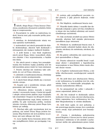 L R Rozdział 2 15. potem, gdy pożądliwość pocznie, rodzi grzech, a gdy grzech dojrzeje, rodzi śmierć. Dostępne przekłady 1 Rozdziału *W-jk1* Tysiąclecia Warszawsko-Praska Poznańska World English Bible Grecka Wulgata Interlinearna Gdańska Brzeska King James Version 16. Nie błądźcie, umiłowani bracia moi. 1 Jakub, sługa Boga i Pana Jezusa Chrystusa, pozdrawia dwanaście pokoleń, które żyją w rozproszeniu. 2. Poczytujcie to sobie za najwyższą radość, bracia moi, gdy rozmaite próby przechodzicie, 3. wiedząc, że doświadczenie wiary waszej sprawia wytrwałość, 4. wytrwałość zaś niech prowadzi do dzieła doskonałego, abyście byli doskonali i nienaganni, nie mający żadnych braków. 5. A jeśli komu z was brak mądrości, niech prosi Boga, który wszystkich obdarza chętnie i bez wypominania, a będzie mu dana. 6. Ale niech prosi z wiarą, bez powątpiewania; kto bowiem wątpi, podobny jest do fali morskiej, przez wiatr tu i tam miotanej. 7. Przeto niechaj nie mniema taki człowiek, że coś od Pana otrzyma, 8. człowiek o rozdwojonej duszy, chwiejny w całym swoim postępowaniu. 9. A niech brat ubogi chlubi się z wywyższenia swego, 10. bogaty zaś z poniżenia swego, gdyż przeminie jak kwiat trawy. 11. Albowiem słońce wzeszło z żarem swoim i wysuszyło trawę, i kwiat jej opadł, i uległo zniszczeniu piękno jego wyglądu; tak zmarnieje i bogacz na drogach swoich. 12. Błogosławiony mąż, który wytrwa w próbie, bo gdy wytrzyma próbę, weźmie wieniec żywota, obiecany przez Boga tym, którzy go miłują. 13. Niechaj nikt, gdy wystawiony jest na pokusę, nie mówi: Przez Boga jestem kuszony; Bóg bowiem nie jest podatny na pokusy ani sam nikogo nie kusi. 14. Lecz każdy bywa kuszony przez własne pożądliwości, które go pociągają i nęcą; 1276 List Jakuba 17. Wszelki datek dobry i wszelki dar doskonały zstępuje z góry od Ojca światłości; u niego nie ma żadnej odmiany ani nawet chwilowego zaćmienia. 18. Gdy zechciał, zrodził nas przez Słowo prawdy, abyśmy byli niejako pierwszym zarodkiem jego stworzeń. 19. Wiedzcie to, umiłowani bracia moi. A niech każdy człowiek będzie skory do słuchania, nieskory do mówienia, nieskory do gniewu. 20. Bo gniew człowieka nie czyni tego, co jest sprawiedliwe u Boga. 21. Przeto odrzućcie wszelki brud i nadmiar złości i przyjmijcie z łagodnością wszczepione w was Słowo, które może zbawić dusze wasze. 22. A bądźcie wykonawcami Słowa, a nie tylko słuchaczami, oszukującymi samych siebie. 23. Bo jeśli ktoś jest słuchaczem Słowa, a nie wykonawcą, to podobny jest do człowieka, który w zwierciadle przygląda się swemu naturalnemu obliczu; 24. bo przypatrzył się sobie i odszedł, i zaraz zapomniał, jakim jest. 25. Ale kto wejrzał w doskonały zakon wolności i trwa w nim, nie jest słuchaczem, który zapomina, lecz wykonawcą; ten będzie błogosławiony w swoim działaniu. 26. Jeśli ktoś sądzi, że jest pobożny, a nie powściąga języka swego, lecz oszukuje serce swoje, tego pobożność jest bezużyteczna. 27. Czystą i nieskalaną pobożnością przed Bogiem i Ojcem jest to: nieść pomoc sierotom i wdowom w ich niedoli i zachowywać siebie nie splamionym przez świat. L R Biblia Warszawska L R List Jakuba 13. Nad tym, który nie okazał miłosierdzia, odbywa się sąd bez miłosierdzia, miłosierdzie góruje nad sądem. Dostępne przekłady 2 Rozdziału *W-jk2* Tysiąclecia Warszawsko-Praska Poznańska World English Bible Grecka Wulgata Interlinearna Gdańska Brzeska King James Version 2 Bracia moi, nie czyńcie różnicy między osobami przy wyznawaniu wiary w Jezusa Chrystusa, naszego Pana chwały. 2. Bo gdyby na wasze zgromadzenie przyszedł człowiek ze złotymi pierścieniami na palcach i we wspaniałej szacie, a przyszedłby też ubogi w nędznej szacie, 3. a wy zwrócilibyście oczy na tego, który nosi wspaniałą szatę i powiedzielibyście: Ty usiądź tu wygodnie, a ubogiemu powiedzielibyście: Ty stań sobie tam lub usiądź u podnóżka mego, 4. to czyż nie uczyniliście różnicy między sobą i nie staliście się sędziami, którzy fałszywie rozumują? 5. Posłuchajcie, bracia moi umiłowani! Czyż to nie Bóg wybrał ubogich w oczach świata, aby byli bogatymi w wierze i dziedzicami Królestwa, obiecanego tym, którzy go miłują? 6. Wy zaś wzgardziliście ubogim. Czyż nie bogacze ciemiężą was i nie oni ciągną was do sądów? 7. Czy to nie oni zniesławiają zacne dobre imię, które zostało nad wami wezwane? 8. Jeśli jednak wypełniacie zgodnie z Pismem królewskie przykazanie: Będziesz miłował bliźniego swego jak siebie samego, dobrze czynicie. 9. Lecz jeśli czynicie różnicę między osobami, popełniacie grzech i jesteście uznani przez zakon za przestępców. 10. Ktokolwiek bowiem zachowa cały zakon, a uchybi w jednym, stanie się winnym wszystkiego. 11. Bo Ten, który powiedział: Nie cudzołóż, powiedział też: Nie zabijaj; jeżeli więc nie cudzołożysz, ale zabijasz, jesteś przestępcą zakonu. 12. Tak mówcie i czyńcie, jak ci, którzy mają być sądzeni przez zakon wolności. Biblia Warszawska Rozdział 3 14. Cóż to pomoże, bracia moi, jeśli ktoś mówi, że ma wiarę, a nie ma uczynków? Czy wiara może go zbawić? 15. Jeśli brat albo siostra nie mają się w co przyodziać i brakuje im powszedniego chleba, 16. a ktoś z was powiedziałby im: Idźcie w pokoju, ogrzejcie się i nasyćcie, a nie dalibyście im tego, czego ciało potrzebuje, cóż to pomoże? 17. Tak i wiara, jeżeli nie ma uczynków, martwa jest sama w sobie. 18. Lecz powie ktoś: Ty masz wiarę, a ja mam uczynki; pokaż mi wiarę swoją bez uczynków, a ja ci pokażę wiarę z uczynków moich. 19. Ty wierzysz, że Bóg jest jeden? Dobrze czynisz; demony również wierzą i drżą. 20. Chcesz przeto poznać, nędzny człowieku, że wiara bez uczynków jest martwa? 21. Czyż Abraham, praojciec nasz, nie został usprawiedliwiony z uczynków, 