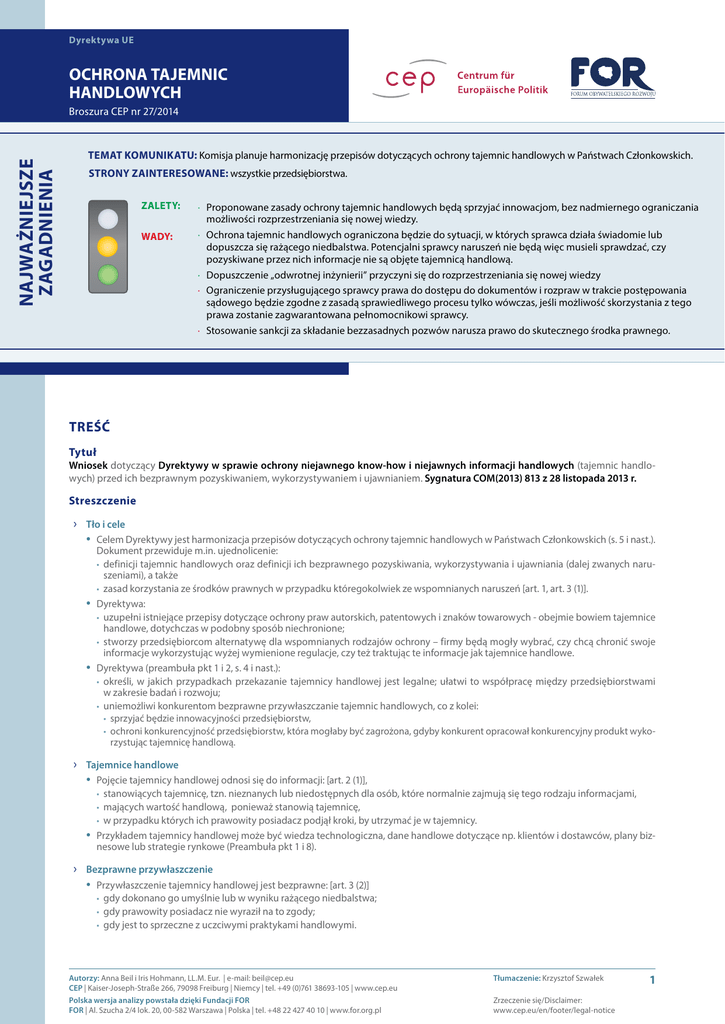 Dyrektywa UE OCHRONA TAJEMNIC HANDLOWYCH Broszura CEP nr 27/2014 NAJWAŻNIEJSZE ZAGADNIENIA TEMAT KOMUNIKATU: Komisja planuje harmonizację przepisów dotyczących ochrony tajemnic handlowych w Państwach Członkowskich. STRONY ZAINTERESOWANE: wszystkie przedsiębiorstwa. ZALETY: WADY: ·· Proponowane zasady ochrony tajemnic handlowych będą sprzyjać innowacjom, bez nadmiernego ograniczania możliwości rozprzestrzeniania się nowej wiedzy. ·· Ochrona tajemnic handlowych ograniczona będzie do sytuacji, w których sprawca działa świadomie lub dopuszcza się rażącego niedbalstwa. Potencjalni sprawcy naruszeń nie będą więc musieli sprawdzać, czy pozyskiwane przez nich informacje nie są objęte tajemnicą handlową. ·· Dopuszczenie „odwrotnej inżynierii” przyczyni się do rozprzestrzeniania się nowej wiedzy ·· Ograniczenie przysługującego sprawcy prawa do dostępu do dokumentów i rozpraw w trakcie postępowania sądowego będzie zgodne z zasadą sprawiedliwego procesu tylko wówczas, jeśli możliwość skorzystania z tego prawa zostanie zagwarantowana pełnomocnikowi sprawcy. ·· Stosowanie sankcji za składanie bezzasadnych pozwów narusza prawo do skutecznego środka prawnego. TREŚĆ Tytuł Wniosek dotyczący Dyrektywy w sprawie ochrony niejawnego know-how i niejawnych informacji handlowych (tajemnic handlowych) przed ich bezprawnym pozyskiwaniem, wykorzystywaniem i ujawnianiem. Sygnatura COM(2013) 813 z 28 listopada 2013 r. Streszczenie ›› Tło i cele • Celem Dyrektywy jest harmonizacja przepisów dotyczących ochrony tajemnic handlowych w Państwach Członkowskich (s. 5 i nast.). Dokument przewiduje m.in. ujednolicenie: • definicji tajemnic handlowych oraz definicji ich bezprawnego pozyskiwania, wykorzystywania i ujawniania (dalej zwanych naruszeniami), a także • zasad korzystania ze środków prawnych w przypadku któregokolwiek ze wspomnianych naruszeń [art. 1, art. 3 (1)]. • Dyrektywa: • uzupełni istniejące przepisy dotyczące ochrony praw autorskich, patentowych i znaków towarowych - obejmie bowiem tajemnice handlowe, dotychczas w podobny sposób niechronione; • stworzy przedsiębiorcom alternatywę dla wspomnianych rodzajów ochrony – firmy będą mogły wybrać, czy chcą chronić swoje informacje wykorzystując wyżej wymienione regulacje, czy też traktując te informacje jak tajemnice handlowe. • Dyrektywa (preambuła pkt 1 i 2, s. 4 i nast.): • określi, w jakich przypadkach przekazanie tajemnicy handlowej jest legalne; ułatwi to współpracę między przedsiębiorstwami w zakresie badań i rozwoju; • uniemożliwi konkurentom bezprawne przywłaszczanie tajemnic handlowych, co z kolei: • sprzyjać będzie innowacyjności przedsiębiorstw, • ochroni konkurencyjność przedsiębiorstw, która mogłaby być zagrożona, gdyby konkurent opracował konkurencyjny produkt wykorzystując tajemnicę handlową. ›› Tajemnice handlowe • Pojęcie tajemnicy handlowej odnosi się do informacji: [art. 2 (1)], • stanowiących tajemnicę, tzn. nieznanych lub niedostępnych dla osób, które normalnie zajmują się tego rodzaju informacjami, • mających wartość handlową, ponieważ stanowią tajemnicę, • w przypadku których ich prawowity posiadacz podjął kroki, by utrzymać je w tajemnicy. • Przykładem tajemnicy handlowej może być wiedza technologiczna, dane handlowe dotyczące np. klientów i dostawców, plany biznesowe lub strategie rynkowe (Preambuła pkt 1 i 8). ›› Bezprawne przywłaszczenie • Przywłaszczenie tajemnicy handlowej jest bezprawne: [art. 3 (2)] • gdy dokonano go umyślnie lub w wyniku rażącego niedbalstwa; • gdy prawowity posiadacz nie wyraził na to zgody; • gdy jest to sprzeczne z uczciwymi praktykami handlowymi. Autorzy: Anna Beil i Iris Hohmann, LL.M. Eur. | e-mail: [email protected] CEP | Kaiser-Joseph-Straße 266, 79098 Freiburg | Niemcy | tel. +49 (0)761 38693-105 | www.cep.eu Polska wersja analizy powstała dzięki Fundacji FOR FOR | Al. Szucha 2/4 lok. 20, 00-582 Warszawa | Polska | tel. +48 22 427 40 10 | www.for.org.pl Tłumaczenie: Krzysztof Szwałek Zrzeczenie się/Disclaimer: www.cep.eu/en/footer/legal-notice 1 Dyrektywa UE OCHRONA TAJEMNIC HANDLOWYCH Broszura CEP nr 27/2014 • Do naruszenia uczciwych praktyk handlowych dochodzi wówczas, gdy sprawca naruszenia uzyskuje nieuprawniony dostęp do dokumentów, przedmiotów lub plików cyfrowych [art. 3 (2) (a)]. • Za zgodne z uczciwymi praktykami handlowymi uznaje się jednak sytuacje, gdy produkt pozyskany zgodnie z prawem jest badany, demontowany lub testowany („odwrotna inżynieria”, art. 4 (1) (b), Preambuła pkt 10]. ›› Bezprawne wykorzystywanie lub ujawnianie • Wykorzystywanie lub ujawnianie tajemnic handlowych jest bezprawne: [art. 3 (3)] • gdy dokonano go umyślnie lub w wyniku rażącego niedbalstwa; • gdy prawowity posiadacz nie wyraził na to zgody oraz • gdy sprawca naruszenia: • wcześniej bezprawnie przywłaszczył tajemnicę handlową; • w wyniku wykorzystywania lub ujawniania tajemnic narusza zobowiązania umowne lub ustawowe. ›› Zgodne z prawem pozyskiwanie, wykorzystywanie lub ujawnianie tajemnic handlowych Do naruszenia tajemnicy handlowej nie dochodzi w sytuacji, gdy pozyskanie, wykorzystanie lub ujawnienie tej tajemnicy miało na celu ochronę „uzasadnionego interesu”, a w szczególności było związane z: [art. 4 (2)] • wywiązaniem się z obowiązków ustawowych; • korzystaniem z prawa do wolności wypowiedzi i informacji; • ujawnieniem nielegalnych praktyk w interesie publicznym (whistleblowing activity, preambuła pkt 12). ›› Środki prawne w przypadku stwierdzenia przez sąd naruszenia tajemnicy handlowej • Sąd może nakazać usunięcie naruszenia poprzez: [art. 11 (1)] • zakazanie (dalszego) wykorzystywania lub ujawniania tajemnic handlowych; • zakazanie – w przypadku naruszenia tajemnicy dotyczącej towarów – ich produkcji, oferowania, wp