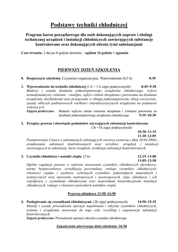 Podstawy techniki chłodniczej Program kursu początkowego dla osób dokonujących napraw i obsługi technicznej urządzeń i instalacji chłodniczych zawierających substancje kontrolowane oraz dokonujących obrotu tymi substancjami Czas trwania: 2 dni po 8 godzin dziennie – ogółem 16 godzin + egzamin PIERWSZY DZIEŃ SZKOLENIA 0. Rozpoczęcie szkolenia. Czynności organizacyjne. Wprowadzenie (0,5 h) 8:30 8:45–9:30 1. Wprowadzenie do techniki chłodniczej (1 h + 1 h zajęć praktycznych) Budowa i zasada działania jednostopniowego urządzenia chłodniczego, wykres termodynamiczny ciśnienie – entalpia, wpływ ciśnień skraplania i parowania na działanie urządzenia, dochłodzenie oraz przegrzanie w obiegu jednostopniowym, obieg rzeczywisty, zasady obliczeń podstawowych wielkości charakterystycznych urządzenia na podstawie wykresu p-h. Zajęcia praktyczne: Badanie wpływu zmian ciśnienia skraplania i ciśnienia parowania na działanie jednostopniowego urządzenia chłodniczego 9:35–10:20 2. Przepisy prawne i obowiązki podmiotów używających substancje kontrolowane (1h +1h zajęć praktycznych) 10:30–11:15 11:20–12:05 Postanowienia Ustawy o substancjach zubożających warstwę ozonową z dnia 20.04.2004r., oznakowanie substancji kontrolowanych oraz wyrobów, urządzeń i instalacji zawierających te substancje, karty urządzeń, ewidencja substancji kontrolowanych. 3. Czynniki chłodnicze i nośniki ciepła. (2 h) 12:15–13:00 13:05–13:50 Ogólne regulacje prawne w zakresie stosowania czynników chłodniczych (dyrektywy, normy bezpieczeństwa, certyfikacja personalna), rodzaje czynników chłodniczych, własności cieplne i użytkowe wybranych czynników jednorodnych naturalnych i syntetycznych oraz mieszanin zeotropowych i azeotropowych, oleje chłodnicze i ich współpraca z czynnikami chłodniczymi oraz materiałami konstrukcyjnymi instalacji chłodniczych, rodzaje i własności pośrednich nośników ciepła. Przerwa obiadowa 13:50–14:50 4. Posługiwanie się czynnikami chłodniczymi. (2h zajęć praktycznych) 14:50–15:35 Metody i zasady prowadzenia operacji napełniania i odzysku czynników chłodniczych, systemy i urządzenia stosowane do tego celu, recykling i regeneracja substancji kontrolowanych. Zajęcia praktyczne: Prowadzenie operacji odzysku czynnika chłodniczego Zakończenie pierwszego dnia szkolenia: 16:30 DRUGI DZIEŃ SZKOLENIA 5. Wyposażenie techniczne urządzeń chłodniczych. (2 h) 8:30–9:15 9:20–10:05 Sprężarki chłodnicze: rodzaje, budowa, działanie, ogólne zasady doboru, skraplacze i parowniki, pozostałe chłodnicze wymienniki ciepła, ogólne zasady doboru chłodniczych wymienników ciepła, aparatura pomocnicza i ogólne zasady jej doboru i obsługi, armatura chłodnicza. 6. Eksploatacja urządzeń chłodniczych – zagrożenia w nich występujące. (2 h) 10:15–11:00 11:05–11:50 Wpływ obecności oleju na pracę urządzenia chłodniczego, wpływ obecności gazów nie skraplających się na pracę urządzenia, zagrożenia występujące w pracy sprężarek chłodniczych, wpływ szronu na pracę chłodnicy powietrza, podstawy oszczędzania energii w układach chłodniczych. 7. Montaż, obsługa i konserwacja urządzeń chłodniczych. (2 h) 11:55–12:40 12:45–13:30 Wymagania w zakresie montażu, obsługi i konserwacji urządzeń chłodniczych, naprawy instalacji chłodniczych, kontrola szczelności i pracy układów, zapobieganie emisji czynników chłodniczych do atmosfery. Przerwa obiadowa 13:30–14:30 8. Automatyka chłodnicza. (2 h) 14:30–15:15 15:20–16:05 Cechy obiektów chłodniczych (typowe zakłócenia), zadania i klasyfikacja elementów automatyki do zasilania parowników, zawory rozprężne: termostatyczne i elektroniczne (budowa, działania, zastosowanie). Ogólne zasady regulacji temperatury w obiektach chłodniczych, przykłady zastosowania regulatorów automatycznych w instalacjach chłodniczych. Zakończenie zajęć: 16:10 EGZAMIN 16:30–19:30