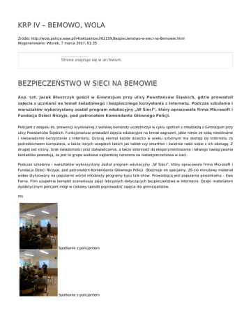 KRP IV – BEMOWO, WOLA Źródło: http://wola.policja.waw.pl/r4/aktualnosci/61159,Bezpieczenstwo-w-sieci-na-Bemowie.html Wygenerowano: Wtorek, 7 marca 2017, 01:35 Strona znajduje się w archiwum. BEZPIECZEŃSTWO W SIECI NA BEMOWIE Asp. szt. Jacek Błaszczyk gościł w Gimnazjum przy ulicy Powstańców Śląskich, gdzie prowadził zajęcia z uczniami na temat świadomego i bezpiecznego korzystania z Internetu. Podczas szkolenia i warsztatów wykorzystany został program edukacyjny „W Sieci”, który opracowała firma Microsoft i Fundacja Dzieci Niczyje, pod patronatem Komendanta Głównego Policji. Policjant z zespołu ds. prewencji kryminalnej z wolskiej komendy uczestniczył w cyklu spotkań z młodzieżą z Gimnazjum przy ulicy Powstańców Śląskich. Funkcjonariusz prowadził zajęcia edukacyjne na temat zagrożeń, jakie niesie ze sobą nieostrożne i nieświadome korzystanie z Internetu. Dzisiaj niemal każde dziecko w wieku szkolnym ma dostęp do Internetu za pośrednictwem komputera, a także innych urządzeń takich jak tablet czy smartfon i świetnie radzi sobie z ich obsługą. Z drugiej zaś strony, brak świadomości oraz doświadczenia, a także skłonność do eksperymentowania i łatwego nawiązywania kontaktów powodują, że jest to grupa wiekowa najbardziej narażona na niebezpieczeństwa w sieci. Podczas szkolenia i warsztatów wykorzystany został program edukacyjny „W Sieci”, który opracowała firma Microsoft i Fundacja Dzieci Niczyje, pod patronatem Komendanta Głównego Policji. Obejmuje on specjalny, 25-cio minutowy materiał wideo stylizowany na popularne wśród młodzieży programy typu talk-show. Prowadzącą jest popularna piosenkarka – Ewa Farna. Film uzupełnia komplet scenariuszy zajęć lekcyjnych dotyczących bezpieczeństwa w Internecie. Dzięki materiałom dydaktycznym policjant mógł w ciekawy sposób poprowadzić zajęcia dla gimnazjalistów. ms Spotkanie z policjantem Spotkanie z policjantem Ocena: 0/5 (0) Tweetnij