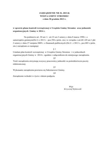 ZARZĄDZENIE NR 36 .2013.K WÓJTA GMINY STROMIEC z dnia 30 grudnia 2013 r. w sprawie planu kontroli wewnętrznej w Urzędzie Gminy Stromiec oraz jednostek organizacyjnych Gminy w 2014 r. Na podstawie art. 30 ust.1 i art.33 ust.3 ustawy z dnia 8 marca 1990 r. o samorządzie gminnym(Dz.U.z 2013 r. poz.594 z późn. zm.) w związku z art.68 i 69 ust.1 pkt 2 ustawy z dnia 27 sierpnia 2009 r. o finansach publicznych (Dz.U. z 2013 r., poz.885 z późn. zm.) zarządzam co następuje: §1 Ustalam plan kontroli wewnętrznej w Urzędzie Gminy Stromiec i w jednostkach organizacyjnych Gminy w 2014 r. zgodnie z załącznikiem do niniejszego zarządzenia. §2 Treść zarządzenia otrzymują wszyscy pracownicy jednostki za pośrednictwem poczty elektronicznej. §3 Wykonanie zarządzenia powierza się Sekretarzowi Gminy. §4 Zarządzenie wchodzi w Ŝycie z dniem podjęcia. Wójt Krzysztof Stykowski Załącznik do Zarządzenia Nr 36..2013.K z dnia 31 grudnia 2013 r. Lp. 1 Zakres kontroli Planowany termin kontroli Jednostka lub osoba kontrolowana Wszyscy pracownicy Urzędu Gminy Stromiec Przeprowadzający kontrolę Sekretarz Gminy Z-ca Kierownika USC Skarbnik Pracownik ds. kadr, szkoleń i funduszy pomocowych Koordynator kontroli zarządczej Z-ca Wójta Skarbnik Gminy Koordynator kontroli zarządczej w UG Sekretarz Gminy Prawidłowość oznakowania teczek , akt osobowych. Przestrzeganie instrukcji archiwum zakładowego. Aktualność kart informacyjnych zamieszczonych w BIP, udzielanie informacji publicznej na wniosek Prawidłowość naliczania wynagrodzeń i ich pochodnych , podatku i składek na ubezpieczenie społeczne pracowników oraz zatrudnionych na podstawie umów zlecenia Badanie poprawności prowadzenia rejestru skarg i wniosków, rejestru zarządzeń oraz dziennika korespondencji przychodzącej II kwartał 2014 r. Pracownik ds. księgowości i płac II kwartał 2014 r. 4. Funkcjonowanie kontroli zarządczej w PSP Podlesie DuŜe II kwartał 2014 r Pracownik ds. obsługi sekretariatu oraz inwestycji PSP Podlesie DuŜe 5. Prawidłowość realizacji ustawy o wychowaniu w trzeźwości i przeciwdziałaniu alkoholizmowi Prawidłowość wykonywanie zadań z zakresu obsługi rady gminy . Kontrola powszechności opodatkowania podatkiem od nieruchomości III kwartał 2014 r. 7. Egzekucja naleŜności z tytułu podatków i opłat lokalnych, opłat za odpady III kwartał 2014 r. 8. Kontrola gospodarki finansowej w PSP Bobrek III kwartał 2014 r. PSP Bobrek 9. Badanie stanu zabezpieczenia , pieczęci, urządzeń oraz dokumentacji po zakończeniu pracy III kwartał 2014 r. Wszyscy pracownicy Urzędu Gminy 2. 3. 6. Sporządziła: Maria Brzezińska I kwartał 2014 r. II-IV kwartał 2014 r. Pracownik ds. działalności gospodarczej obsługi rady gminy Wskazane przez kierownika Urzędu osoby fizyczne, jednostki organizacyjne Pracownik ds. podatków i opłat Pracownik ds. opłat lokalnych i bhp Uwagi Pracownik ds. podatków i opłat Pracownik ds. opłat lokalnych i bhp Skarbnik Gminy Z-ca Wójta Skarbnik Pracownik ds. oświaty Sekretarz Gminy Kierownik USC Zatwierdził: Wójt Krzysztof Stykowski