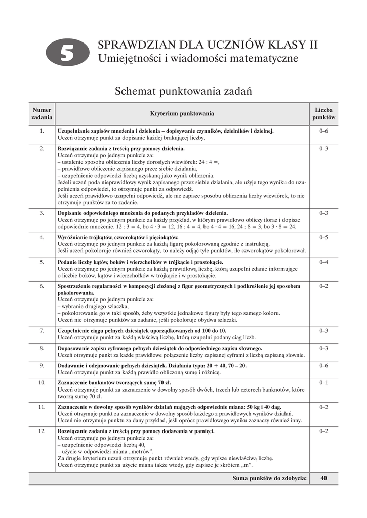 5 SprawdZian dla UcZniów klaSy ii Umiejętności i wiadomości matematyczne Schemat punktowania zadań Numer zadania Liczba punktów Kryterium punktowania 1. Uzupełnianie zapisów mnożenia i dzielenia – dopisywanie czynników, dzielników i dzielnej. Uczeń otrzymuje punkt za dopisanie każdej brakującej liczby. 0–6 2. Rozwiązanie zadania z treścią przy pomocy dzielenia. Uczeń otrzymuje po jednym punkcie za: – ustalenie sposobu obliczenia liczby dorosłych wiewiórek: 24 : 4 =, – prawidłowe obliczenie zapisanego przez siebie działania, – uzupełnienie odpowiedzi liczbą uzyskaną jako wynik obliczenia. Jeżeli uczeń poda nieprawidłowy wynik zapisanego przez siebie działania, ale użyje tego wyniku do uzupełnienia odpowiedzi, to otrzymuje punkt za odpowiedź. Jeśli uczeń prawidłowo uzupełni odpowiedź, ale nie zapisze sposobu obliczenia liczby wiewiórek, to nie otrzymuje punktów za to zadanie. 0–3 3. Dopisanie odpowiedniego mnożenia do podanych przykładów dzielenia. Uczeń otrzymuje po jednym punkcie za każdy przykład, w którym prawidłowo obliczy iloraz i dopisze odpowiednie mnożenie. 12 : 3 = 4, bo 4 ∙ 3 = 12, 16 : 4 = 4, bo 4 ∙ 4 = 16, 24 : 8 = 3, bo 3 ∙ 8 = 24. 0–3 4. Wyróżnianie trójkątów, czworokątów i pięciokątów. Uczeń otrzymuje po jednym punkcie za każdą figurę pokolorowaną zgodnie z instrukcją. Jeśli uczeń pokoloruje również czworokąty, to należy odjąć tyle punktów, ile czworokątów pokolorował. 0–5 5. Podanie liczby kątów, boków i wierzchołków w trójkącie i prostokącie. Uczeń otrzymuje po jednym punkcie za każdą prawidłową liczbę, którą uzupełni zdanie informujące o liczbie boków, kątów i wierzchołków w trójkącie i w prostokącie. 0–4 6. Spostrzeżenie regularności w kompozycji złożonej z figur geometrycznych i podkreślenie jej sposobem pokolorowania. Uczeń otrzymuje po jednym punkcie za: – wybranie drugiego szlaczka, – pokolorowanie go w taki sposób, żeby wszystkie jednakowe figury były tego samego koloru. Uczeń nie otrzymuje punktów za zadanie, jeśli pokoloruje obydwa szlaczki. 0–2 7. Uzupełnienie ciągu pełnych dziesiątek uporządkowanych od 100 do 10. Uczeń otrzymuje punkt za każdą właściwą liczbę, którą uzupełni podany ciąg liczb. 0–3 8. Dopasowanie zapisu cyfrowego pełnych dziesiątek do odpowiedniego zapisu słownego. Uczeń otrzymuje punkt za każde prawidłowe połączenie liczby zapisanej cyframi z liczbą zapisaną słownie. 0–3 9. Dodawanie i odejmowanie pełnych dziesiątek. Działania typu: 20 + 40, 70 – 20. Uczeń otrzymuje punkt za każdą prawidło obliczoną sumę i różnicę. 0–6 10. Zaznaczenie banknotów tworzących sumę 70 zł. Uczeń otrzymuje punkt za zaznaczenie w dowolny sposób dwóch, trzech lub czterech banknotów, które tworzą sumę 70 zł. 0–1 11. Zaznaczenie w dowolny sposób wyników działań mających odpowiednie miana: 50 kg i 40 dag. Uczeń otrzymuje punkt za zaznaczenie w dowolny sposób każdego z prawidłowych wyników działań. Uczeń nie otrzymuje punktu za dany przykład, jeśli oprócz prawidłowego wyniku zaznaczy również inny. 0–2 12. Rozwiązanie zadania z treścią przy pomocy dodawania w pamięci. Uczeń otrzymuje po jednym punkcie za: – uzupełnienie odpowiedzi liczbą 40, – użycie w odpowiedzi miana „metrów”. Za drugie kryterium uczeń otrzymuje punkt również wtedy, gdy wpisze niewłaściwą liczbę. Uczeń otrzymuje punkt za użycie miana także wtedy, gdy zapisze je skrótem „m”. 0–2 Suma punktów do zdobycia: 40