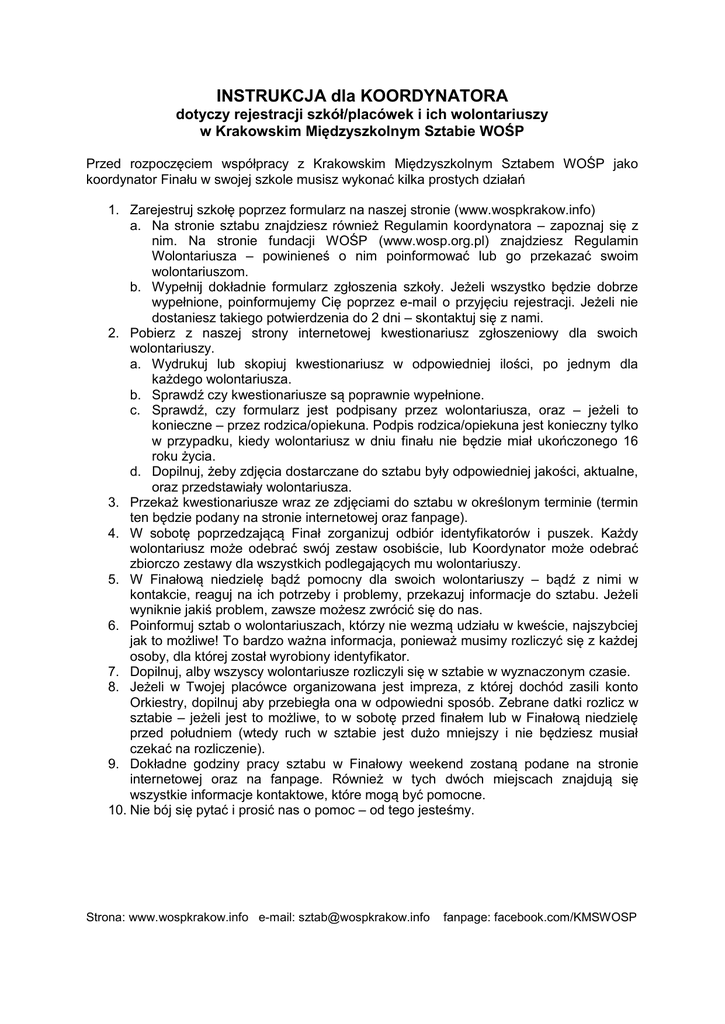 INSTRUKCJA dla KOORDYNATORA dotyczy rejestracji szkół/placówek i ich wolontariuszy w Krakowskim Międzyszkolnym Sztabie WOŚP Przed rozpoczęciem współpracy z Krakowskim Międzyszkolnym Sztabem WOŚP jako koordynator Finału w swojej szkole musisz wykonać kilka prostych działań 1. Zarejestruj szkołę poprzez formularz na naszej stronie (www.wospkrakow.info) a. Na stronie sztabu znajdziesz również Regulamin koordynatora – zapoznaj się z nim. Na stronie fundacji WOŚP (www.wosp.org.pl) znajdziesz Regulamin Wolontariusza – powinieneś o nim poinformować lub go przekazać swoim wolontariuszom. b. Wypełnij dokładnie formularz zgłoszenia szkoły. Jeżeli wszystko będzie dobrze wypełnione, poinformujemy Cię poprzez e-mail o przyjęciu rejestracji. Jeżeli nie dostaniesz takiego potwierdzenia do 2 dni – skontaktuj się z nami. 2. Pobierz z naszej strony internetowej kwestionariusz zgłoszeniowy dla swoich wolontariuszy. a. Wydrukuj lub skopiuj kwestionariusz w odpowiedniej ilości, po jednym dla każdego wolontariusza. b. Sprawdź czy kwestionariusze są poprawnie wypełnione. c. Sprawdź, czy formularz jest podpisany przez wolontariusza, oraz – jeżeli to konieczne – przez rodzica/opiekuna. Podpis rodzica/opiekuna jest konieczny tylko w przypadku, kiedy wolontariusz w dniu finału nie będzie miał ukończonego 16 roku życia. d. Dopilnuj, żeby zdjęcia dostarczane do sztabu były odpowiedniej jakości, aktualne, oraz przedstawiały wolontariusza. 3. Przekaż kwestionariusze wraz ze zdjęciami do sztabu w określonym terminie (termin ten będzie podany na stronie internetowej oraz fanpage). 4. W sobotę poprzedzającą Finał zorganizuj odbiór identyfikatorów i puszek. Każdy wolontariusz może odebrać swój zestaw osobiście, lub Koordynator może odebrać zbiorczo zestawy dla wszystkich podlegających mu wolontariuszy. 5. W Finałową niedzielę bądź pomocny dla swoich wolontariuszy – bądź z nimi w kontakcie, reaguj na ich potrzeby i problemy, przekazuj informacje do sztabu. Jeżeli wyniknie jakiś problem, zawsze możesz zwrócić się do nas. 6. Poinformuj sztab o wolontariuszach, którzy nie wezmą udziału w kweście, najszybciej jak to możliwe! To bardzo ważna informacja, ponieważ musimy rozliczyć się z każdej osoby, dla której został wyrobiony identyfikator. 7. Dopilnuj, alby wszyscy wolontariusze rozliczyli się w sztabie w wyznaczonym czasie. 8. Jeżeli w Twojej placówce organizowana jest impreza, z której dochód zasili konto Orkiestry, dopilnuj aby przebiegła ona w odpowiedni sposób. Zebrane datki rozlicz w sztabie – jeżeli jest to możliwe, to w sobotę przed finałem lub w Finałową niedzielę przed południem (wtedy ruch w sztabie jest dużo mniejszy i nie będziesz musiał czekać na rozliczenie). 9. Dokładne godziny pracy sztabu w Finałowy weekend zostaną podane na stronie internetowej oraz na fanpage. Również w tych dwóch miejscach znajdują się wszystkie informacje kontaktowe, które mogą być pomocne. 10. Nie bój się pytać i prosić nas o pomoc – od tego jesteśmy. Strona: www.wospkrakow.info e-mail: [email protected] fanpage: facebook.com/KMSWOSP