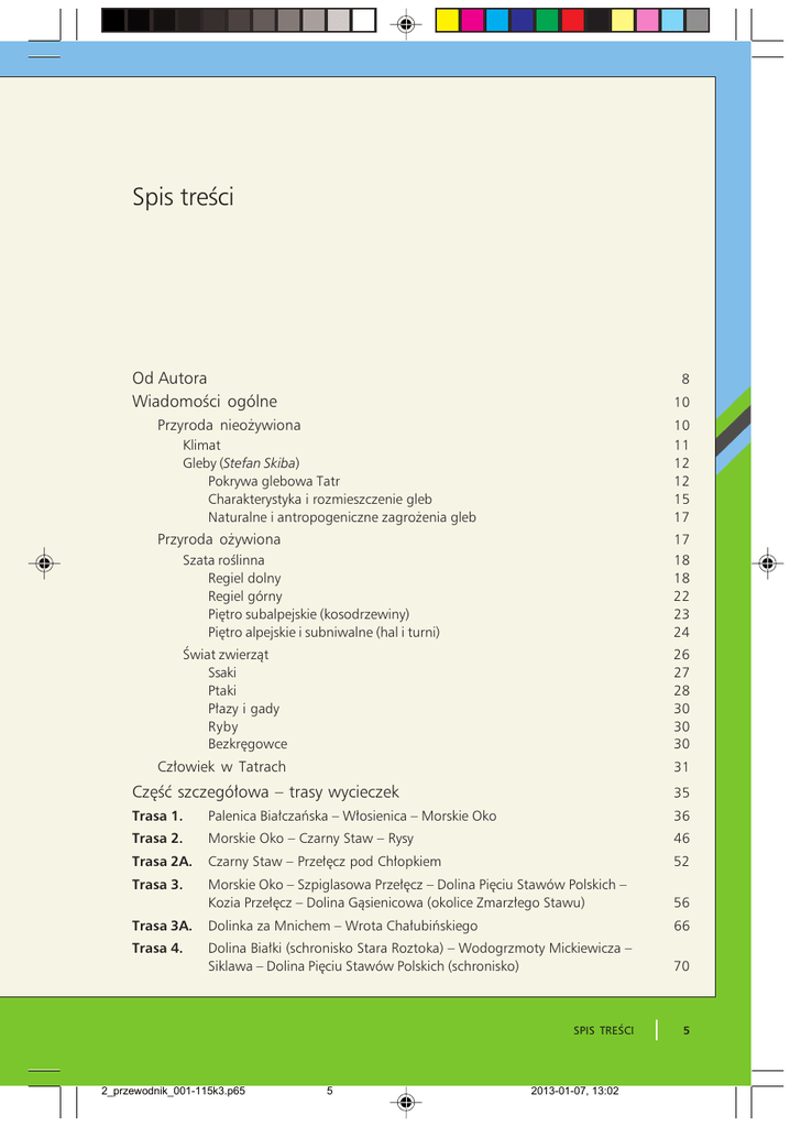 Spis treści Od Autora Wiadomości ogólne 8 10 Przyroda nieożywiona 10 Klimat Gleby (Stefan Skiba) Pokrywa glebowa Tatr Charakterystyka i rozmieszczenie gleb Naturalne i antropogeniczne zagrożenia gleb 11 12 12 15 17 Przyroda ożywiona 17 Szata roślinna Regiel dolny Regiel górny Piętro subalpejskie (kosodrzewiny) Piętro alpejskie i subniwalne (hal i turni) 18 18 22 23 24 Świat zwierząt Ssaki Ptaki Płazy i gady Ryby Bezkręgowce 26 27 28 30 30 30 Człowiek w Tatrach 31 Część szczegółowa – trasy wycieczek 35 Trasa 1. Palenica Białczańska – Włosienica – Morskie Oko 36 Trasa 2. Morskie Oko – Czarny Staw – Rysy 46 Trasa 2A. Czarny Staw – Przełęcz pod Chłopkiem 52 Trasa 3. Morskie Oko – Szpiglasowa Przełęcz – Dolina Pięciu Stawów Polskich – Kozia Przełęcz – Dolina Gąsienicowa (okolice Zmarzłego Stawu) 56 Trasa 3A. Dolinka za Mnichem – Wrota Chałubińskiego 66 Trasa 4. Dolina Białki (schronisko Stara Roztoka) – Wodogrzmoty Mickiewicza – Siklawa – Dolina Pięciu Stawów Polskich (schronisko) 70 SPIS TREŚCI 5 2_przewodnik_001-115k3.p65 5 2013-01-07, 13:02 Trasa 5. Dolina Pięciu Stawów Polskich (schronisko) – Świstówka Roztocka – Dolina Rybiego Potoku (Morskie Oko) 76 Trasa 6. Zazadnia – Rusinowa Polana – Dolina Białki (Palenica Białczańska) 80 Trasa 7. Wierch Poroniec – Rusinowa Polana – Gęsia Szyja – Dolina Gąsienicowa (schronisko Murowaniec) 86 Trasa 8. Toporowa Cyrhla – Dolina Suchej Wody (Psia Trawka) – Rówień Waksmundzka – Dolina Białki (Wodogrzmoty Mickiewicza) 96 Trasa 9. Dolina Gąsienicowa (schronisko Murowaniec) – Krzyżne – Dolina Pięciu Stawów Polskich 104 Trasa 10. Brzeziny – Dolina Gąsienicowa (schronisko Murowaniec) 110 Trasa 11. Dolina Olczyska – Wielki Kopieniec – Toporowa Cyrhla 116 Trasa 11A. Dolina Olczyska (Polana Olczyska) – Nosal – Dolina Bystrej (Kuźnice) 122 Trasa 12. Kuźnice – Boczań – Przełęcz między Kopami – Dolina Gąsienicowa (schronisko Murowaniec) – Zawrat – Dolina Pięciu Stawów Polskich (schronisko) 128 Trasa 12A. Kuźnice – dolina Jaworzynka – Przełęcz między Kopami 138 Trasa 12B. Czarny Staw Gąsienicowy – Karb – Kościelec 142 Trasa 12C. Czarny Staw Gąsienicowy – Skrajny Granat 146 Trasa 12D. Zawrat – Kozi Wierch – Granaty – Krzyżne 148 Trasa 13. Dolina Gąsienicowa (schronisko Murowaniec) – Kasprowy Wierch 150 Trasa 13A. Dolina Gąsienicowa – Przełęcz Świnicka 156 Trasa 13B. Dolina Gąsienicowa – Liliowe 158 Trasa 14. Kuźnice – Myślenickie Turnie – Kasprowy Wierch 160 Trasa 15. Kasprowy Wierch – Świnica – Zawrat 166 Trasa 16. Kasprowy Wierch – Ciemniak 172 Trasa 17. Dolina Bystrej (Kuźnice) – Giewont 178 Trasa 17A. Polana Kondratowa – Przełęcz pod Kopą Kondracką 186 Trasa 18. 190 Droga pod Reglami – od Kuźnic do Doliny Chochołowskiej Trasa 18A. Dolina ku Dziurze 202 Trasa 18B. Dolina za Bramką 204 Trasa 18C. Nędzówka – Staników Żleb – Przysłop Miętusi 208 Trasa 18D. Dolina Lejowa – Niżnia Kominiarska Polana 212 Trasa 19. 214 Dolina Strążyska – Sarnia Skała – Dolina Białego Trasa 19A. Dolina Białego – Kalatówki Trasa 20. 230 Dolina Strążyska (Polana Strążyska) – Grzybowiec – Wyżnia Kondracka Przełęcz 234 Trasa 20A. Przełęcz w Grzybowcu – Dolina Małej Łąki (Wielka Polana Małołącka) 240 Trasa 21. 242 Dolina Małej Łąki – Kondracka Przełęcz – Kopa Kondracka Trasa 21A. Dolina Małej Łąki (Wielka Polana Małołącka) – Przysłop Miętusi 252 Trasa 22. 254 Dolina Małej Łąki (Rapasiowa Turnia) – Przysłop Miętusi – Małołączniak 6 2_przewodnik_001-115k3.p65 6 2013-01-07, 13:02 Trasa 23. Dolina Kościeliska – Adamica – Chuda Przełączka – Ciemniak Trasa 24. Kiry – Dolina Kościeliska – schronisko Ornak 262 270 Trasa 24A. Przysłop Miętusi 282 Trasa 24B. Jaskinia Mroźna 284 Trasa 24C. Polana na Stołach 288 Trasa 24D. Wąwóz Kraków – Smocza Jama – Wyżnia Polana Pisana 292 Trasa 24E. Jaskinie: Raptawicka, Obłazkowa i Mylna 298 Trasa 24F. Smreczyński Staw 302 Trasa 25. Dolina Tomanowa – Chuda Przełączka 304 Trasa 26. Dolina Kościeliska (schronisko Ornak) – Przełęcz Iwaniacka – Ornak – Siwa Przełęcz – Starorobociański Wierch 310 Trasa 27. Siwa Polana – Dolina Chochołowska – Grześ – Rakoń – Wołowiec 316 Trasa 27A. Ścieżka nad Reglami: Dolina Chochołowska – Dolina Kościeliska 325 Trasa 27B. Dolina Chochołowska (ujście Potoku Starorobociańskiego) – Iwaniacka Przełęcz 328 Trasa 27C. Dolina Starorobociańska (Polana Iwanówka) – Siwa Przełęcz 332 Trasa 27D. Polana Trzydniówka – Trzydniowiański Wierch 334 Trasa 27E. Polana Chochołowska – Dolina Jarząbcza – Trzydniowiański Wierch – Kończysty Wierch 336 Trasa 27F. Polana Chochołowska – Dolina Wyżnia Chochołowska – Przełęcz pod Wołowcem 340 Trasa 28. Wołowiec – Jarząbczy Wierch – Kończysty Wierch – Starorobociański Wierch Literatura 342 346 Atlas roślin 351 Wykaz ramek tematycznych 404 Skorowidz nazw organizmów żywych 408 Autorzy zdjęć 422 SPIS TREŚCI 2_przewodnik_001-115k3.p65 7 2013-01-07, 13:02 7