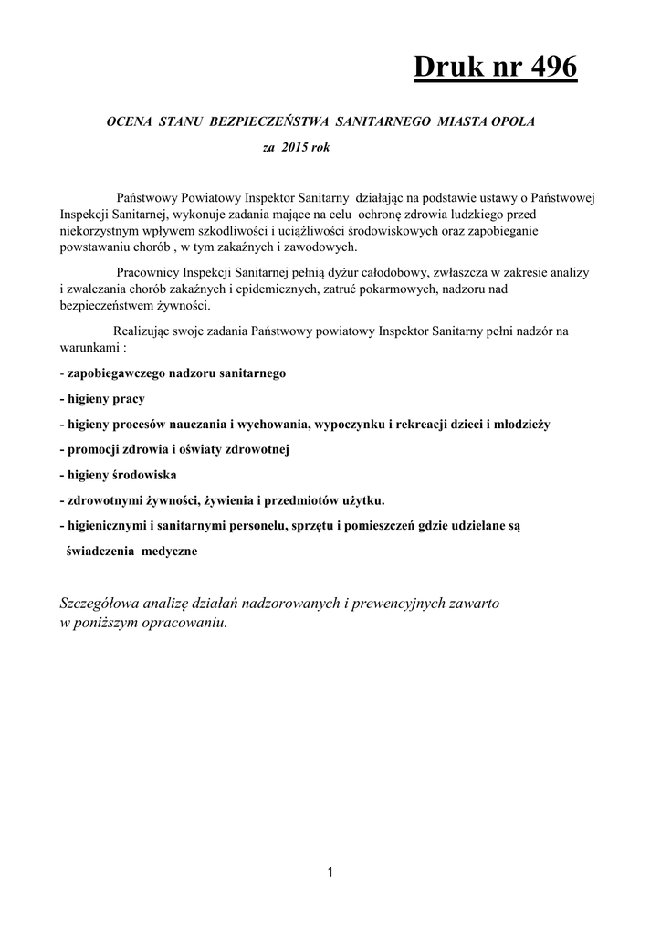 Druk nr 496 OCENA STANU BEZPIECZEŃSTWA SANITARNEGO MIASTA OPOLA za 2015 rok Państwowy Powiatowy Inspektor Sanitarny działając na podstawie ustawy o Państwowej Inspekcji Sanitarnej, wykonuje zadania mające na celu ochronę zdrowia ludzkiego przed niekorzystnym wpływem szkodliwości i uciążliwości środowiskowych oraz zapobieganie powstawaniu chorób , w tym zakaźnych i zawodowych. Pracownicy Inspekcji Sanitarnej pełnią dyżur całodobowy, zwłaszcza w zakresie analizy i zwalczania chorób zakaźnych i epidemicznych, zatruć pokarmowych, nadzoru nad bezpieczeństwem żywności. Realizując swoje zadania Państwowy powiatowy Inspektor Sanitarny pełni nadzór na warunkami : - zapobiegawczego nadzoru sanitarnego - higieny pracy - higieny procesów nauczania i wychowania, wypoczynku i rekreacji dzieci i młodzieży - promocji zdrowia i oświaty zdrowotnej - higieny środowiska - zdrowotnymi żywności, żywienia i przedmiotów użytku. - higienicznymi i sanitarnymi personelu, sprzętu i pomieszczeń gdzie udzielane są świadczenia medyczne Szczegółowa analizę działań nadzorowanych i prewencyjnych zawarto w poniższym opracowaniu. 1 SEKCJA ZAPOBIEGAWCZEGO NADZORU SANITARNEGO I. Główne kierunki działania : Zapobiegawczy Nadzór Sanitarny na podstawie art. 3 i art. 23 Ustawy z dnia 14 marca 1985 r. o Państwowej Inspekcji Sanitarnej (Dz. U. z 2015r., poz. 1412), posiada kompetencje do wykonywania następujących zadań : ● wnoszenia uwag do projektów miejscowych planów zagospodarowania przestrzennego, a także ustalania warunków zabudowy i lokalizacji celu publicznego, ● opiniowanie projektów uchwał Rad Miast i Gmin w sprawie miejscowych planów zagospodarowania przestrzennego, ● uzgadniania dokumentacji projektowej pod względem wymagań higienicznych i zdrowotnych dotyczących budowy (przebudowy, rozbudowy ),zmiany sposobu użytkowania obiektów oraz rozwiązań projektowych koncepcyjnych, ● uczestniczenia w dopuszczeniu do użytku obiektów budowlanych oraz kontroli w trakcie realizacji inwestycji. Ponadto, zgodnie z ustawą z dnia 3 października 2008r. o udostępnianiu informacji o środowisku i jego ochronie, udziale społeczeństwa w ochronie środowiska oraz ocenach oddziaływania na środowisko (Dz.U. z 2013r., poz. 1235 z późn. zm.) uczestniczono przy: ● wydawaniu opinii co do potrzeby przeprowadzenia oceny oddziaływania przedsięwzięcia na środowisko oraz ustalania zakresu raportu, ● uzgadnianiu uwarunkowań środowiskowych przed wydaniem decyzji o środowiskowych uwarunkowaniach zgody na realizację przedsięwzięcia, ● uzgodnienia zakresu i stopnia szczegółowości informacji wymaganych w prognozie oddziaływania na środowisko. 2 II. Realizacja zadań w 2015r. dotyczących miasta Opola realizacja zadań w latach 2014-2015 nazwa działania z zakresu zapobiegawczego nadzoru sanitarnego lp. 1 liczba spraw w obszarze miasta Opole 2014 2015 wydano opinie sanitarne w formie pisma dotyczące : a/ b/ stanowiska w sprawie dopuszczenia do użytkowania obiektu budowlanego w związku z art.56 Ustawy Prawo budowlane (Dz. U. z 2013r., poz. 1409 z późn. zm.) stanowiska w sprawie dopuszczenia do użytkowania obiektu budowlanego w związku z art.56 Ustawy Prawo budowlane (Dz. U. z 2013r., poz. 1409 z późn. zm.) - tzw. "milczące zgody" 45 57 32 22 c/ ustaleń z kontroli obiektu z art..3 pkt.3 Ustawy o Państwowej Inspekcji Sanitarnej (Dz.U z 2015r. poz.1412) 0 0 d/ opinie sanitarne o dokumentacji projektowej, koncepcjach itp.. 10 8 e/ uzgodnienie zakresu i stopnia szczegółowości informacji wymaganych w prognozie oddziaływania na środowisko 7 12 f/ uzgodnienie dot. odstąpienia od przeprowadzenia strategicznej oceny oddziaływania na środowisko 0 1 21 20 0 0 8 11 0 0 4 12 0 0 0 0 g/ h/ i/ j/ k/ l/ ł/ opinii co do potrzeby przeprowadzania oceny oddziaływania przedsięwzięcia na środowisko , a w przypadku stwierdzenia takiej potrzeby - co do zakresu raportu o oddziaływaniu przedsięwzięcia na środowisko opinie przed wydaniem postanowienia przez regionalnego dyrektora ochrony środowiska w sprawie uzgodnienia warunków realizacji przedsięwzięcia opinii przed wydaniem decyzji o środowiskowych uwarunkowaniach Opinie w zakresie raportu o oddziaływaniu przedsięwzięcia na środowisko opinie o projektach planów zagospodarowania przestrzennego wnioski do miejscowych planów zagospodarowania przestrzennego opinie o projektach studium uwarukowań 3 i/ opinii przed wydaniem decyzji o środowiskowych uwarunkowaniach j/ Opinie w zakresie raportu o oddziaływaniu przedsięwzięcia na środowisko k/ opinie o projektach planów zagospodarowania przestrzennego l/ wnioski do miejscowych planów zagospodarowania przestrzennego ł/ opinie o projektach studium uwarukowań miasto Opole 2015 h/ opinie przed wydaniem postanowienia przez regionalnego dyrektora ochrony środowiska w sprawie uzgodnienia… miasto Opole 2014 g/ opinii co do potrzeby przeprowadzania oceny oddziaływania przedsięwzięcia na środowisko , a w przypadku stwierdzenia… 120 f/ uzgodnienie dot. odstąpienia od przeprowadzenia strategicznej oceny oddziaływania na środowisko 100 e/ uzgodnienie zakresu i stopnia szczegółowości informacji wymaganych w prognozie oddziaływania na środowisko 80 d/ opinie sanitarne o dokumentacji projektowej, koncepcjach itp.. 60 c/ ustaleń z kontroli obiektu z art..3 pkt.3 Ustawy o Państwowej Inspekcji Sanitarnej (Dz.U z 2015r. poz.1412) 40 b/ stanowiska w sprawie dopuszczenia do użytkowania obiektu budowlanego w związku z art.56 Ustawy Prawo budowlane (Dz.… 20 0 a/ 4 Wykres nr 1.: Wydane opinie w formie pisma stanowiska w sprawie dopuszczenia do użytkowania obiektu budowlanego w związku z art.56 Ustawy Prawo budowlane (Dz.… 2 wydano uzgodnienia w formie decyzji a/ odstępstwa, zgody wydane na podstawie obowiązujących przepisów 4 1 odstępstwa, zgody wydane na podstawie obowiązujących przepisów 5 4 3 2 1 0 4 1 2014 2015 miasto Opol