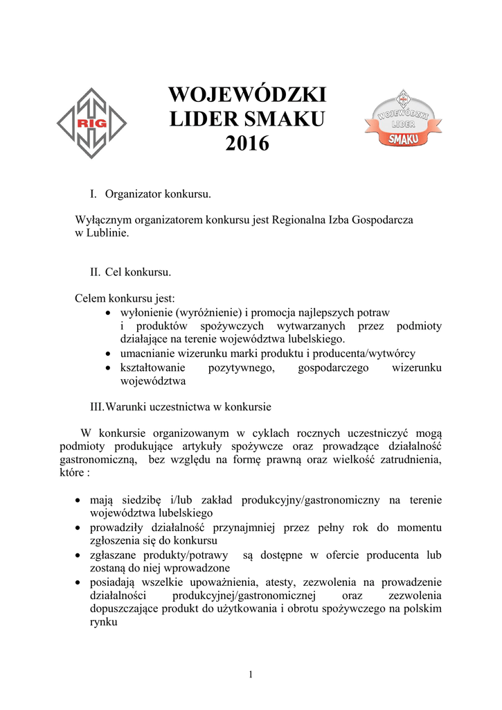 WOJEWÓDZKI LIDER SMAKU 2016 I. Organizator konkursu. Wyłącznym organizatorem konkursu jest Regionalna Izba Gospodarcza w Lublinie. II. Cel konkursu. Celem konkursu jest: wyłonienie (wyróżnienie) i promocja najlepszych potraw i produktów spożywczych wytwarzanych przez podmioty działające na terenie województwa lubelskiego. umacnianie wizerunku marki produktu i producenta/wytwórcy kształtowanie pozytywnego, gospodarczego wizerunku województwa III. Warunki uczestnictwa w konkursie W konkursie organizowanym w cyklach rocznych uczestniczyć mogą podmioty produkujące artykuły spożywcze oraz prowadzące działalność gastronomiczną, bez względu na formę prawną oraz wielkość zatrudnienia, które : mają siedzibę i/lub zakład produkcyjny/gastronomiczny na terenie województwa lubelskiego prowadziły działalność przynajmniej przez pełny rok do momentu zgłoszenia się do konkursu zgłaszane produkty/potrawy są dostępne w ofercie producenta lub zostaną do niej wprowadzone posiadają wszelkie upoważnienia, atesty, zezwolenia na prowadzenie działalności produkcyjnej/gastronomicznej oraz zezwolenia dopuszczające produkt do użytkowania i obrotu spożywczego na polskim rynku 1 terminowo złożyły w Sekretariacie konkursu deklarację uczestnictwa wraz z ankietą i kompletem załączników wniosły opłatę konkursową IV. Sekretariat konkursu Sekretariat konkursu mieści się w siedzibie Regionalnej Izby Gospodarczej w Lublinie przy ul. Dolnej 3-go Maja 8/9. Sekretariat pełni funkcje administracyjne związane z prowadzeniem i nadzorem przebiegu konkursu w jego części techniczno-organizacyjnej. V. Kapituła konkursu. 1.Kapitułę konkursu stanowią osoby o stosownej wiedzy merytorycznej, cieszące się autorytetem i powszechnym zaufaniem, zaproszone przez Prezesa Zarządu RIG do udziału w pracach Kapituły, w tym w szczególności eksperci z dziedziny higieny, jakości oraz technologii żywności i żywienia. 2. Kapituła liczy 6-9 osób. 3. Kapitułę powołuje się na każdą edycję konkursu. 4. Na pierwszym posiedzeniu Kapituła wybiera ze swojego składu Przewodniczącego i Wiceprzewodniczącego. 5. Posiedzenia Kapituły zwołuje pisemnie Przewodniczący lub jego Zastępca. Obrady Kapituły są protokołowane. Decyzje podejmowane są w formie uchwał zwykłą większością głosów. W przypadku równej liczby głosów, rozstrzygający jest głos Przewodniczącego posiedzenia. VI. Przebieg konkursu. Konkurs przebiega w dwóch etapach: 1. Etap pierwszy Organizator konkursu ogłasza konkurs, zaprasza podmioty do udziału, udziela wszelkich informacji związanych z konkursem oraz przyjmuje zgłoszenia wraz z kompletami materiałów Kapituła konkursu dokonuje oceny potraw i produktów w oparciu o dostarczone materiały i próbki wyrobów (termin dostarczenia podany będzie z wyprzedzeniem), przyznaje odpowiednie ilości punktów i kwalifikuje je do drugiego etapu 2. Etap drugi Przedstawiciele Kapituły dokonują wizytacji wszystkich podmiotów, których wyroby uzyskały kwalifikację do drugiego etapu, w celu zweryfikowania danych zawartych w ankietach 2 oraz zebrania dodatkowych informacji o produkcie/potrawie i producencie Kapituła konkursu na podstawie raportów z wizytacji, oceny organoleptycznej i ankietowej dokonuje wyboru laureatów konkursu w kategorii produkty i kategorii potrawy – eksperci Kapituły w oparciu o ilość i rodzaj zgłoszonych do konkursu wyrobów mogą dokonać dodatkowych podziałów w ramach kategorii. VII. Terminy organizacji konkursu. 1. Ogłoszenie konkursu i zaproszenie do udziału –sierpień 2016 r. 2. Przyjmowanie zgłoszeń wraz z kompletem materiałówdo 15 września 2016 r. 3. Ustanowienie składu osobowego Kapituły- do 30 września 2016 r. 4. Ocena zgłoszonych wyrobów przez Kapitułę – do 30 listopada 2016 r. 5. Wizytacja podmiotów i ocena wyrobów w ramach drugiego etapu – do 31 grudnia 2016 r. 6.Ogłoszenie wyników konkursu i uroczyste wręczenie nagród –luty/marzec 2017 r. Zarząd Regionalnej Izby Gospodarczej ustala szczegółowy harmonogram dla każdej edycji konkursu. VIII. Opłaty konkursowe Zgodnie z pkt. III regulaminu, warunkiem uczestnictwa w konkursie jest wniesienie opłaty, która uzależniona jest od ilości zatrudnionych pracowników : podmioty zatrudniające do 5 pracowników – 600 zł + VAT podmioty zatrudniające od 6 do 20 pracowników – 1000 zł +VAT podmioty zatrudniające od 21 do 50 pracowników – 1300 zł + VAT podmioty zatrudniające od 51 do 250 pracowników – 1700 zł + VAT podmioty zatrudniające powyżej 250 pracowników – 2300 zł + VAT Drugi i kolejny produkt/potrawa zgłoszona do konkursu podlega opłacie wg powyższych stawek pomniejszonych o 50%. Podmioty, których produkty/potrawy zakwalifikowane zostaną do drugiego etapu wnoszą opłatę 450 zł +VAT. Opłaty dokonywane są przez uczestników w terminie 7 dni od daty wystawienia przez Organizatora faktury VAT. 3 IX. Kryteria weryfikacyjne i punktacja 1. Produkt/Potrawa walory smakowe walory zdrowotne wygląd zewnętrzny postrzeganie produktu/potrawy w regionie 2. Producent wyrobu higiena produkcji i organizacja kontroli jakości wygląd zewnętrzny i estetyka obiektów osiągnięcia producenta X. Nagrody. W poszczególnych kategoriach Kapituła konkursu decyduje o przyznaniu nagród głównych (miejsc) oraz wyróżnień. Jej werdykt jest ostateczny. Kapituła zastrzega sobie prawo przyznania dodatkowych nagród i wyróżnień. XI. Postanowienia końcowe. Podmioty, których produkty/potrawy uczestniczyły w konkursie „Wojewódzki Lider Smaku” mają prawo do wykorzystywania logo konkursu wraz z informacją o zdobytym miejscu/wyróżnieniu z określeniem roku, w którym tytuł i nagroda została przyznana. Podmioty przystępujące do konkursu wyrażają zgodę na udostępnienie Kapitule konkursu wszelkich danych niezbędnych do prawidłowej i obiektywnej oceny. Kapituła konkursu zastrzega sobie prawo cofni