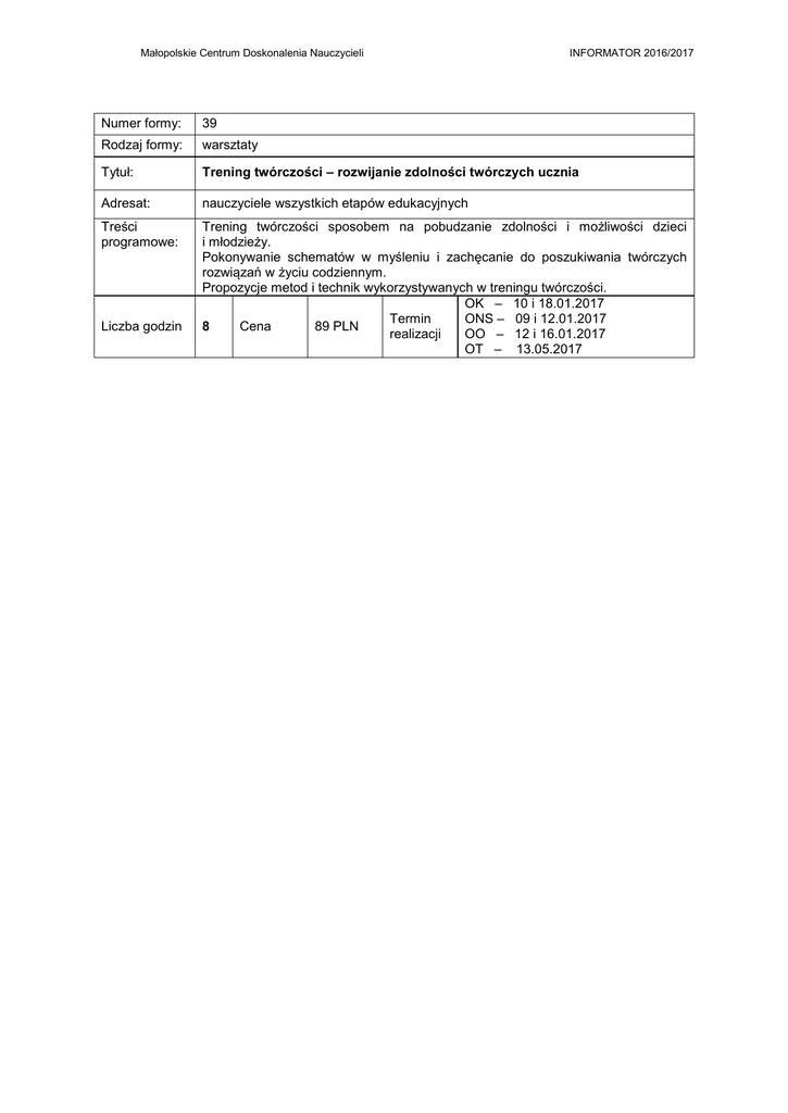 Małopolskie Centrum Doskonalenia Nauczycieli INFORMATOR 2016/2017 Numer formy: 39 Rodzaj formy: warsztaty Tytuł: Trening twórczości – rozwijanie zdolności twórczych ucznia Adresat: nauczyciele wszystkich etapów edukacyjnych Treści programowe: Trening twórczości sposobem na pobudzanie zdolności i możliwości dzieci i młodzieży. Pokonywanie schematów w myśleniu i zachęcanie do poszukiwania twórczych rozwiązań w życiu codziennym. Propozycje metod i technik wykorzystywanych w treningu twórczości. OK – 10 i 18.01.2017 Termin ONS – 09 i 12.01.2017 8 Cena 89 PLN realizacji OO – 12 i 16.01.2017 OT – 13.05.2017 Liczba godzin