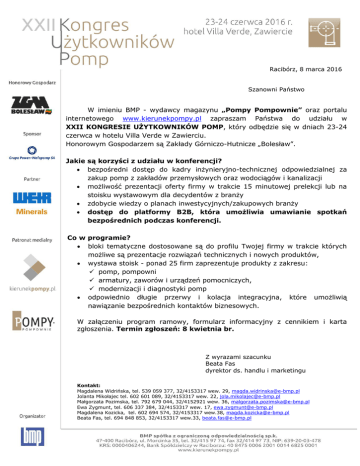 Racibórz, 8 marca 2016 Szanowni Państwo W imieniu BMP - wydawcy magazynu „Pompy Pompownie” oraz portalu internetowego www.kierunekpompy.pl zapraszam Państwa do udziału w XXII KONGRESIE UŻYTKOWNIKÓW POMP, który odbędzie się w dniach 23-24 czerwca w hotelu Villa Verde w Zawierciu. Honorowym Gospodarzem są Zakłady Górniczo-Hutnicze „Bolesław”. Jakie są korzyści z udziału w konferencji? bezpośredni dostęp do kadry inżynieryjno-technicznej odpowiedzialnej za zakup pomp z zakładów przemysłowych oraz wodociągów i kanalizacji możliwość prezentacji oferty firmy w trakcie 15 minutowej prelekcji lub na stoisku wystawowym dla decydentów z branży zdobycie wiedzy o planach inwestycyjnych/zakupowych branży dostęp do platformy B2B, która umożliwia umawianie spotkań bezpośrednich podczas konferencji. Co w programie? bloki tematyczne dostosowane są do profilu Twojej firmy w trakcie których możliwe są prezentacje rozwiązań technicznych i nowych produktów, wystawa stoisk - ponad 25 firm zaprezentuje produkty z zakresu: pomp, pompowni armatury, zaworów i urządzeń pomocniczych, modernizacji i diagnostyki pomp odpowiednio długie przerwy i kolacja integracyjna, które umożliwią nawiązanie bezpośrednich kontaktów biznesowych. W załączeniu program ramowy, formularz informacyjny z cennikiem i karta zgłoszenia. Termin zgłoszeń: 8 kwietnia br. Z wyrazami szacunku Beata Fas dyrektor ds. handlu i marketingu Kontakt: Magdalena Widrińska, tel. 539 059 377, 32/4153317 wew. 29, [email protected] Jolanta Mikołajec tel. 602 601 089, 32/4153317 wew. 22, [email protected] Małgorzata Pozimska, tel. 792 679 044, 32/4152921 wew. 36, [email protected] Ewa Zygmunt, tel. 606 337 384, 32/4153317 wew. 17, [email protected] Magdalena Kozicka, tel. 602 694 574, 32/4153317 wew.38, [email protected] Beata Fas, tel. 694 848 853, 32/4153317 wew.33, [email protected] FORMULARZ INFORMACYJNY I. Sponsor – oferta obejmuje: 1. Przyznanie tytułu sponsora XXII Kongresu Użytkowników Pomp 2. Prezentację firmy do 15 min 3. Pokrycie kosztów udziału dla 2 osób z firmy (wyżywienie, materiały konferencyjne, zakwaterowanie: 1 doba) 4. Wyeksponowanie na zaproszeniach, transparentach i pismach oraz w obiektach, w których będzie przebiegać impreza, nazwy firmy i logo jako sponsora konferencji. 5. Udostępnienie powierzchni wystawienniczej do 8 m2 (zabudowa oktanorm, wyposażenie obejmuje: 3 ścianki pełne, stolik, 4 krzesła, oświetlenie, zasilanie 220V, wykładzinę, fryz z nazwą i logo wystawcy). 6. Reklama A4 w „Pompy Pompownie” 7. Zamieszczenie informacji o firmie w materiałach konferencyjnych (1 strona, wersja czarno-biała). 8. Baner na stronie portalu www.kierunekpompy.pl przez 1 miesiąc. Koszt promocji: 21 000 zł netto II. Partner – oferta obejmuje: 1. Przyznanie tytułu partnera XXII Kongresu Użytkowników Pomp 2. Prezentację firmy do 15 min. 3. Pokrycie kosztów udziału dla 2 osób z firmy (wyżywienie, materiały, zakwaterowanie: 1 doba) 4. Wyeksponowanie na zaproszeniach, plakatach, transparentach i pismach oraz w obiektach, w których będzie przebiegać impreza, nazwy firmy i logo jako partnera. 5. Udostępnienie powierzchni wystawienniczej do 4 m2 (zabudowa oktanorm, wyposażenie obejmuje: 3 ścianki pełne, stolik, 4 krzesła, oświetlenie, zasilanie 220V, wykładzinę, fryz z nazwą i logo wystawcy). 6. Reklama A4 w „Pompy Pompownie” 7. Zamieszczenie informacji o firmie w materiałach konferencyjnych (1 strona, wersja czarno-biała). 8. Baner na stronie portalu www.kierunekpompy.pl przez 1 miesiąc. Koszt promocji: 18 000 zł netto III. Inne formy promocji: a) PAKIET I (stoisko 4 m2 + prezentacja + reklama): 1. Powierzchnia wystawiennicza 4 m2 (zabudowa oktanorm, wyposażenie obejmuje: 3 ścianki pełne, stolik, 2 krzesła, oświetlenie, zasilanie 220V, wykładzinę, fryz z nazwą i logo wystawcy). 2. Prezentacja firmy do 15 min. 3. Reklama A4 w „Pompy Pompownie” 4. Baner środkowy na portalu www.kierunekpompy.pl 5. Zamieszczenie informacji o firmie w materiałach konferencyjnych (1 strona, wersja czarno-biała). Koszt: 8 900 zł netto b) PAKIET II (stoisko 2 m2 + prezentacja + reklama): 1. Powierzchnia wystawiennicza 2m2 (zabudowa oktanorm, wyposażenie obejmuje: 3 ścianki pełne, stolik, 2 krzesła, oświetlenie, zasilanie 220V, wykładzinę, fryz z nazwą i logo wystawcy). 2. Prezentacja firmy do 15 min. 3. Reklama A4 w „Pompy Pompownie” 4. Baner środkowy na portalu www.kierunekpompy.pl 5. Zamieszczenie informacji o firmie w materiałach konferencyjnych (1 strona, wersja czarno-biała). Koszt: 7 900 zł netto c) PAKIET III (prezentacja + reklama): 1. Prezentacja firmy do 15 min. 2. Baner środkowy na portalu www.kierunekpompy.pl 3. Zamieszczenie informacji o firmie w materiałach konferencyjnych (1 strona, wersja czarno-biała). 4. Reklama A4 w „Pompy Pompownie” Koszt: 5 500 zł netto d) PAKIET IV (prezentacja): 1. Prezentacja firmy do 15 min. 2. Baner środkowy na portalu www.kierunekpompy.pl 3. Zamieszczenie informacji o firmie w materiałach konferencyjnych (1 strona, wersja czarno-biała). Koszt: 3 100 zł netto e) PAKIET V (stoisko 4 m2 +reklama): 1. Powierzchnia wystawiennicza 4m2 (zabudowa oktanorm, wyposażenie obejmuje: 3 ścianki pełne, stolik, 2 krzesła, oświetlenie, zasilanie 220V, wykładzinę, fryz z nazwą i logo wystawcy). 2. Reklama A4 w „Pompy Pompownie” 3. Baner środkowy na portalu www.kierunekpompy.pl 4. Zamieszczenie informacji o firmie w materiałach konferencyjnych (1 strona, wersja czarno-biała). Koszt: 6 200 zł netto f) PAKIET VI (stoisko 2 m2 +reklama): 1. Powierzchnia wystawiennicza 2m2 (zabudowa oktanorm, wyposażenie obejmuje: 3 ścianki pełne, stolik, 2 krzesła, oświetlenie, zasilanie 220V, wykładzinę, fryz z nazwą i logo wystawcy). 2. Reklama A4 w „Pompy Pompownie” 3. Baner środkowy na portalu www.kierunekpompy.pl 4. Zamieszczenie informacji o firmie w materiałach konferency