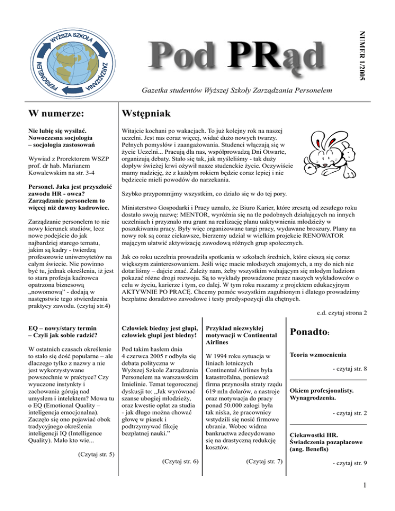 NUMER 1/2005 Gazetka studentów Wyższej Szkoły Zarządzania Personelem W numerze: Wstępniak Nie lubię się wysilać. Nowoczesna socjologia – socjologia zastosowań Witajcie kochani po wakacjach. To już kolejny rok na naszej uczelni. Jest nas coraz więcej, widać dużo nowych twarzy. Pełnych pomysłów i zaangażowania. Studenci włączają się w życie Uczelni... Pracują dla nas, współprowadzą Dni Otwarte, organizują debaty. Stało się tak, jak myśleliśmy - tak duży dopływ świeżej krwi ożywił nasze studenckie życie. Oczywiście mamy nadzieję, że z każdym rokiem będzie coraz lepiej i nie będziecie mieli powodów do narzekania. Wywiad z Prorektorem WSZP prof. dr hab. Marianem Kowalewskim na str. 3-4 Personel. Jaka jest przyszłość zawodu HR - owca? Zarządzanie personelem to więcej niż dawny kadrowiec. Zarządzanie personelem to nie nowy kierunek studiów, lecz nowe podejście do jak najbardziej starego tematu, jakim są kadry - twierdzą profesorowie uniwersytetów na całym świecie. Nie powinno być tu, jednak określenia, iż jest to stara profesja kadrowca opatrzona biznesową „nowomową” - dodają w następstwie tego stwierdzenia praktycy zawodu. (czytaj str.4) Szybko przypomnijmy wszystkim, co działo się w do tej pory. Ministerstwo Gospodarki i Pracy uznało, że Biuro Karier, które zresztą od zeszłego roku dostało swoją nazwę: MENTOR, wyróżnia się na tle podobnych działających na innych uczelniach i przyznało mu grant na realizację planu uaktywnienia młodzieży w poszukiwaniu pracy. Były więc organizowane targi pracy, wydawane broszury. Plany na nowy rok są coraz ciekawsze, bierzemy udział w wielkim projekcie RENOWATOR mającym ułatwić aktywizację zawodową różnych grup społecznych. Jak co roku uczelnia prowadziła spotkania w szkołach średnich, które cieszą się coraz większym zainteresowaniem. Jeśli więc macie młodszych znajomych, a my do nich nie dotarliśmy – dajcie znać. Zależy nam, żeby wszystkim wahającym się młodym ludziom pokazać różne drogi rozwoju. Są to wykłady prowadzone przez naszych wykładowców o celu w życiu, karierze i tym, co dalej. W tym roku ruszamy z projektem edukacyjnym AKTYWNIE PO PRACĘ. Chcemy pomóc wszystkim zagubionym i dlatego prowadzimy bezpłatne doradztwo zawodowe i testy predyspozycji dla chętnych. c.d. czytaj strona 2 EQ – nowy/stary termin – Czyli jak sobie radzić? Człowiek biedny jest głupi, człowiek głupi jest biedny! W ostatnich czasach określenie to stało się dość popularne – ale dlaczego tylko z nazwy a nie jest wykorzystywane powszechnie w praktyce? Czy wyuczone instynkty i zachowania górują nad umysłem i intelektem? Mowa tu o EQ (Emotional Quality – inteligencja emocjonalna). Zaczęło się ono pojawiać obok tradycyjnego określenia inteligencji IQ (Intelligence Quality). Mało kto wie... Pod takim hasłem dnia 4 czerwca 2005 r odbyła się debata polityczna w Wyższej Szkole Zarządzania Personelem na warszawskim Imielinie. Temat tegorocznej dyskusji to: „Jak wyrównać szanse ubogiej młodzieży, oraz kwestie opłat za studia - jak długo można chować głowę w piasek i podtrzymywać fikcję bezpłatnej nauki.” Przykład niezwykłej motywacji w Continental Airlines Ponadto: W 1994 roku sytuacja w liniach lotniczych Continental Airlines była katastrofalna, ponieważ firma przynosiła straty rzędu 619 mln dolarów, a nastroje oraz motywacja do pracy ponad 50.000 załogi była tak niska, że pracownicy wstydzili się nosić firmowe ubrania. Wobec widma bankructwa zdecydowano się na drastyczną redukcję kosztów. Teoria wzmocnienia (Czytaj str. 5) (Czytaj str. 6) (Czytaj str. 7) - czytaj str. 8 Okiem profesjonalisty. Wynagrodzenia. - czytaj str. 2 Ciekawostki HR. Świadczenia pozapłacowe (ang. Benefis) - czytaj str. 9 1 Wstępniak c.d. Po raz pierwszy w historii uczelni – i na pewno nie po raz ostatni, zostały przeprowadzone w zeszłym roku otrzęsiny. To była naprawdę fajna, integracyjna impreza, która tworzy życie studenckie – kto nie był niech żałuje. Pod koniec października organizujemy następną – ZAPRASZAMY ABSOLUTNIE WSZYSTKICH. W końcu studia, to najpiękniejszy okres w życiu, i oprócz intensywnej pracy, która Was czeka, warto odrobinę poszaleć. Poniżej przedstawiamy Wam podsumowanie działalności pozadukacyjnej z całego roku. ZREALIZOWALIŚMY: −Program Aktywizacji Zawodowej Absolwentów „PIERWSZA PRACA”, na podstawie grantu Ministerstwa Gospodarki i Pracy; −Warsztaty w zakresie technik aktywnego poszukiwania pracy lub samozatrudnienia; −Publikacja poradników: o„Doskonalenie umiejętności przywódczych”, o„Drogi Rozwoju Zawodowego. Czyli jak być skutecznym na rynku pracy?” o„Mój własny biznes” −II Warszawskie Dni Promocji Przedsiębiorczości; −Program podnoszenia kwalifikacji zawodowych osób bezrobotnych; −Cykl „Szkoła Dobrej Praktyki Doradztwa Zawodowego”; −Konferencję „Perspektywy dla doradztwa zawodowego – wymiar lokalny i globalny”; −Targi Pracy w Polsce i Unii Europejskiej - z Forum Turystyki Biznesowej, −Cykl szkoleń dla doradców zawodowych z komunikacji interpersonalnej; −Autorski test cech osobowościowych pomagający określić predyspozycje zawodowe; −Projekt Edukacyjny, skierowany do uczniów szkół średnich oraz pedagogów: −Warsztaty nt. „Organizacja zajęć na temat planowania karier dla uczniów szkół średnich”. −Wykłady nt. „Planowanie własnego rozwoju zawodowego w oparciu o talenty”, −Konkurs dla uczniów klas maturalnych „INDEKS ZA ESEJ!”. −Cykl otwartych warsztatów nt. umiejętności pisania cv, rozmowy kwalifikacyjnej, sztuki autoprezentacji, spotkania z psychologami oraz doradcami zawodowymi, rozmowy z przedstawicielami różnych zawodów. Na koniec wstępniaka mała prośba redakcji. Wszystkich zainteresowanych współpracą z „Pod PRąd” zapraszamy. Zależy nam na Waszych tekst