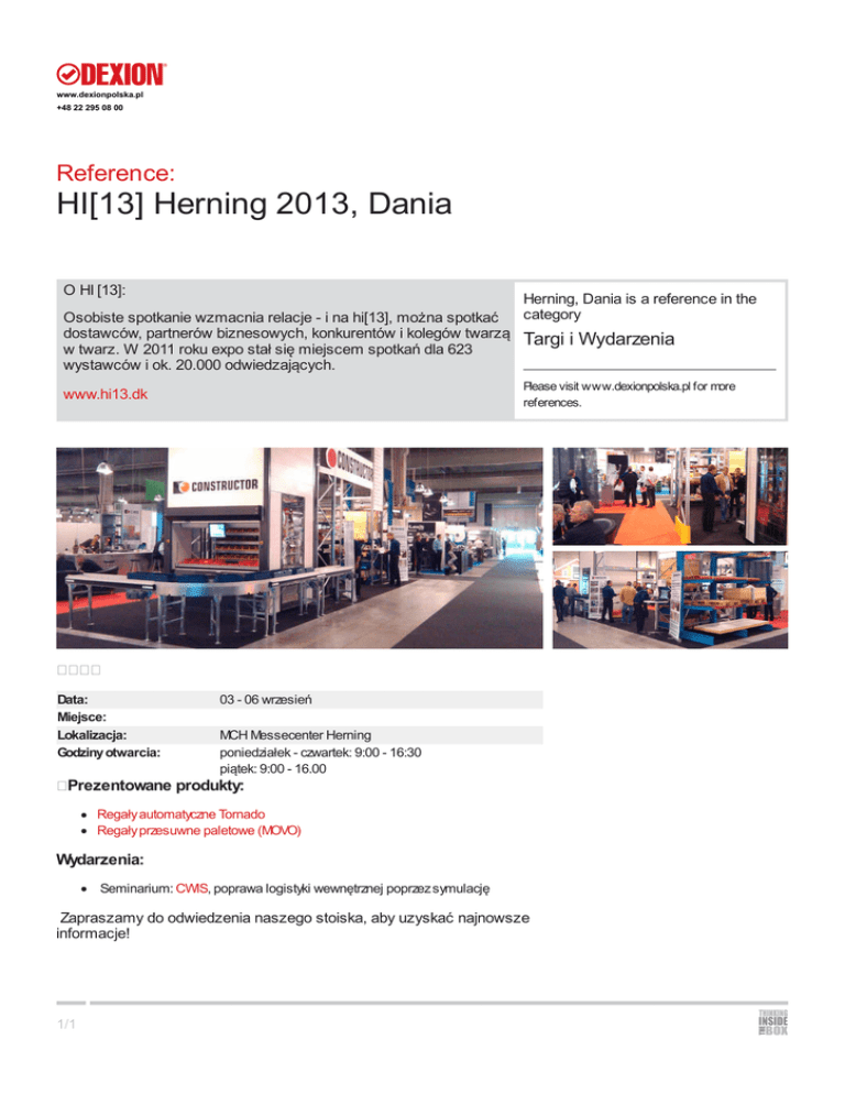 www.dexionpolska.pl +48 22 295 08 00 Reference: HI[13] Herning 2013, Dania O HI [13]: Osobiste spotkanie wzmacnia relacje - i na hi[13], można spotkać dostawców, partnerów biznesowych, konkurentów i kolegów twarzą w twarz. W 2011 roku expo stał się miejscem spotkań dla 623 wystawców i ok. 20.000 odwiedzających. Targi i Wydarzenia Please visit www.dexionpolska.pl for more references. www.hi13.dk Data: Miejsce: Lokalizacja: Godziny otwarcia: Herning, Dania is a reference in the category 03 - 06 wrzesień MCH Messecenter Herning poniedziałek - czwartek: 9:00 - 16:30 piątek: 9:00 - 16.00 Prezentowane produkty: Regały automatyczne Tornado Regały przesuwne paletowe (MOVO) Wydarzenia: Seminarium: CWIS, poprawa logistyki wewnętrznej poprzez symulację Zapraszamy do odwiedzenia naszego stoiska, aby uzyskać najnowsze informacje! 1/1